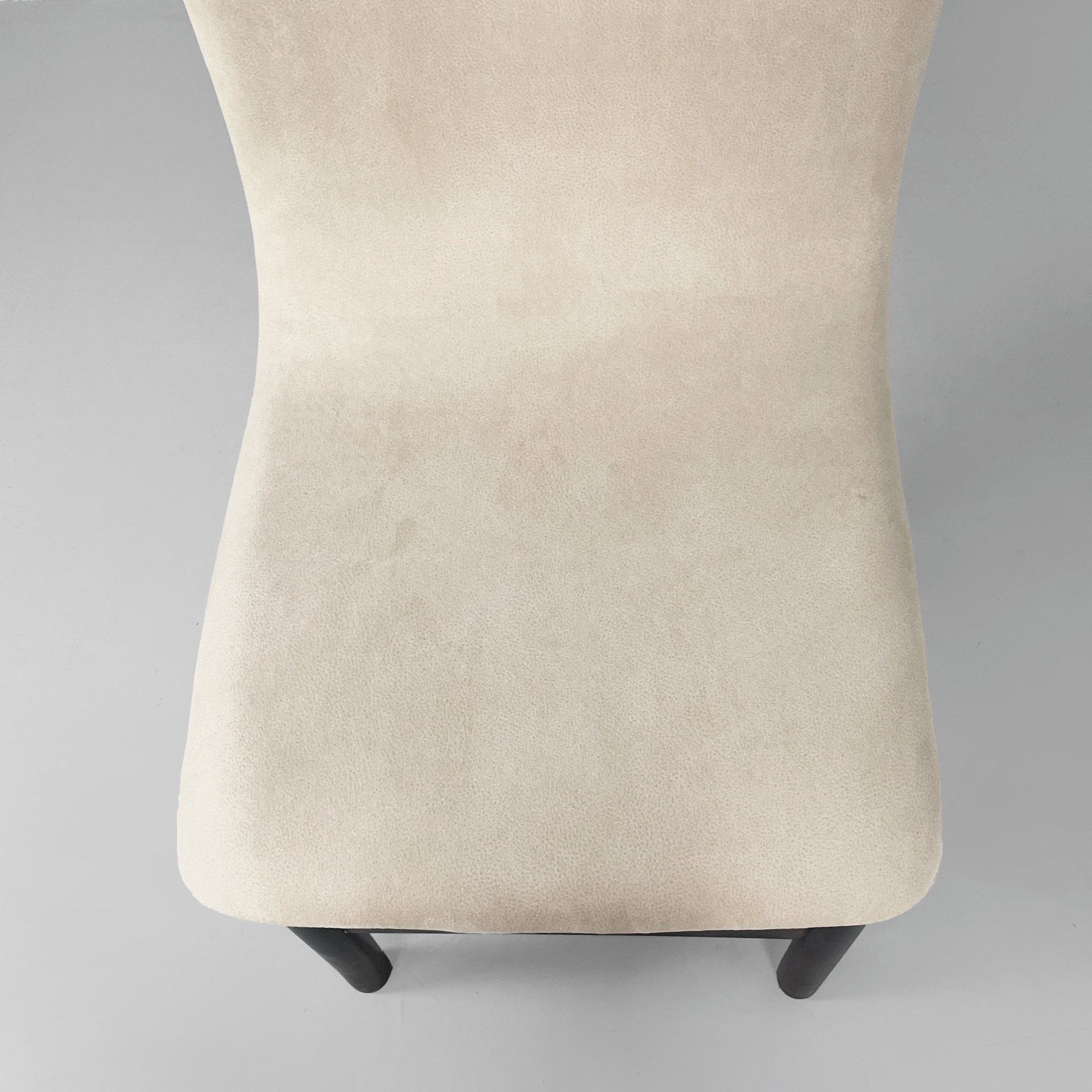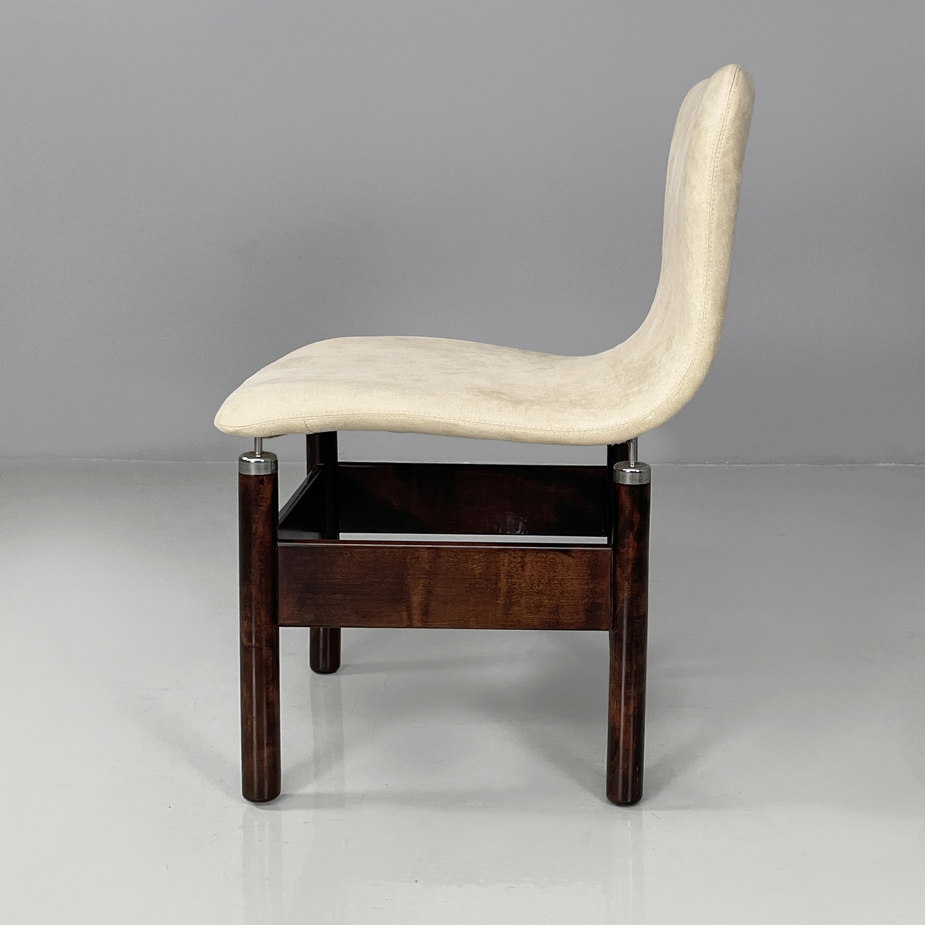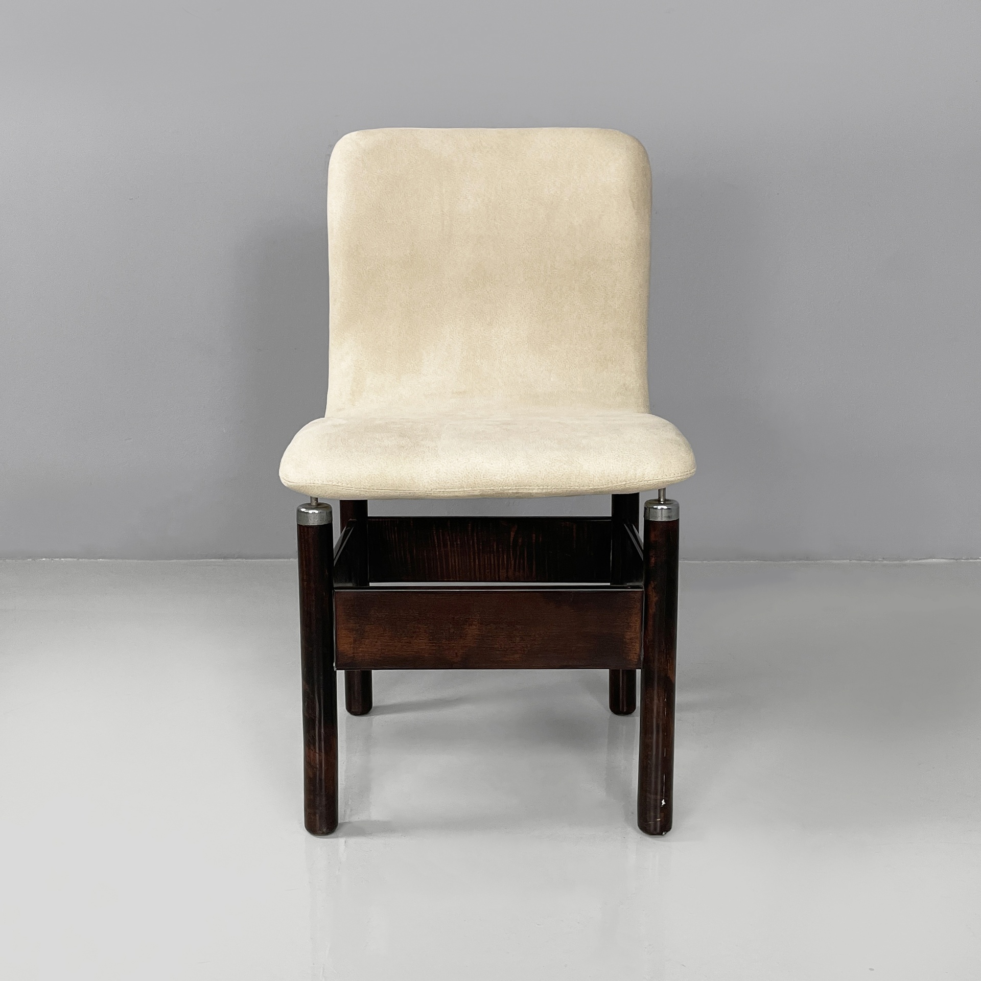 Set di sei sedie modello Chelsea con seduta e schienale sagomati, imbottiti e rivestiti in sky bianco. Le zampe a sezione tonda in legno presentano puntali in metallo cromato sotto la seduta e listelli in legno ad unirle.