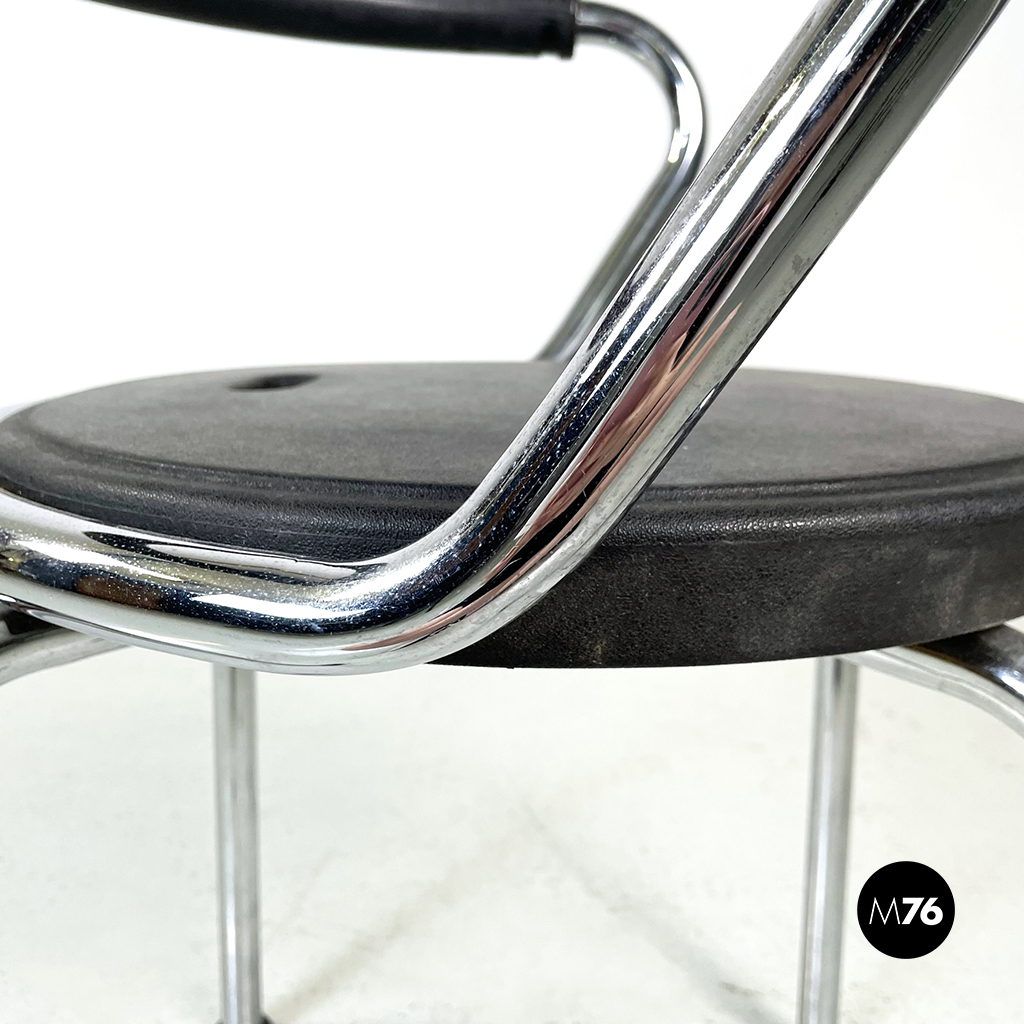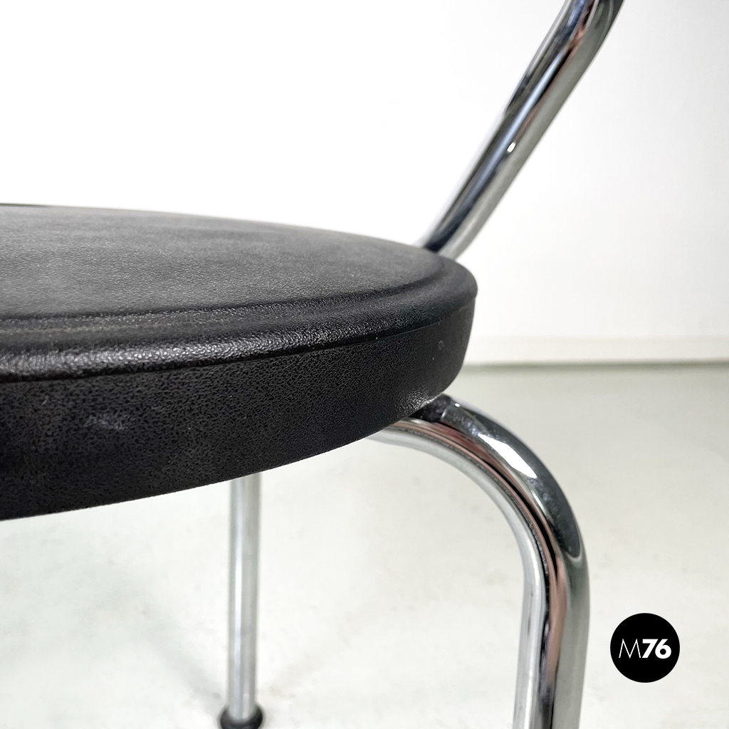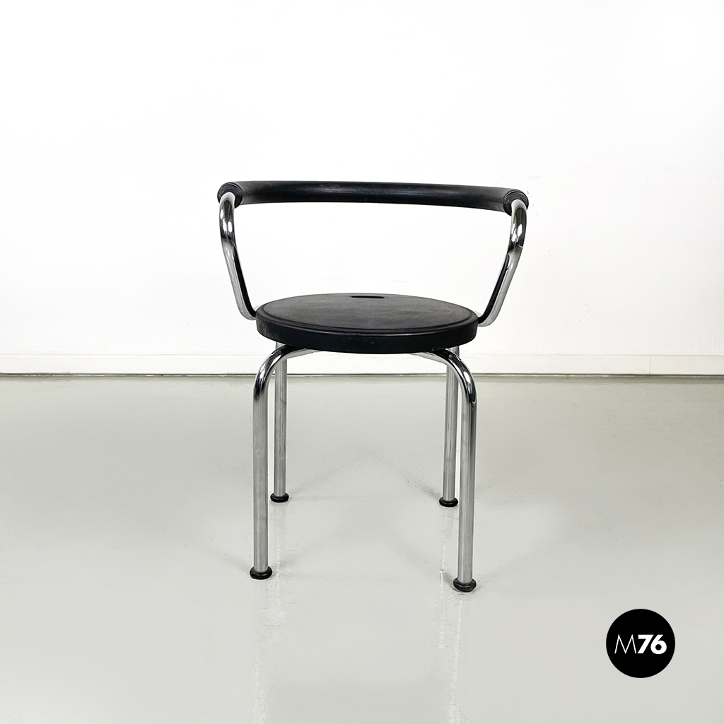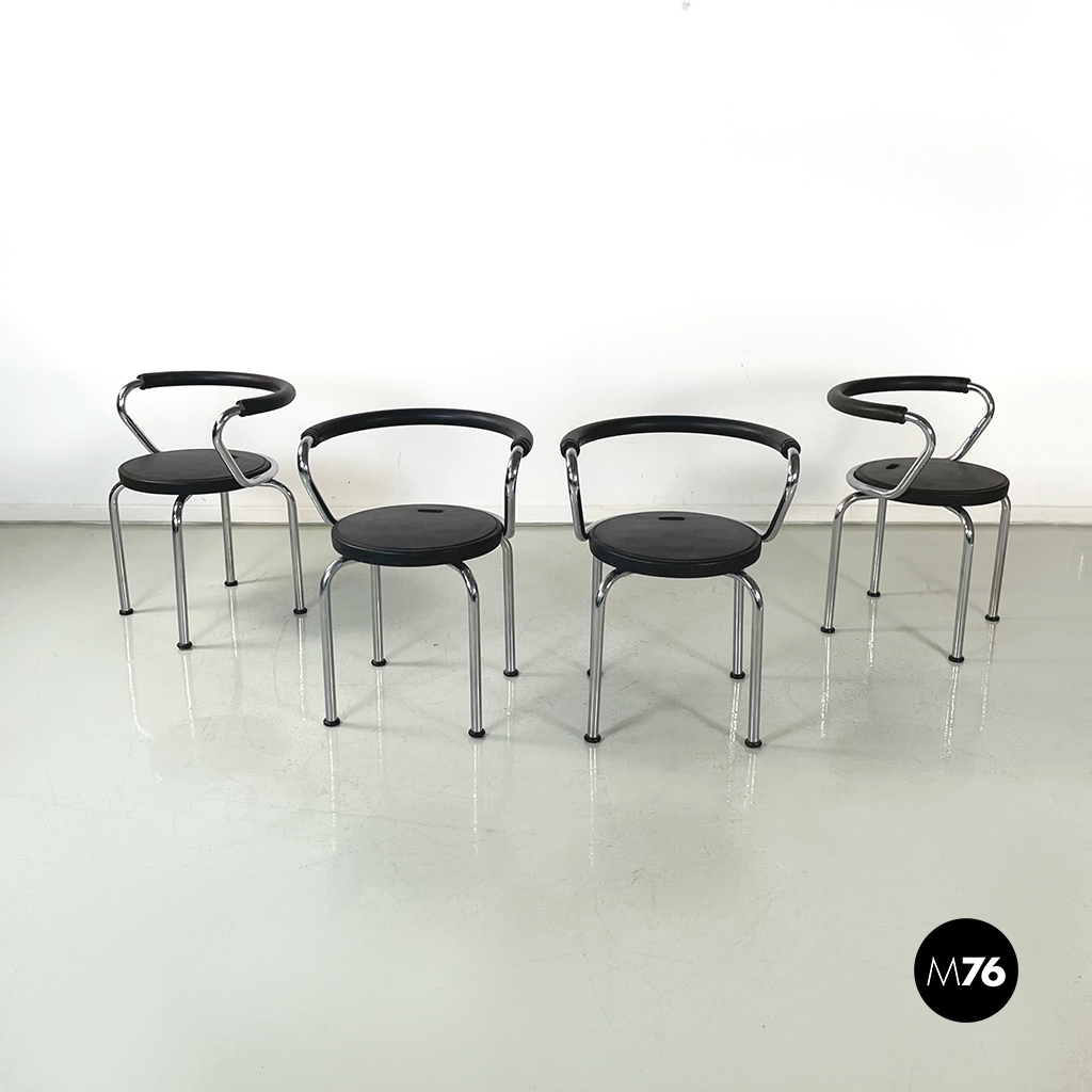 Set di quattro sedie con la seduta tonda in gomma nera. Lo schienale è in tubolare di metallo rivestito in gomma nera. Alla base della sedia presenta le zampe in tubolare di metallo con piedini tondi in gomma nera.
