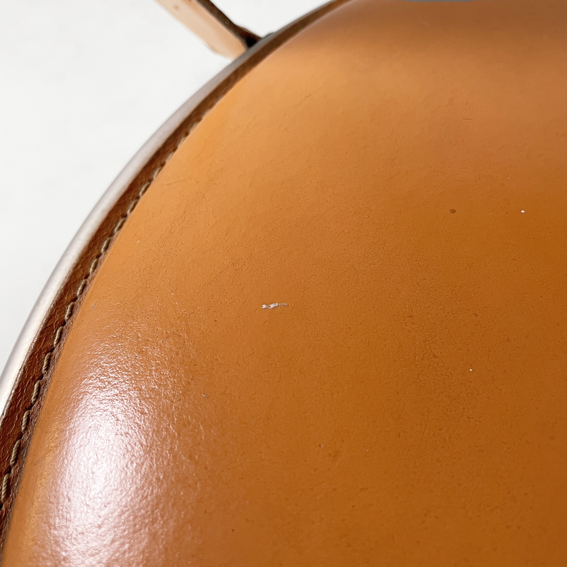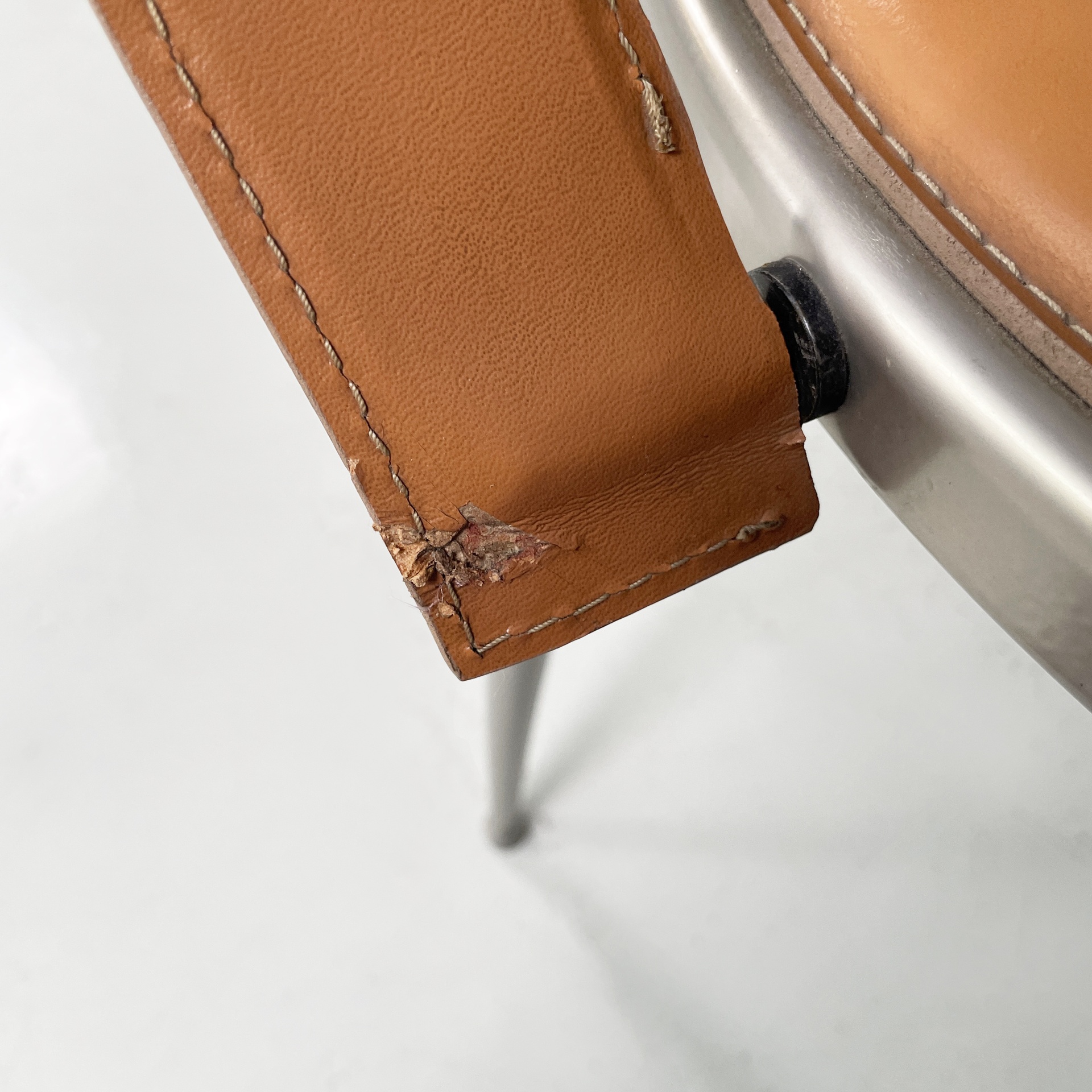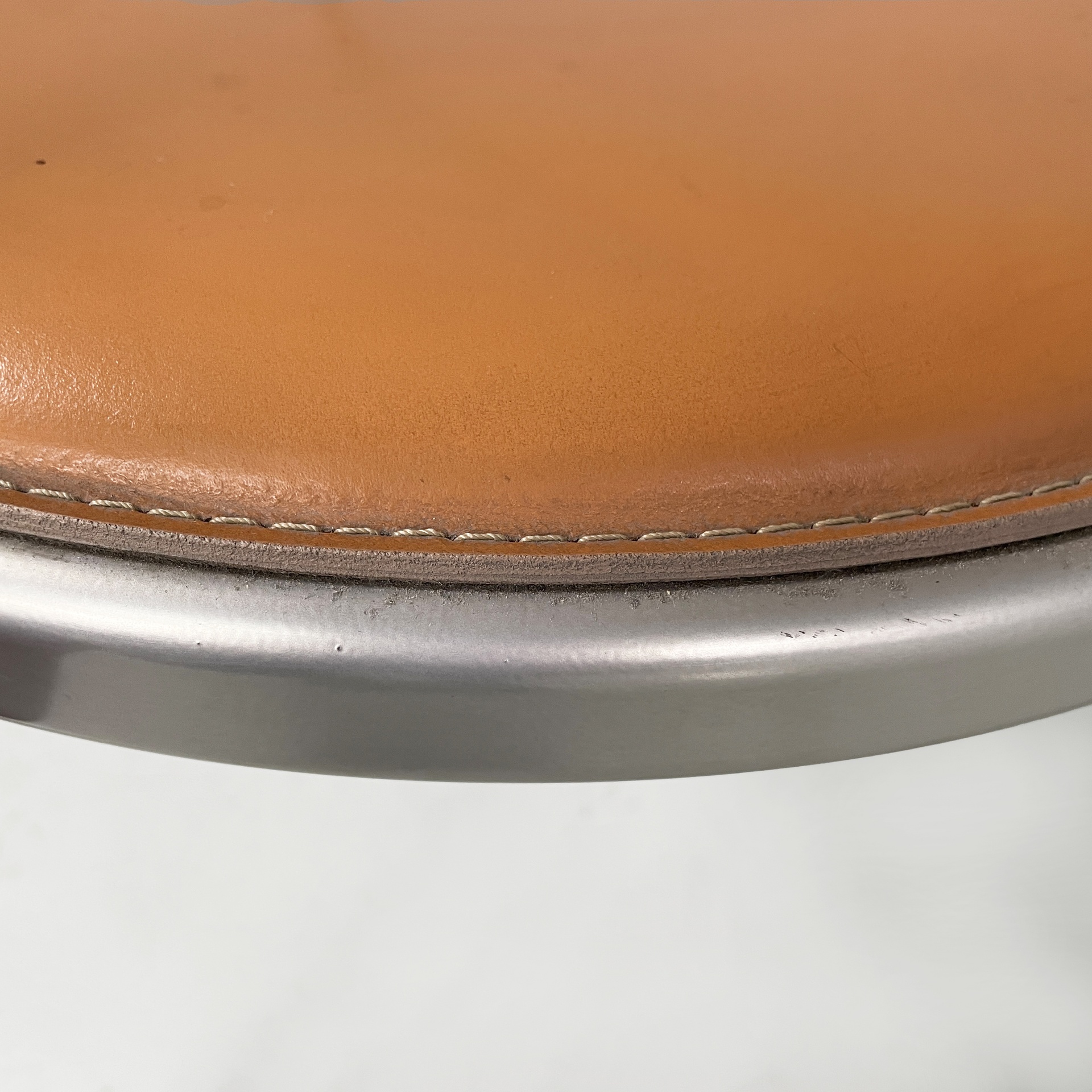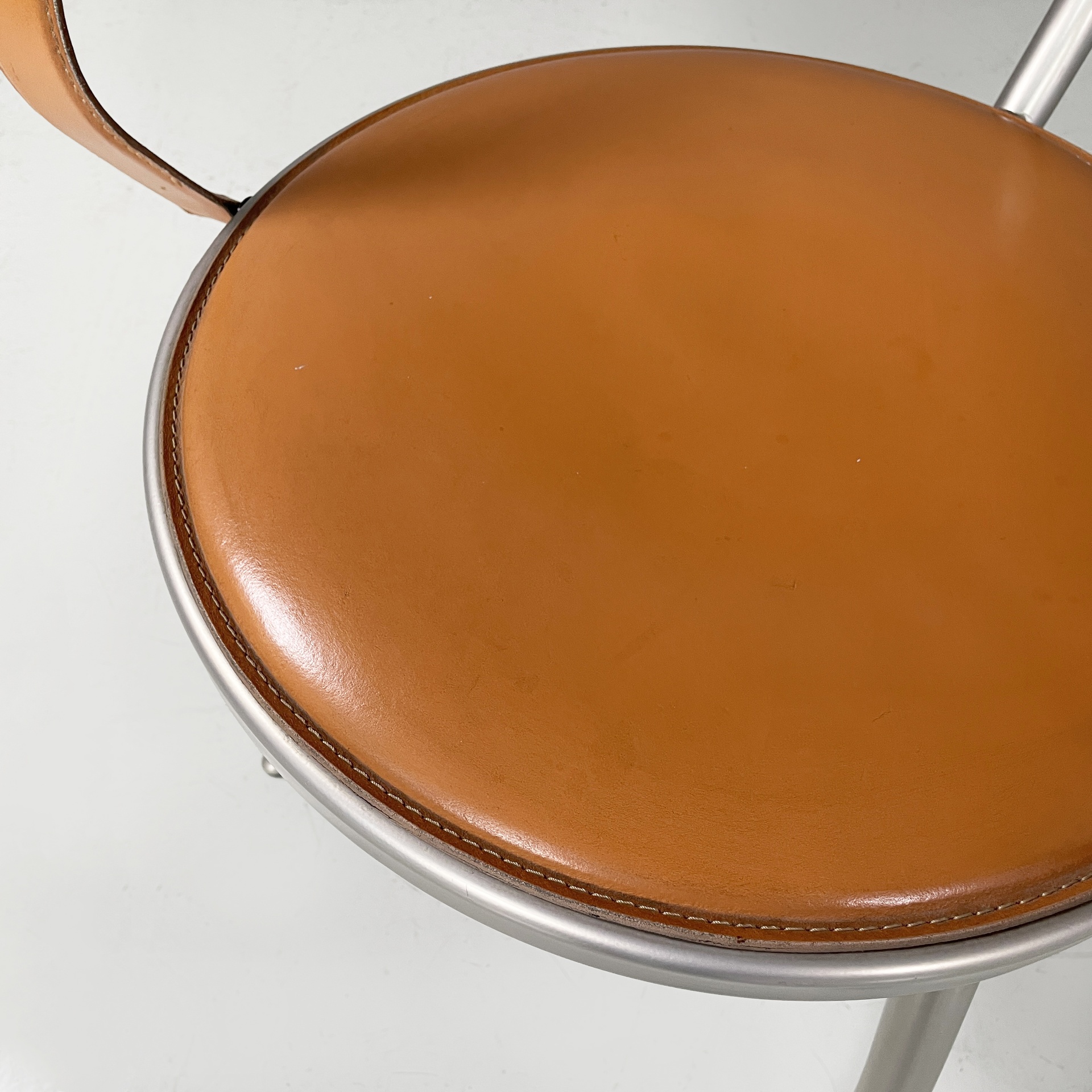 Coppia di sedie con seduta tonda in pelle marrone chiaro. Lo schienale curvo è in cuoio mentre la struttura e le zampe è in tondino di metallo con piedini tondi.