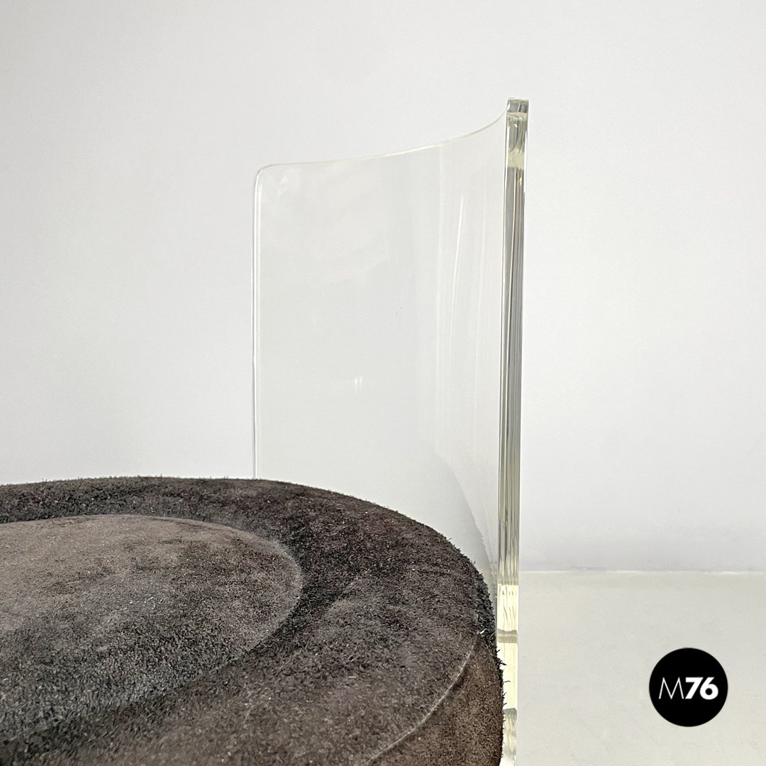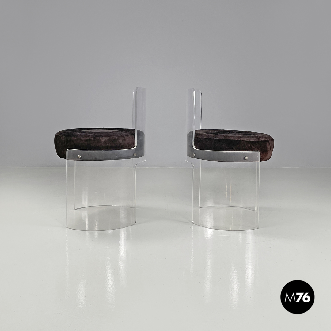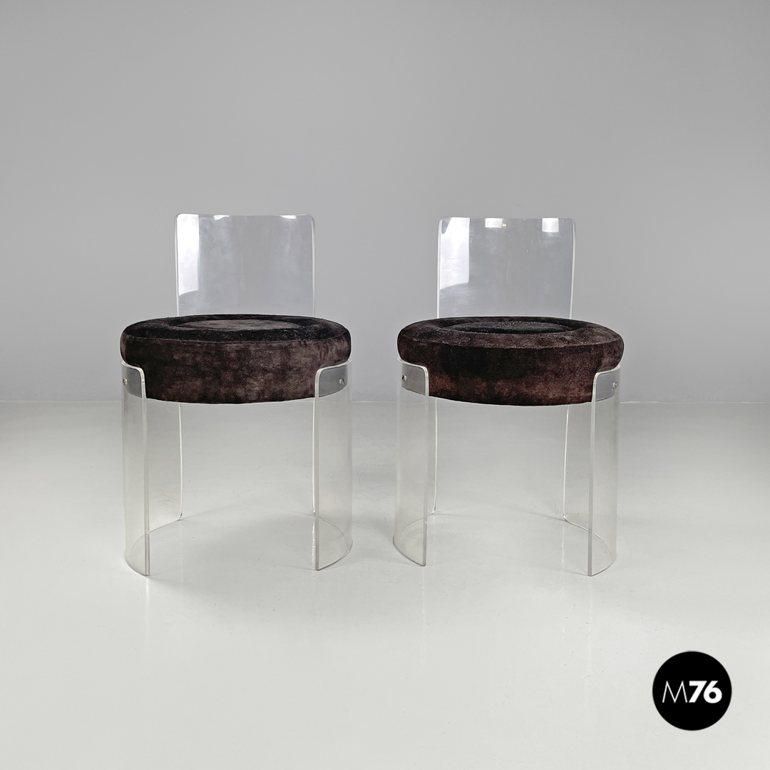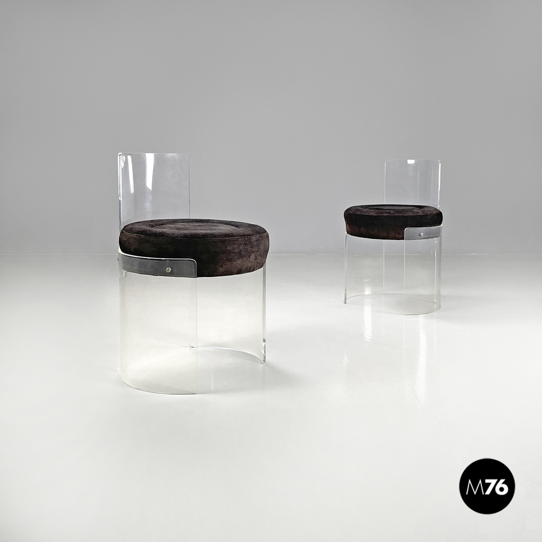 Coppia di sedie a base tonda. La struttura è in plexiglass trasparente le gambe e lo schienale seguono la forma circolare. La seduta tonda è imbottita e rivestita di camoscio marrone.