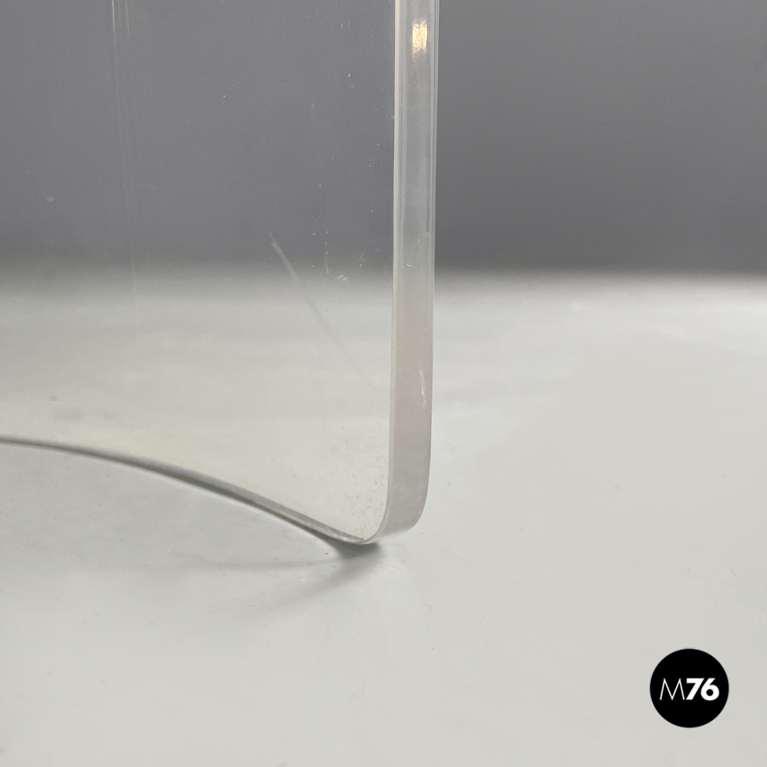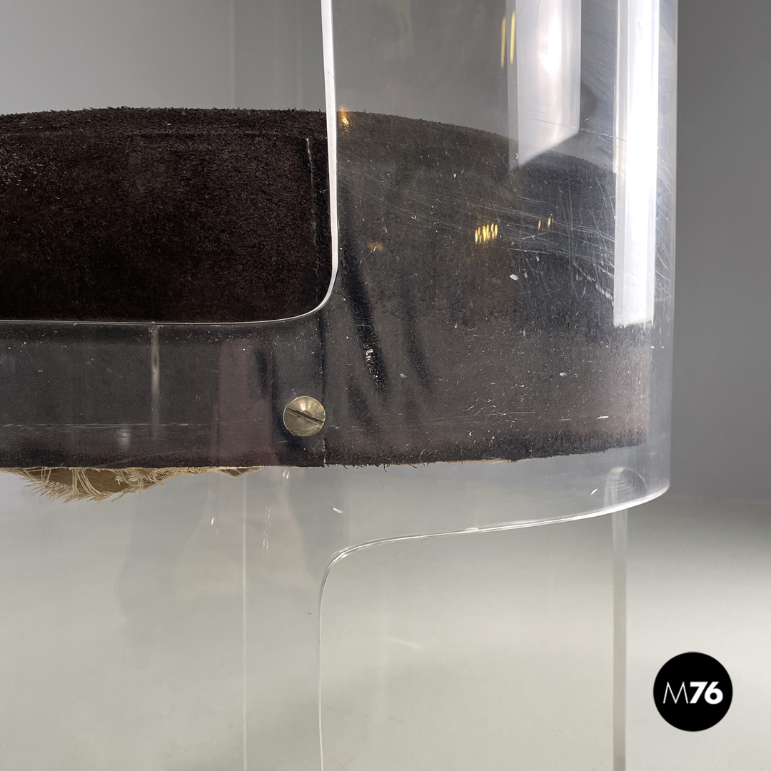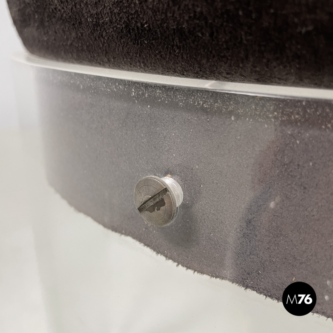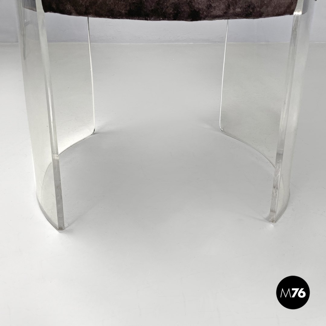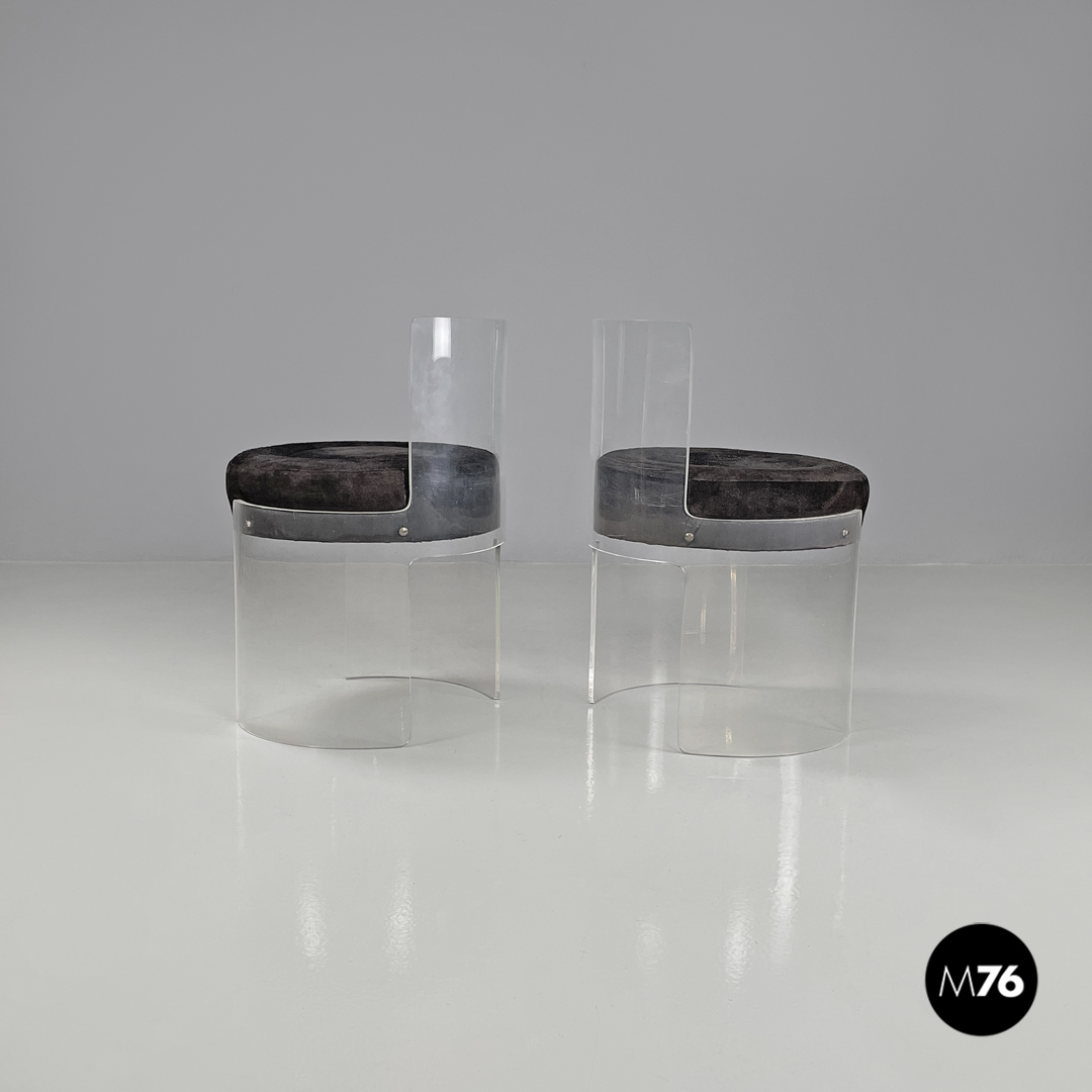 Coppia di sedie a base tonda. La struttura è in plexiglass trasparente le gambe e lo schienale seguono la forma circolare. La seduta tonda è imbottita e rivestita di camoscio marrone.