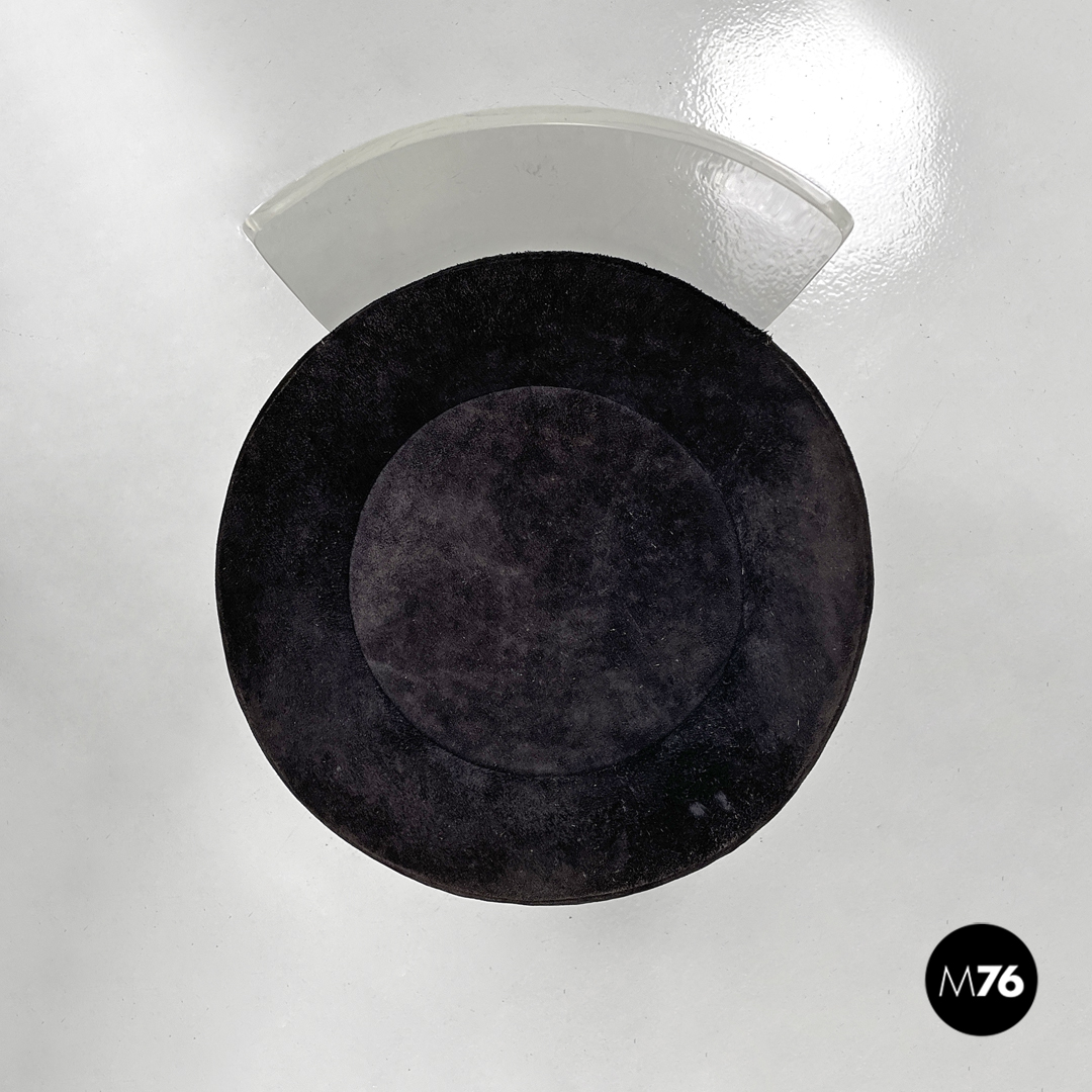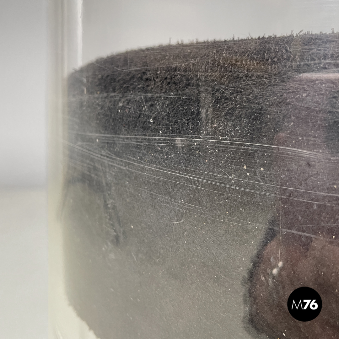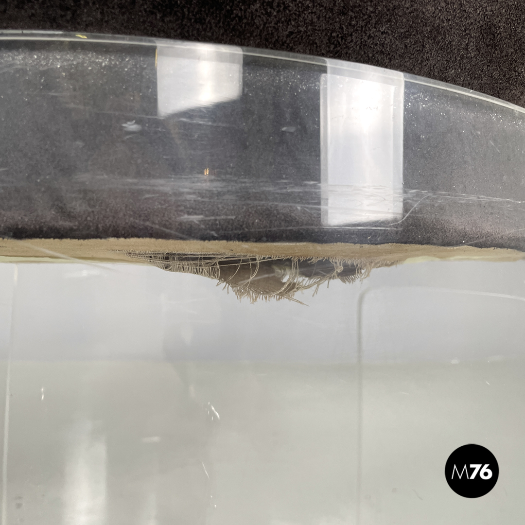 Buone condizioni con segni dell’uso e del tempo e graffi sul plexiglass e sul camoscio. Presenti ossidazioni e uno strappo nella stoffa sotto una seduta.
