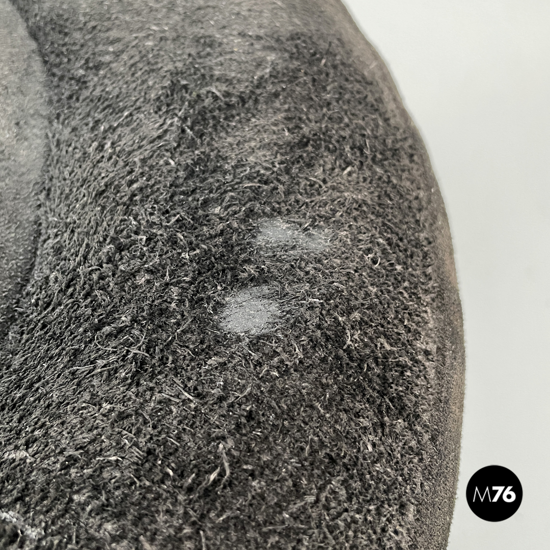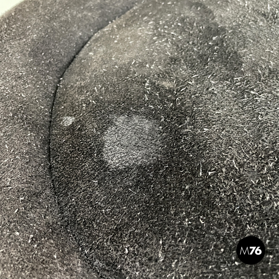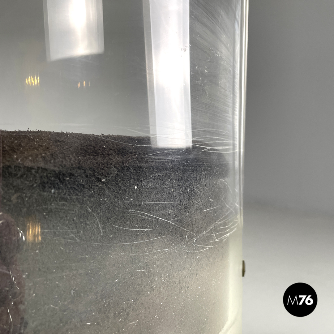 Buone condizioni con segni dell’uso e del tempo e graffi sul plexiglass e sul camoscio. Presenti ossidazioni e uno strappo nella stoffa sotto una seduta.