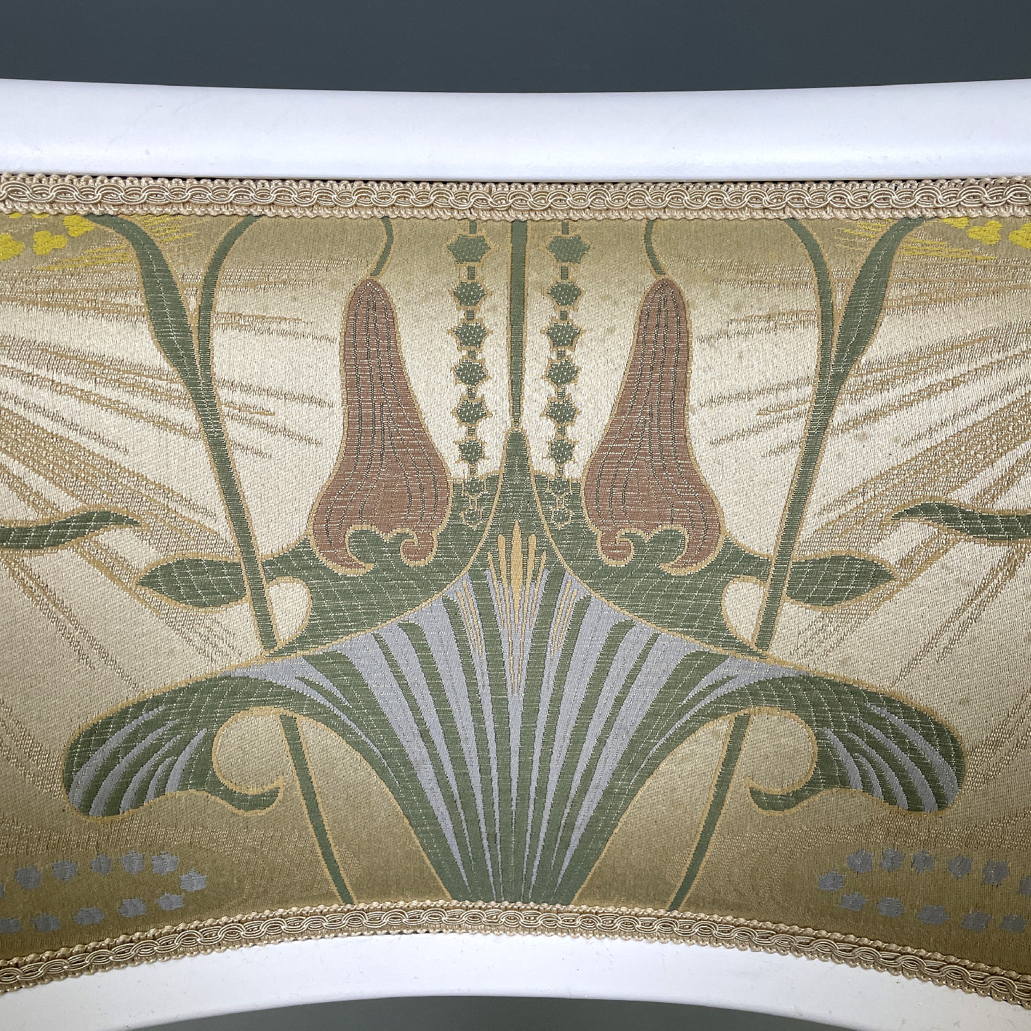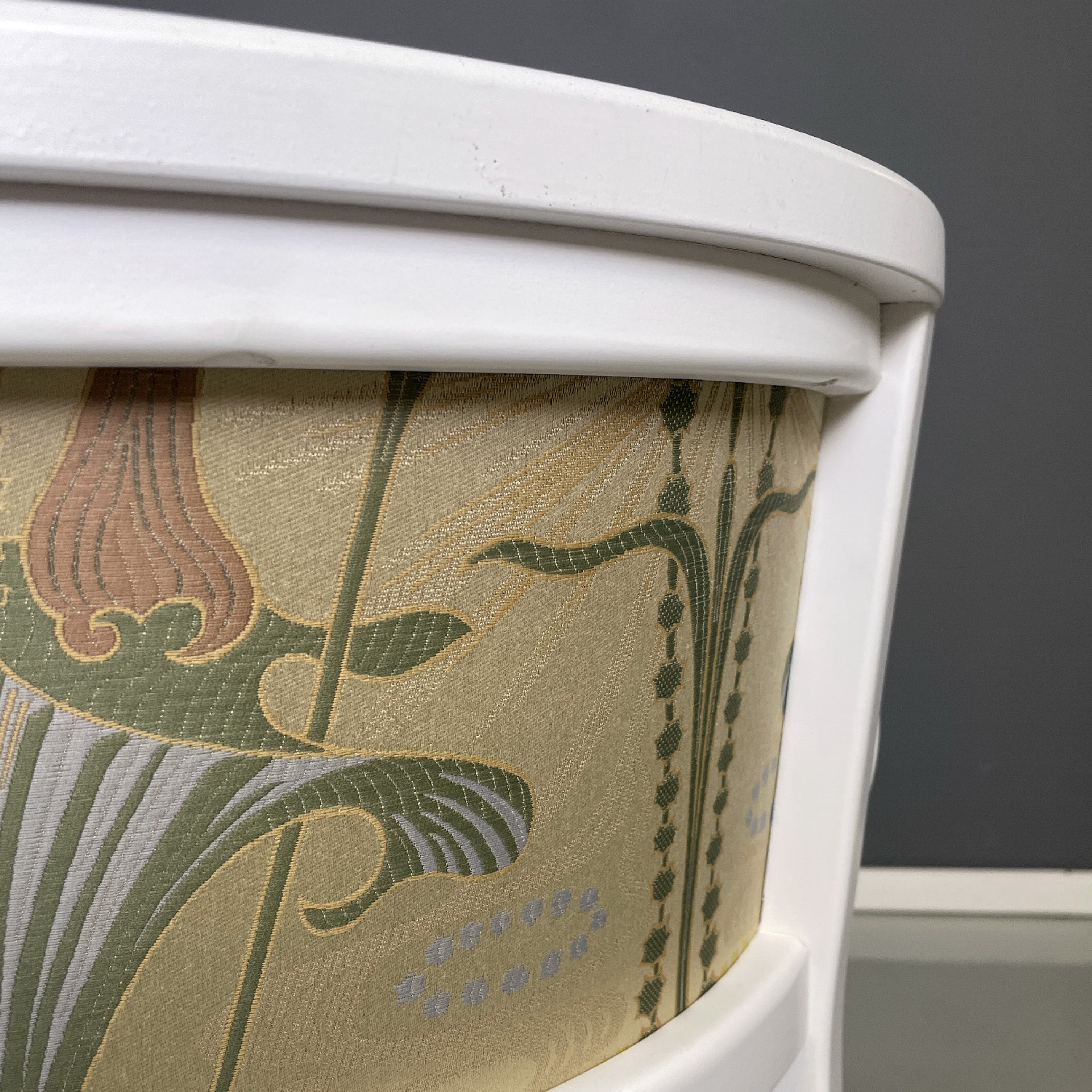 Set of four tub chairs. The structure is in white painted wood has a rhomboid decoration on the sides of the seat. The seat and back are padded and covered in a William Morris style fabric. It has four legs with a square section joined by a semicircular strip.