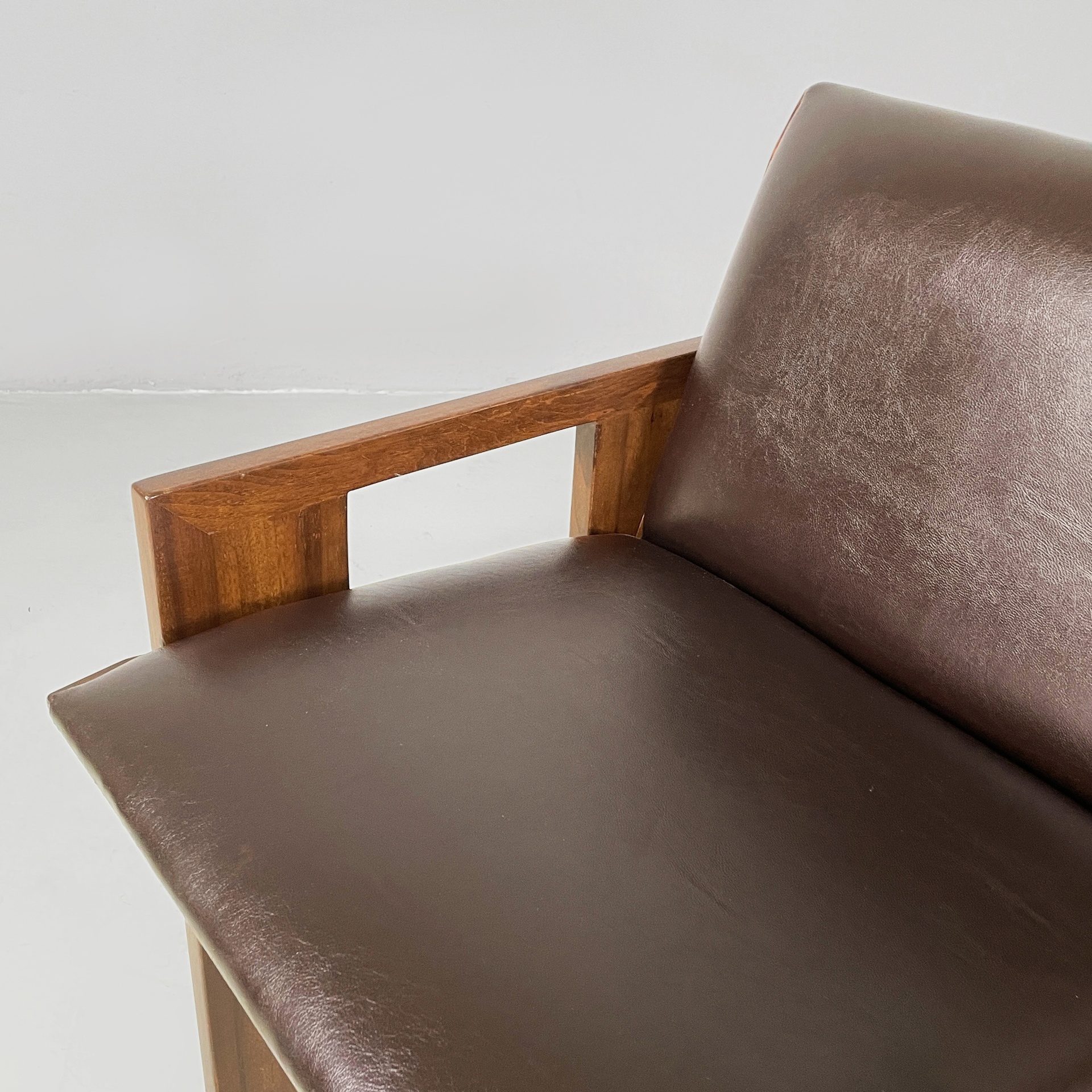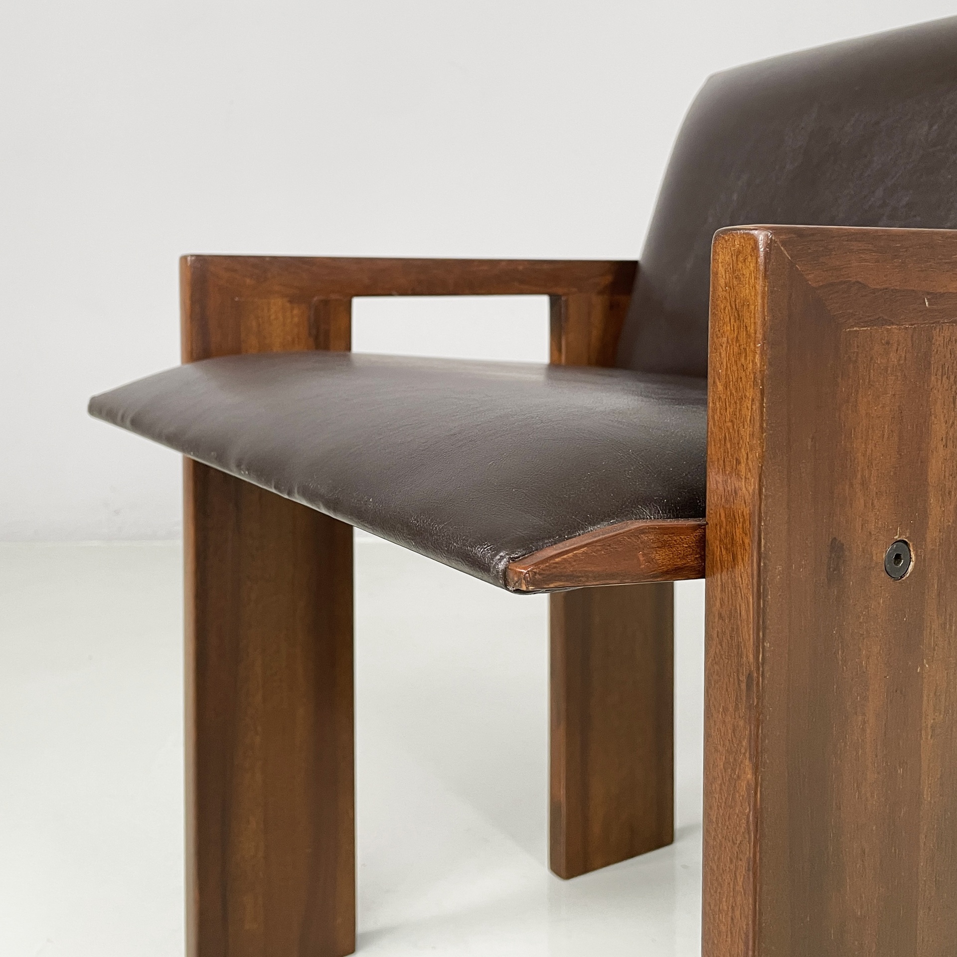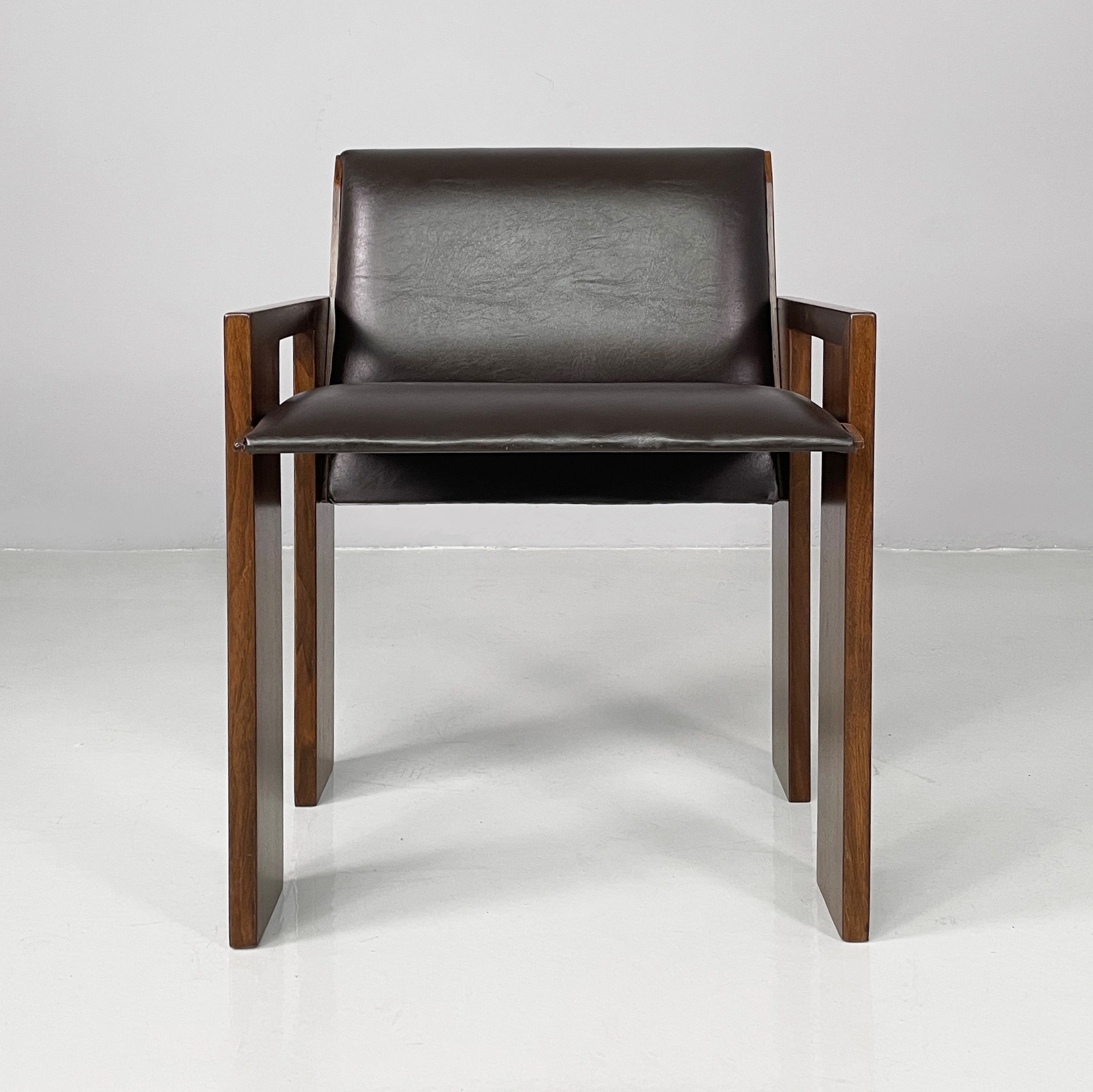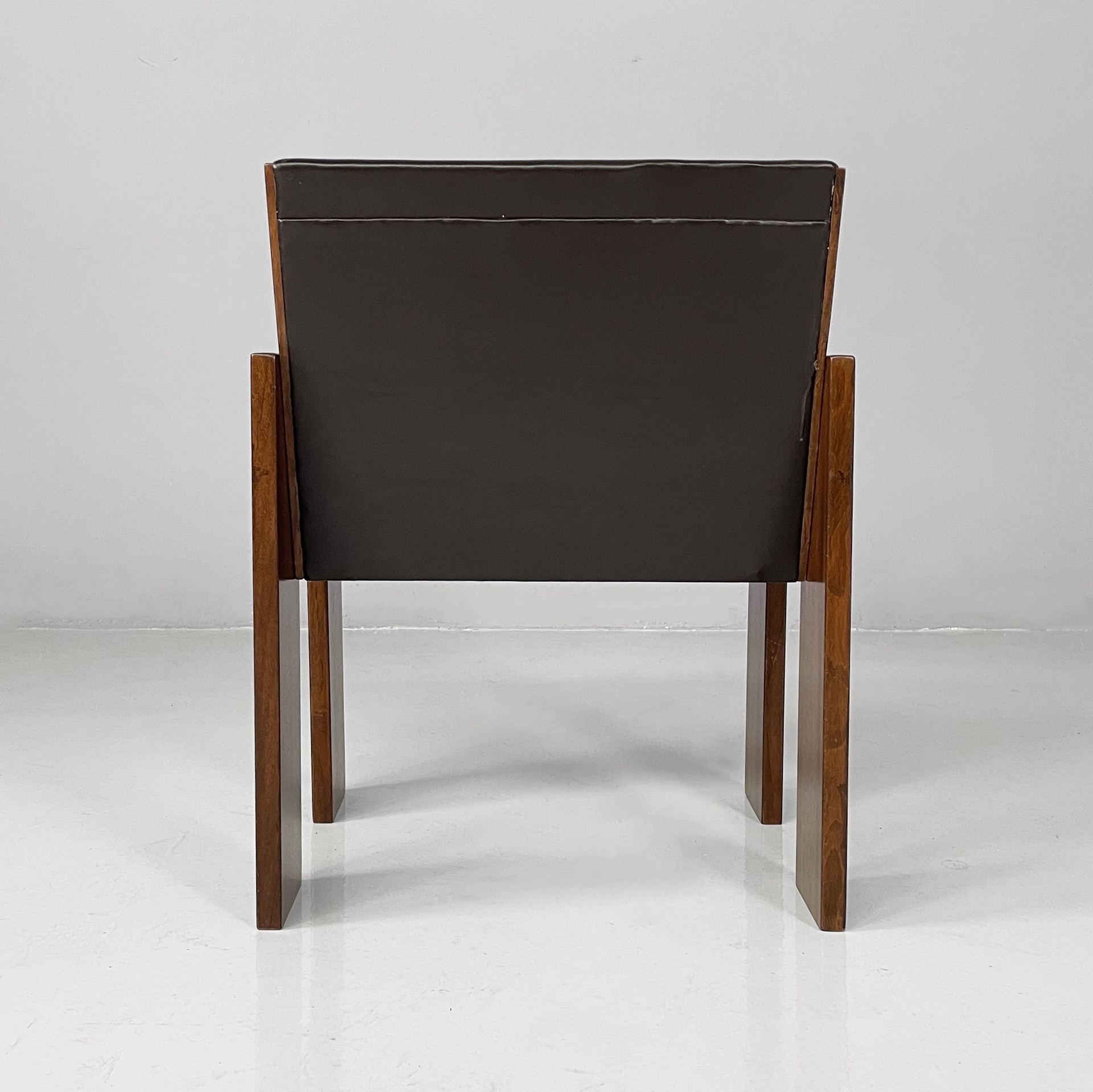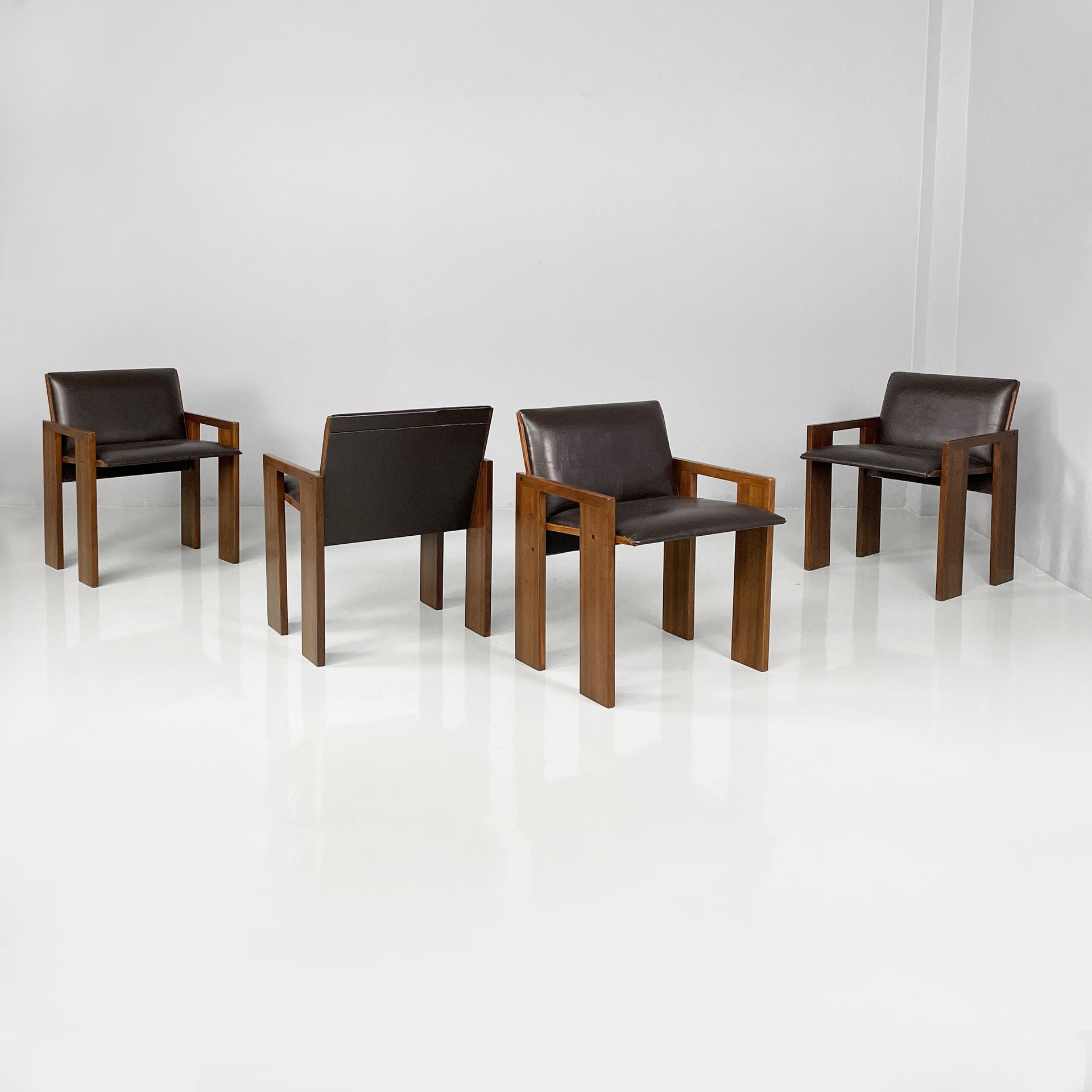 Set di quattro sedie con seduta e schienale imbottiti e rivestiti in pelle marrone. La struttura, i braccioli e le zampe sono composti da listelli di legno.