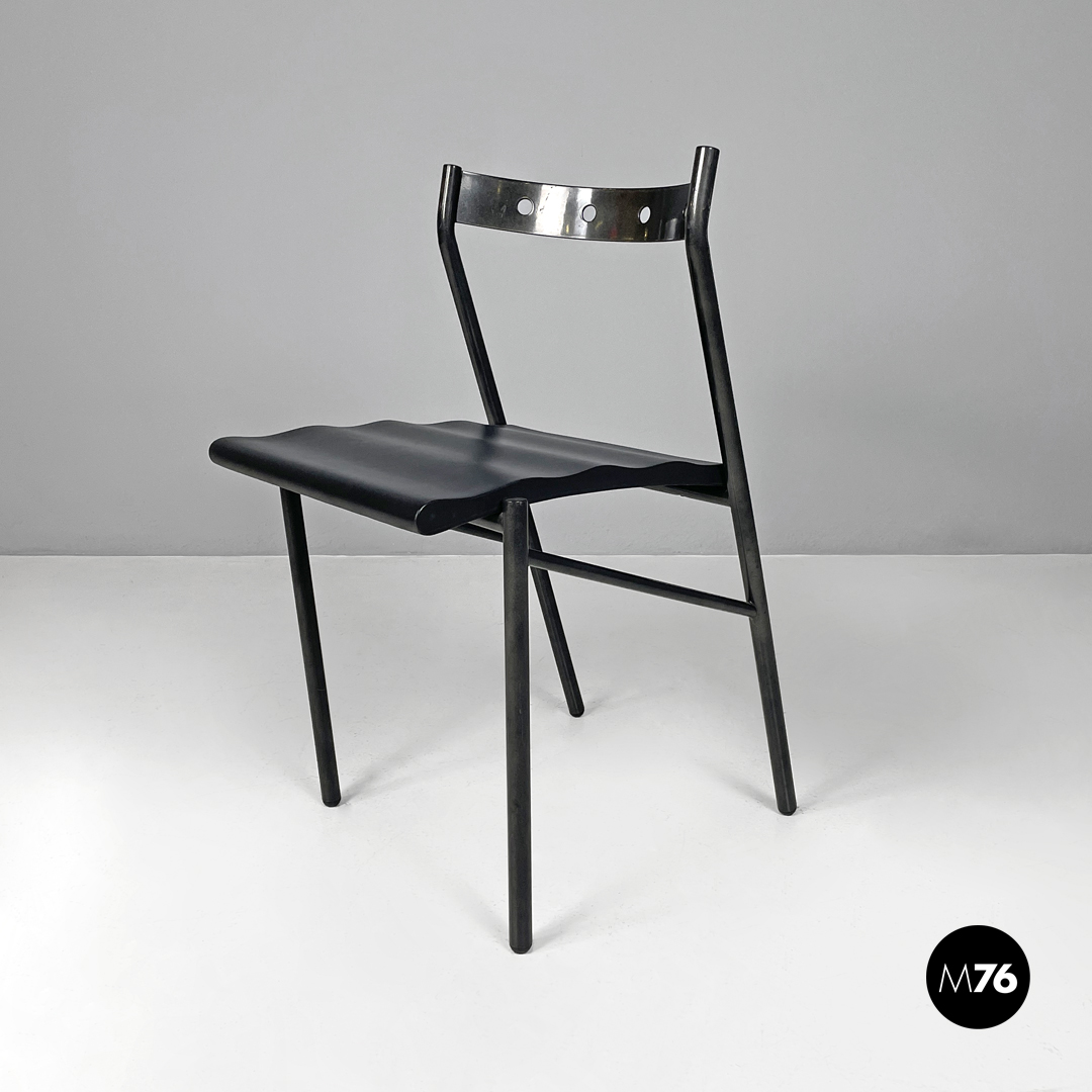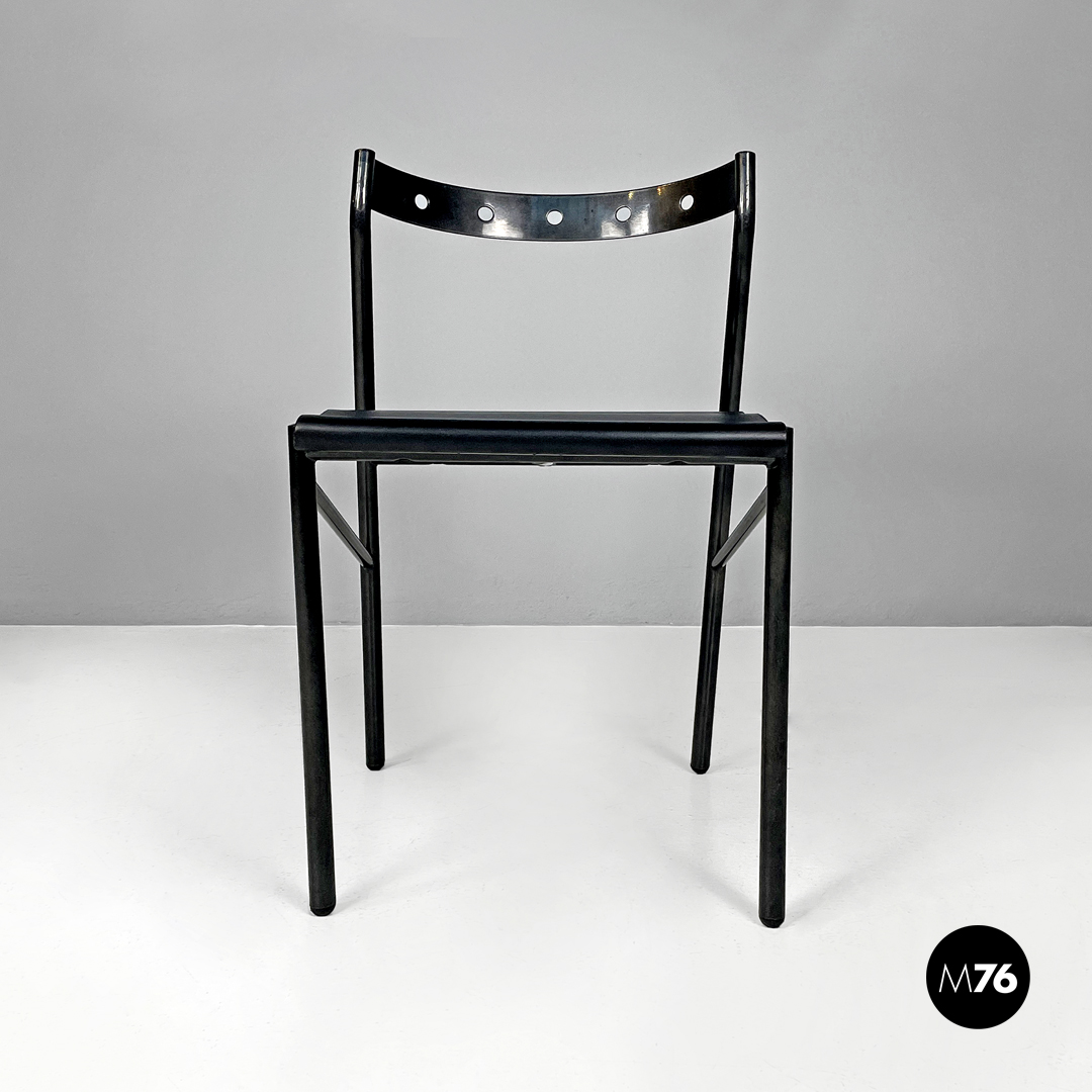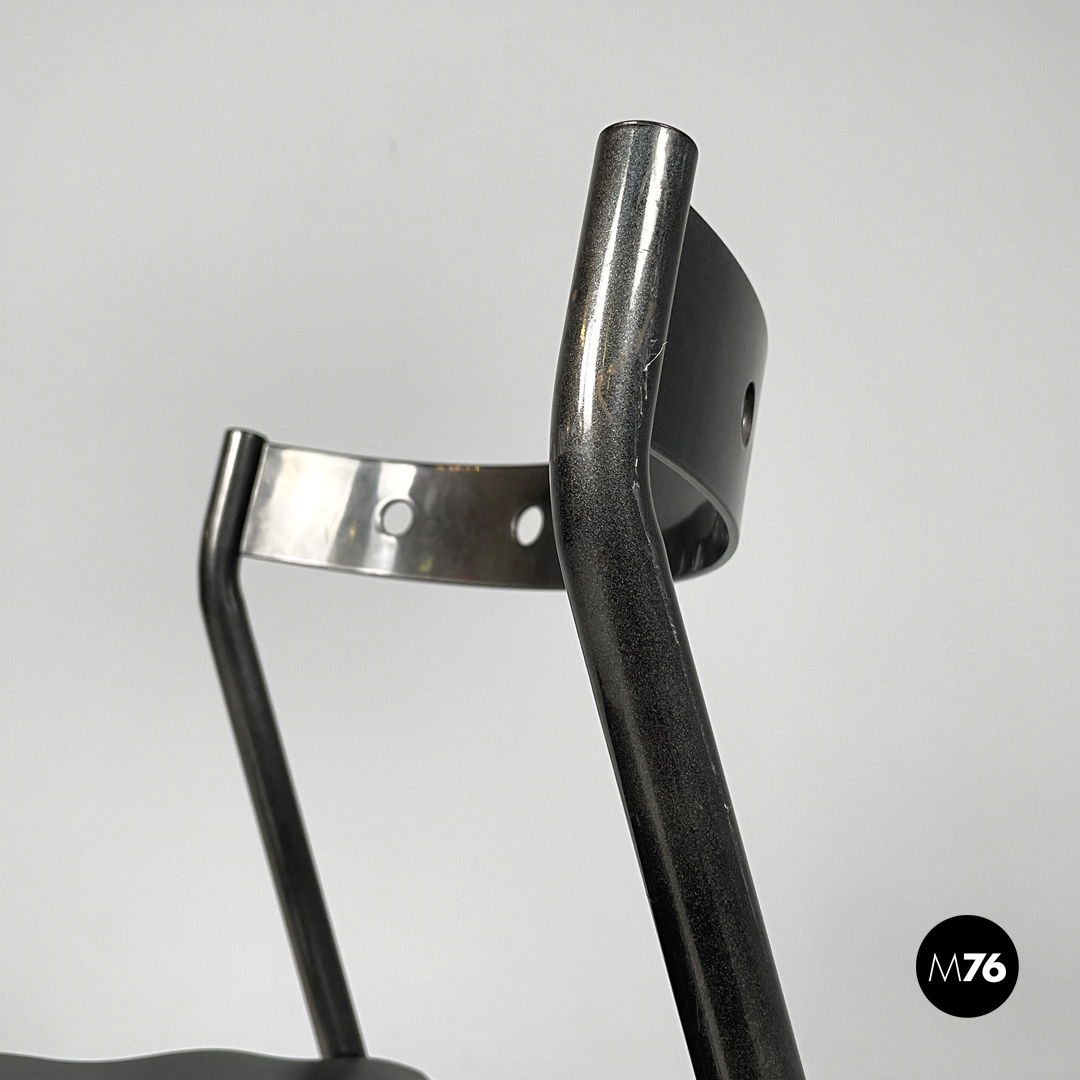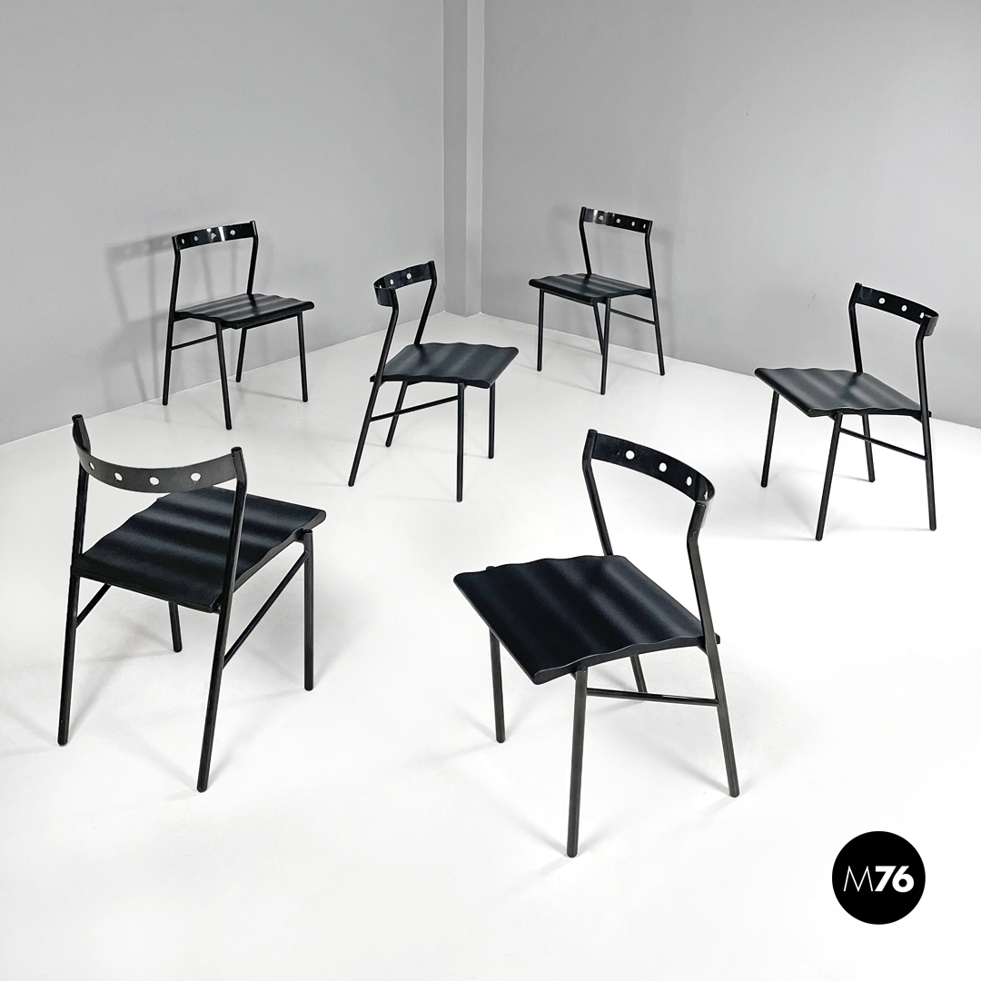 Set di sei sedie con seduta rettangolare. La sedia si sviluppa “in avanti” seguendo una linea diagonale. La seduta è in gomma nera ed è sagomata con linee curve