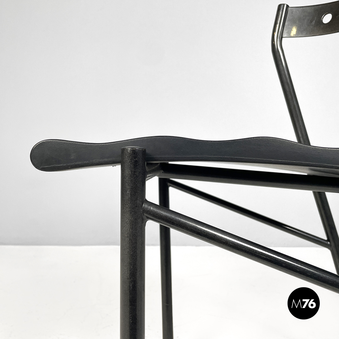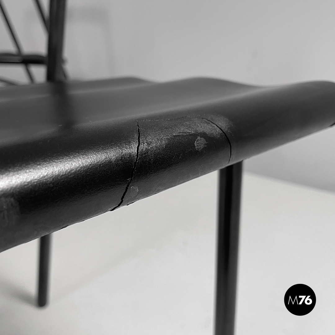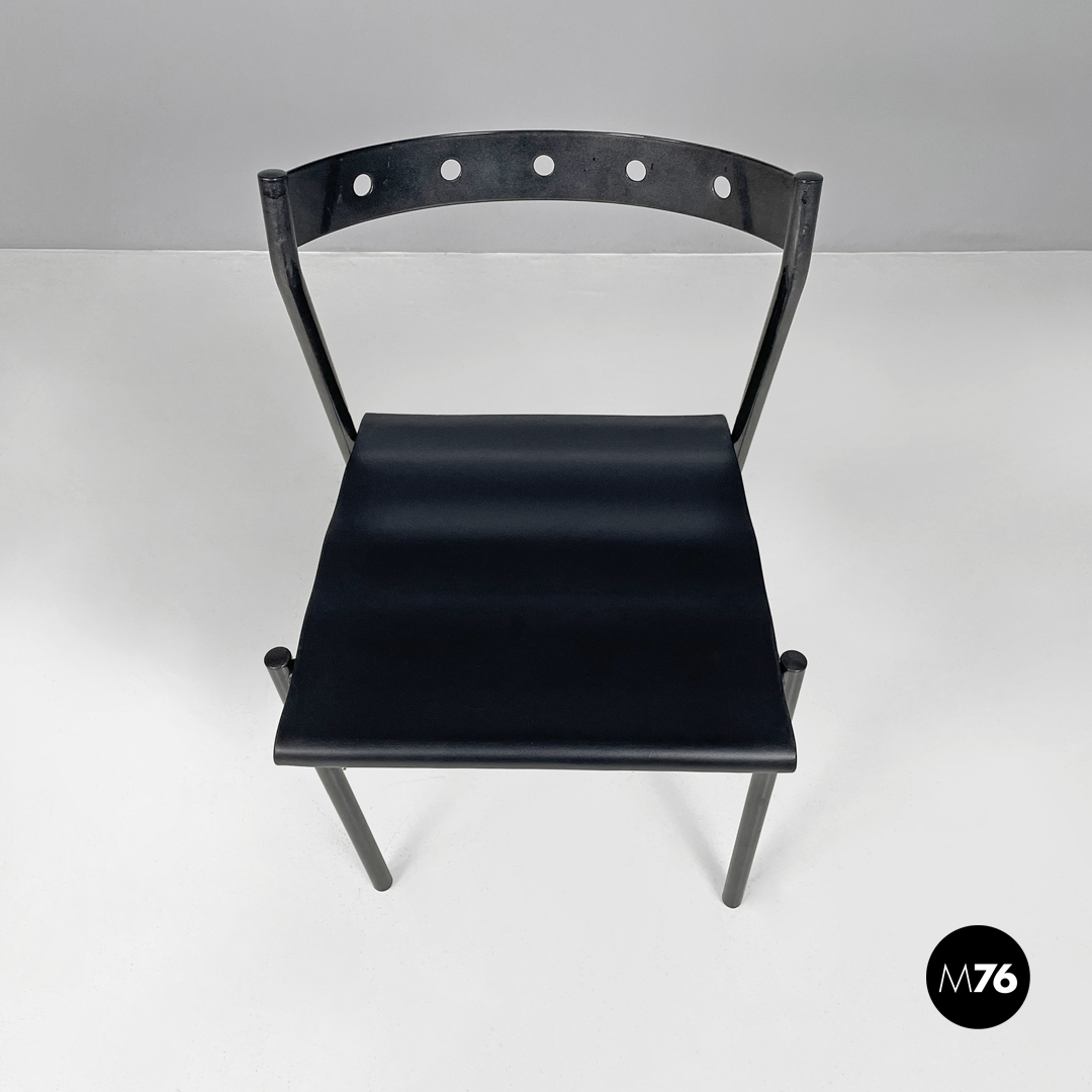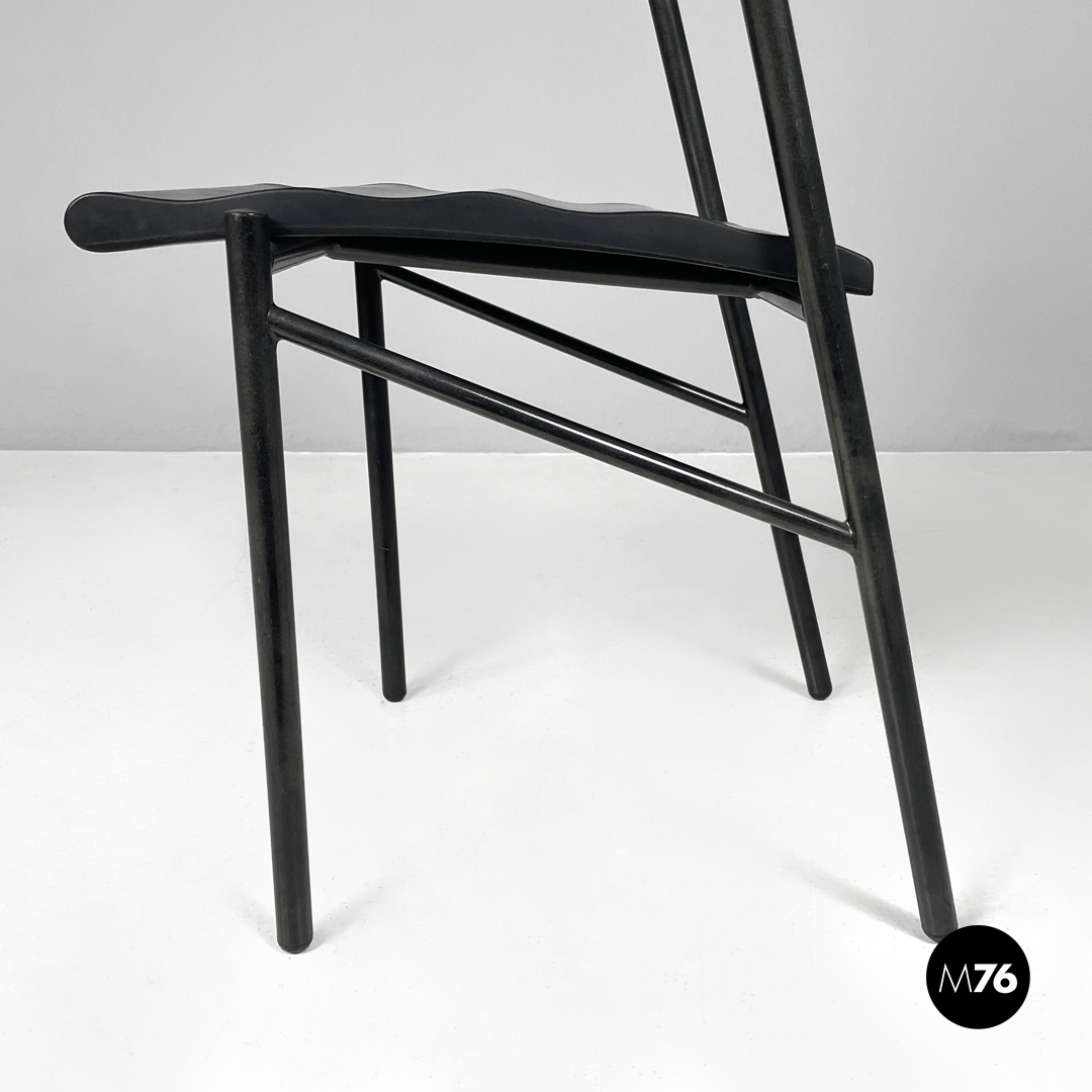 Set di sei sedie con seduta rettangolare. La sedia si sviluppa “in avanti” seguendo una linea diagonale. La seduta è in gomma nera ed è sagomata con linee curve