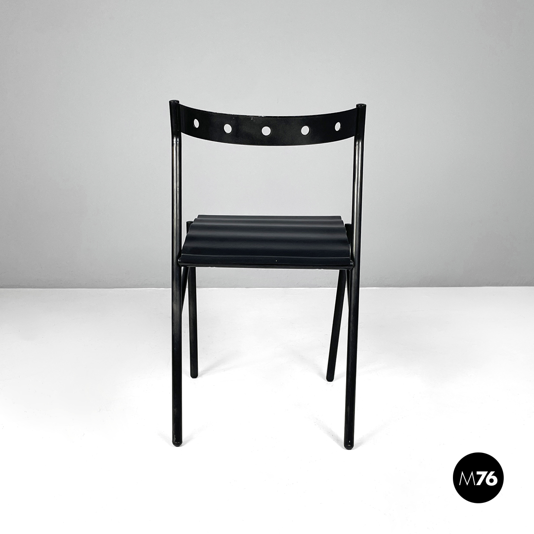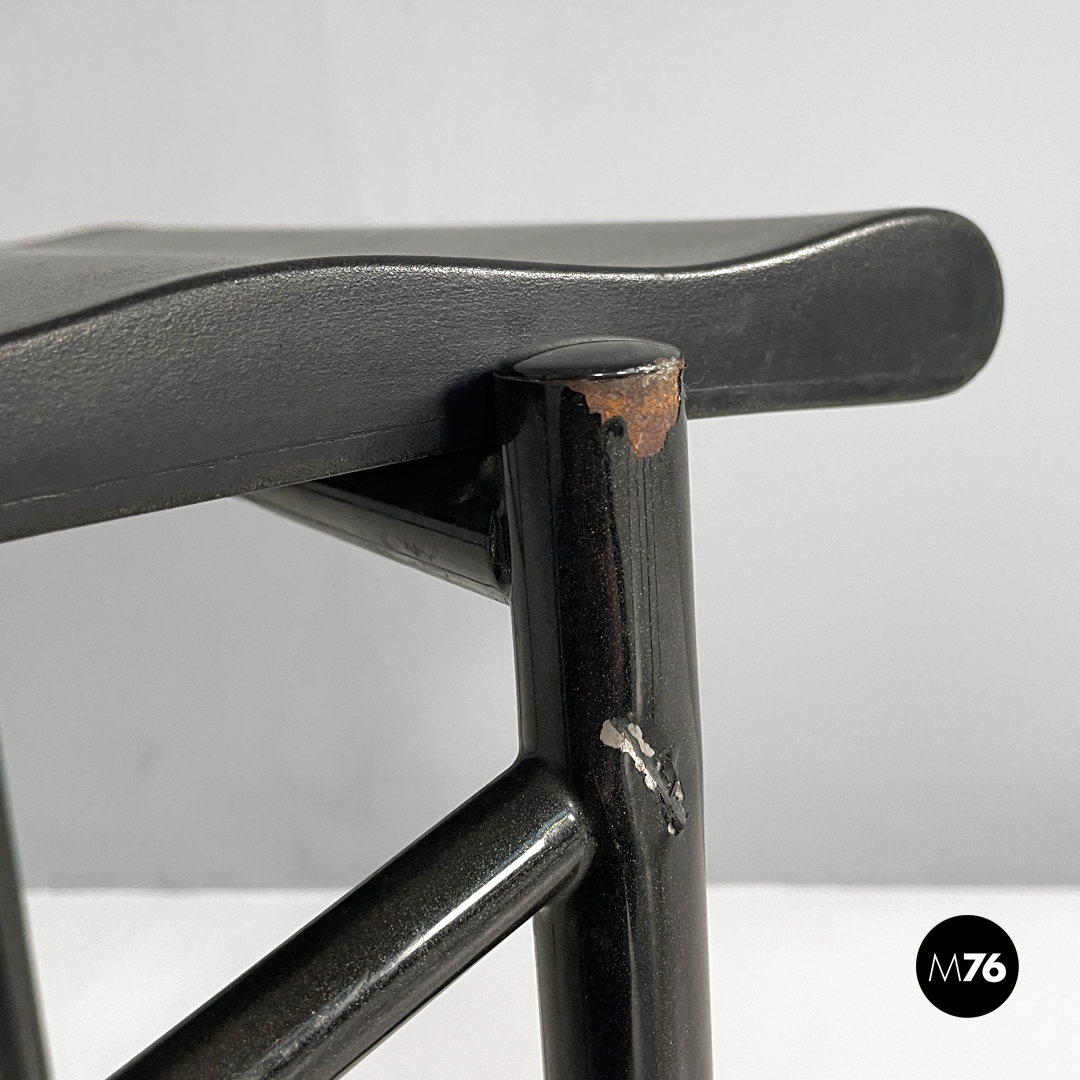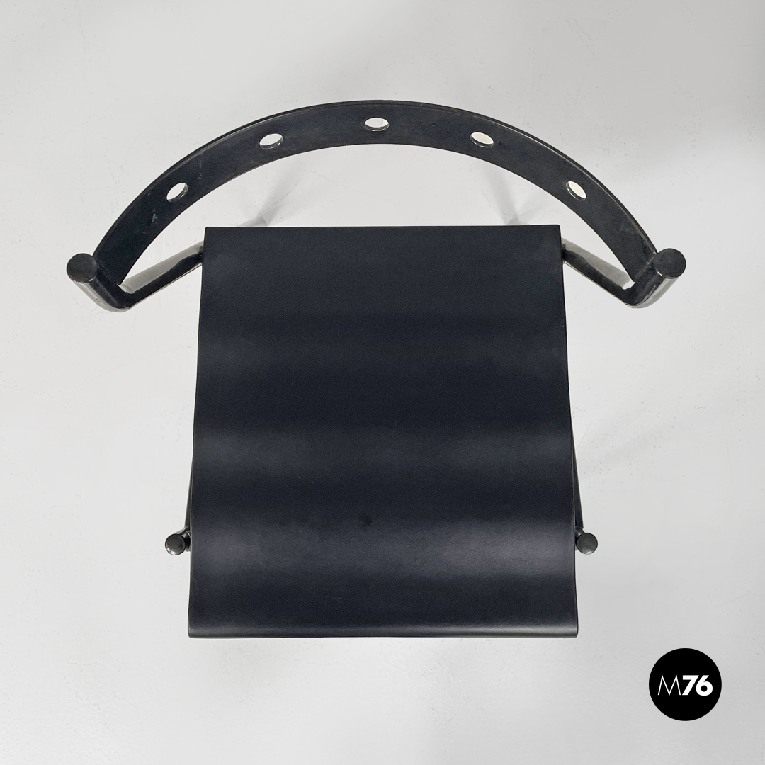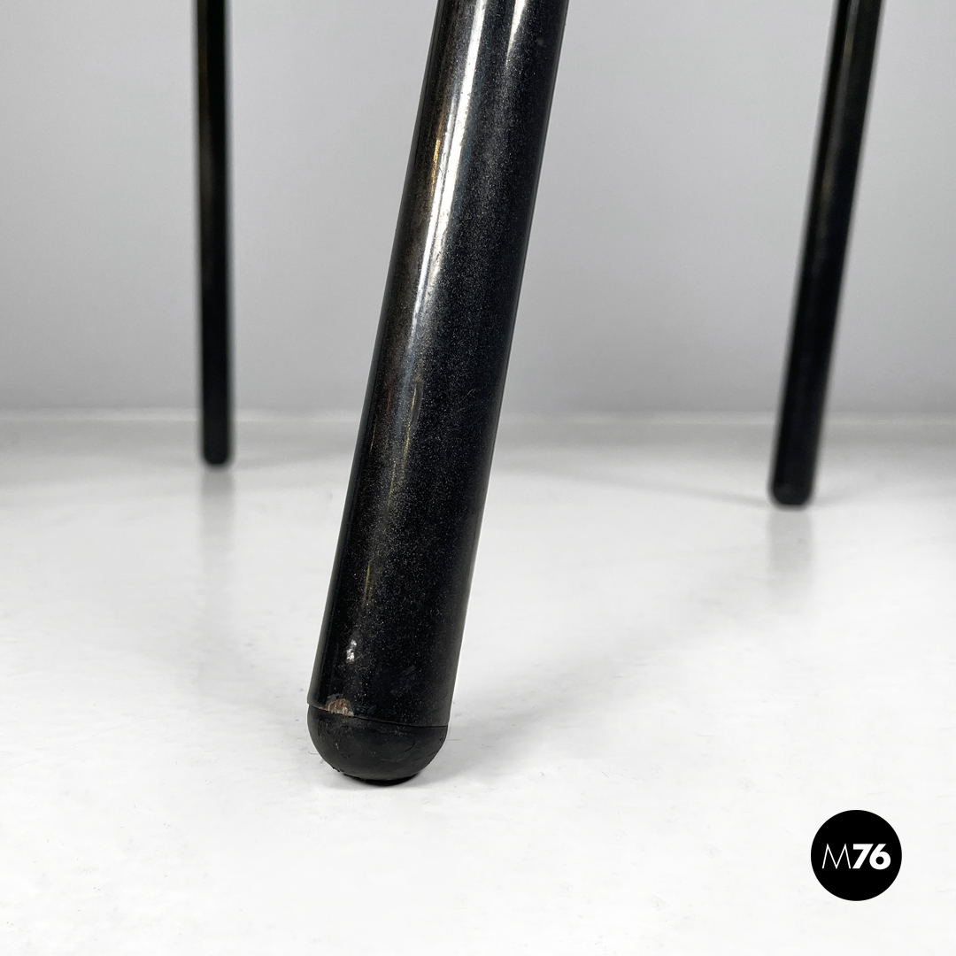 Set di sei sedie con seduta rettangolare. La sedia si sviluppa “in avanti” seguendo una linea diagonale. La seduta è in gomma nera ed è sagomata con linee curve