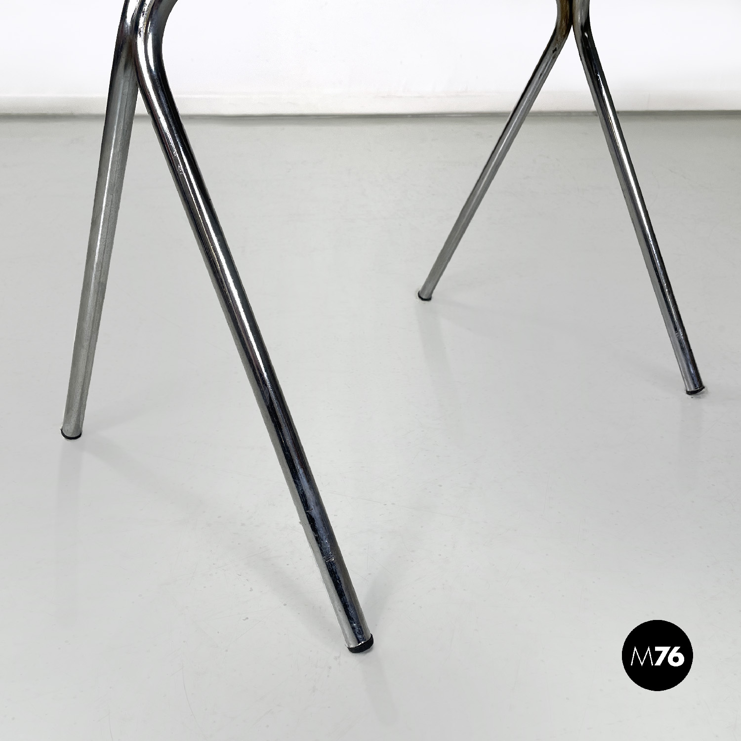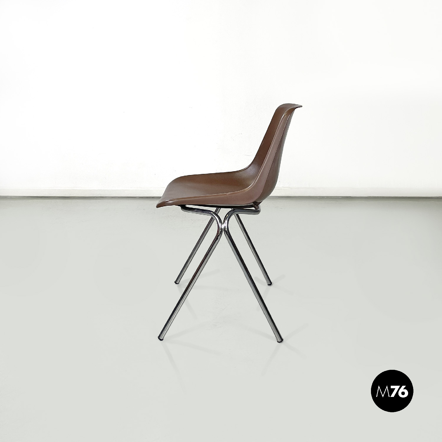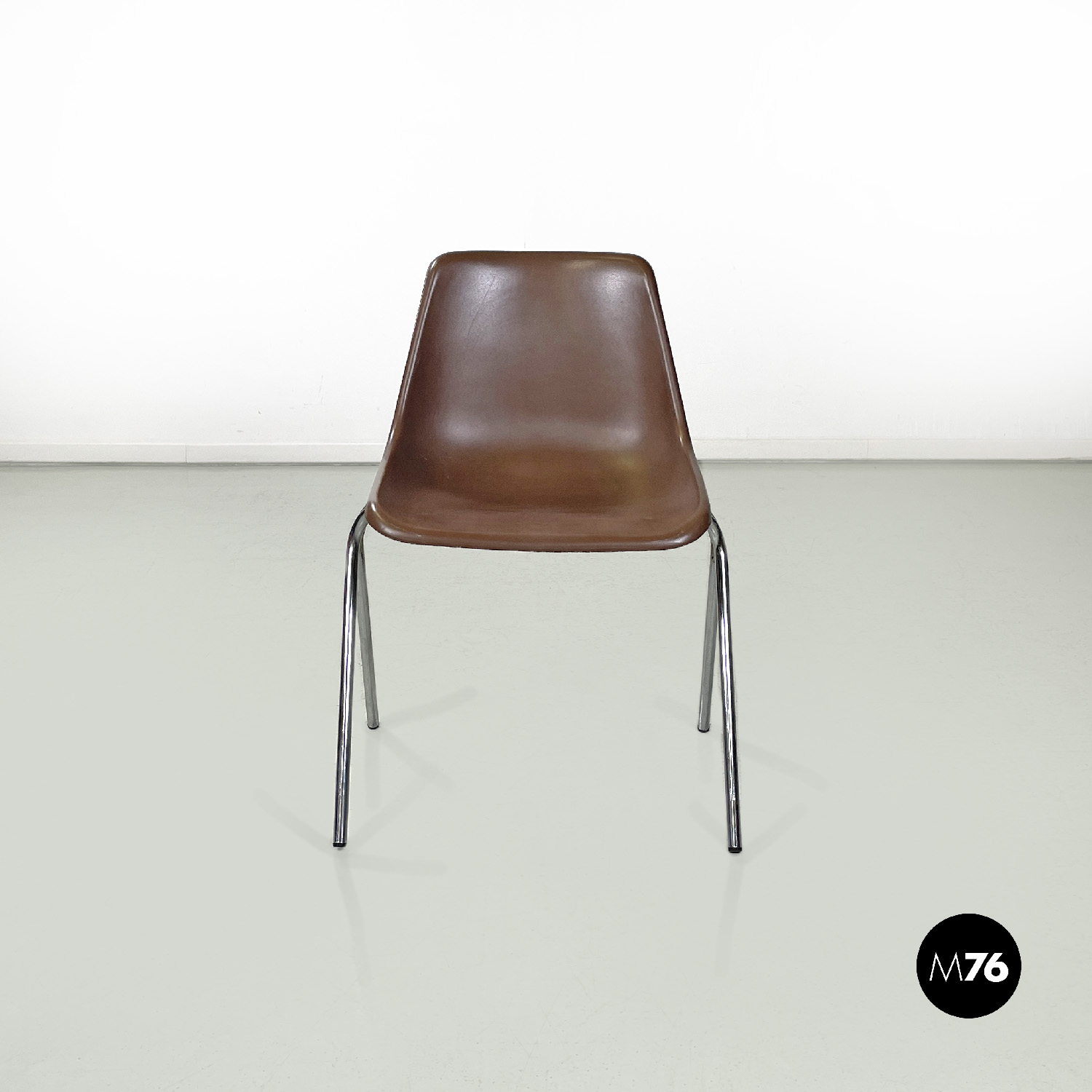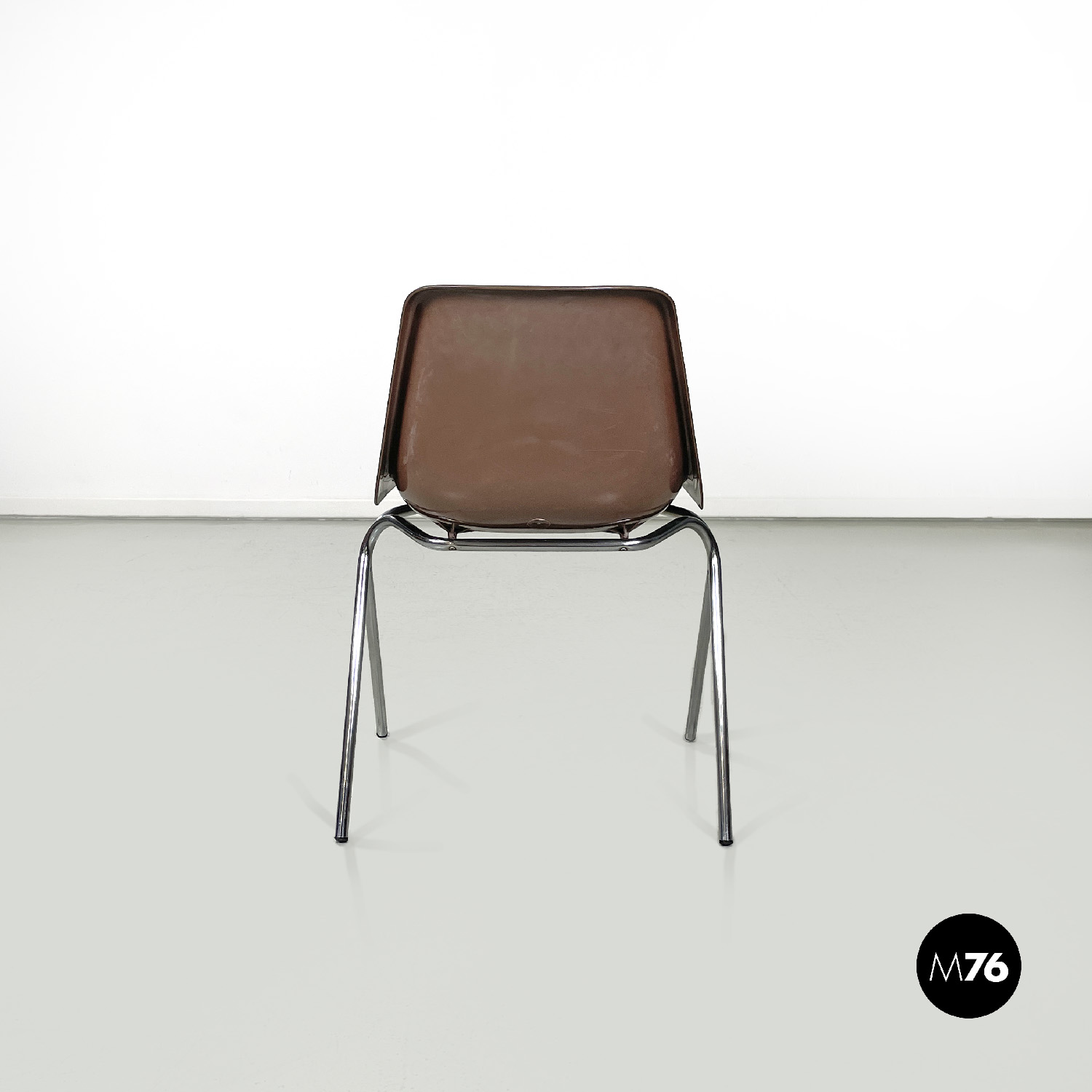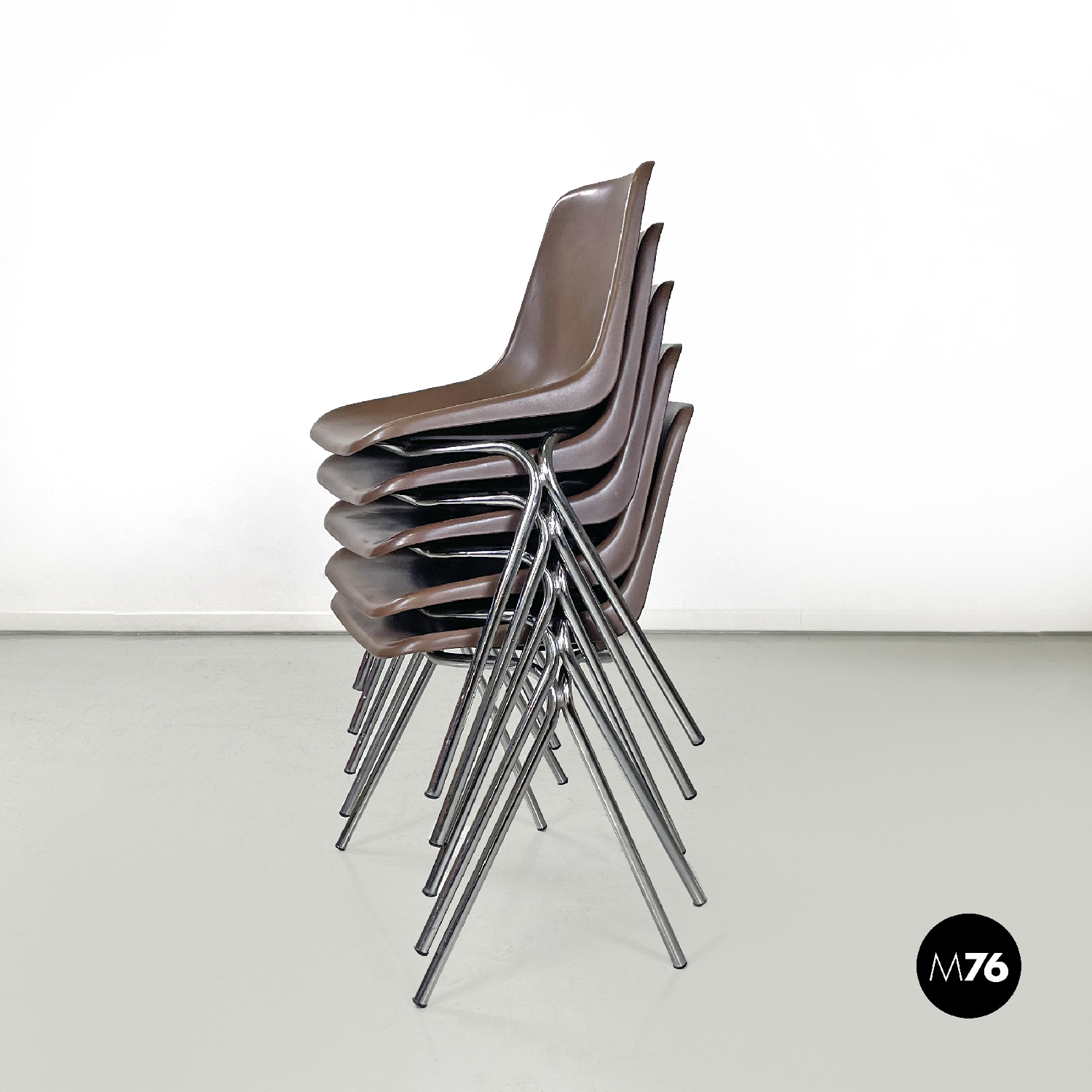 Set di cinque sedie con seduta e schienale composti da un’unica struttura in plastica marrone sagomata e curvata sulla seduta e sul perimetro. Le gambe sono in tondino di metallo cromato color argento terminano con piedini in plastica nera. Le sedie sono impilabili.