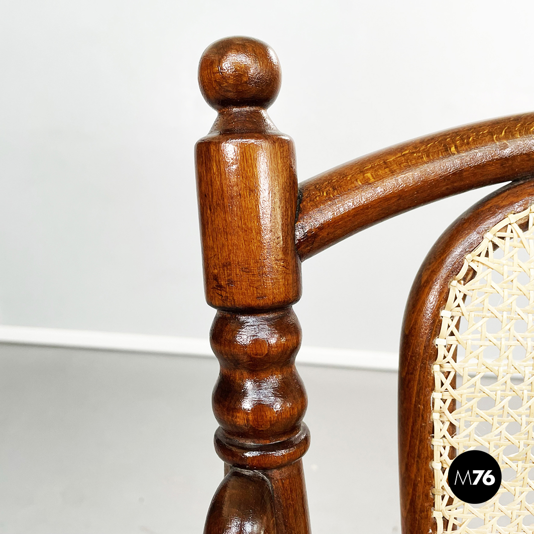 Set di tre sedie in legno con seduta quadrata con angoli arrotondati in paglia. Lo schienale è composto da due aste verticali lavorate e un rettangolo con angoli arrotondati in paglia di Vienna. Con braccioli ricurvi.