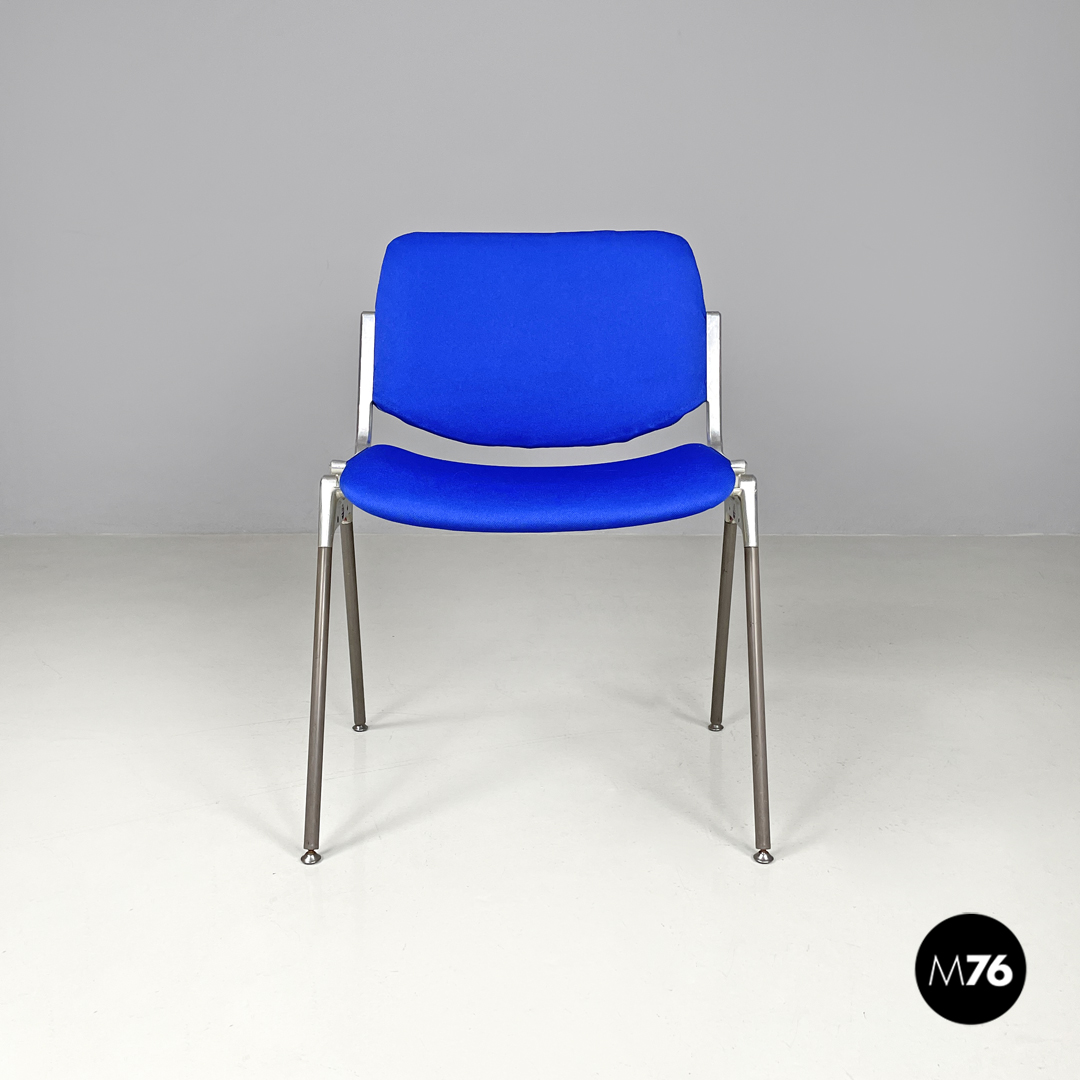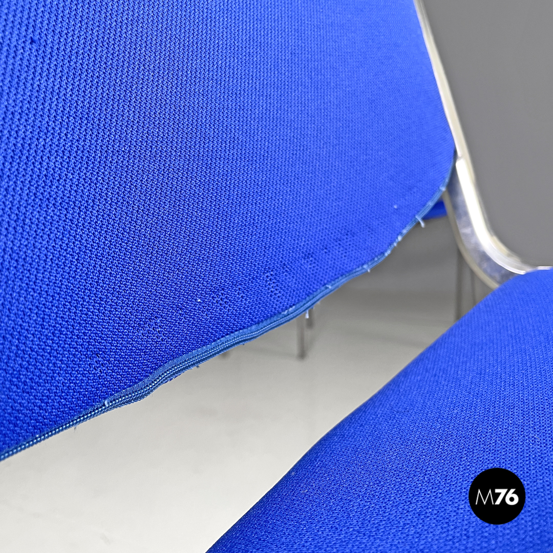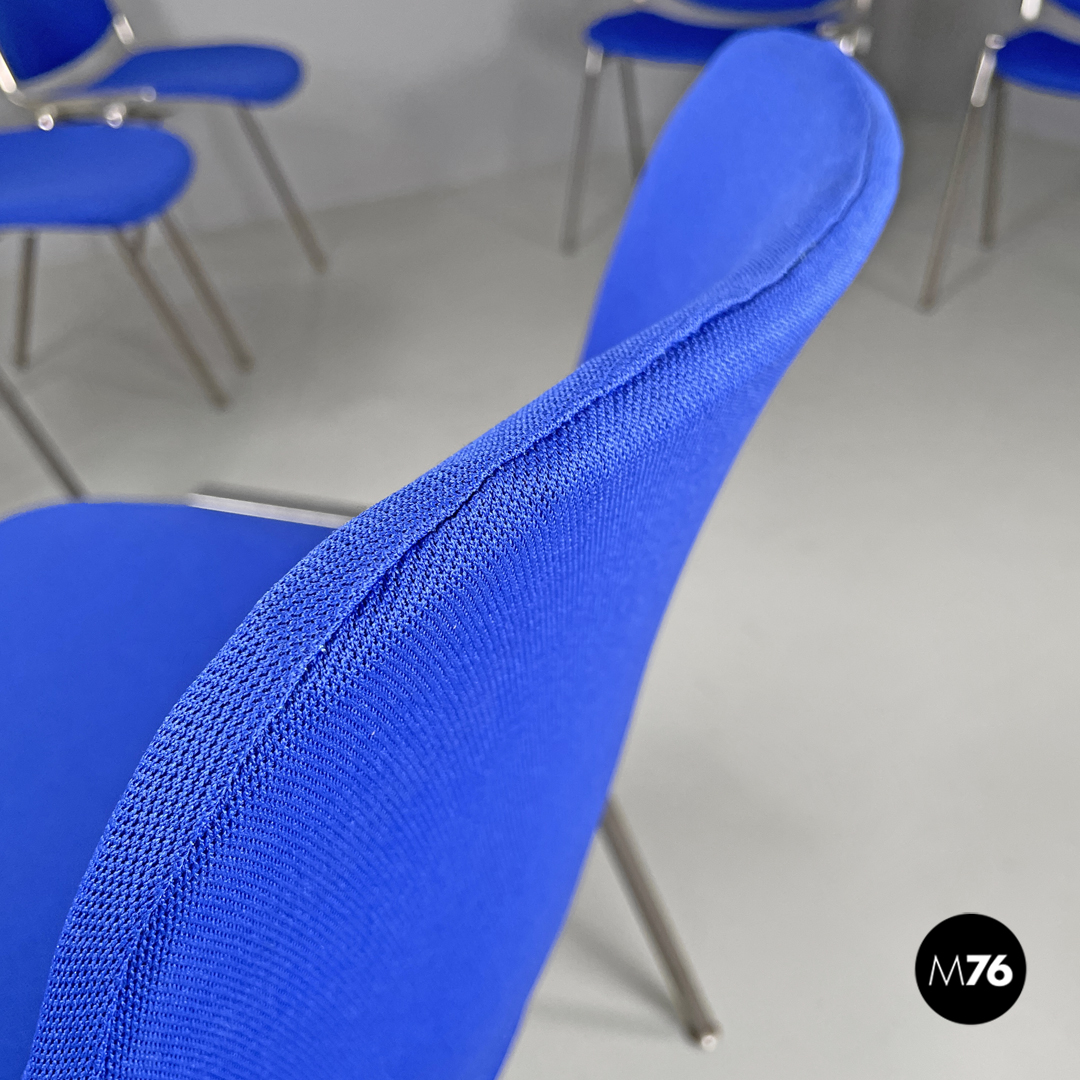 Set di sei sedie modello DSC impilabili imbottite e rivestite in tessuto blu elettrico con seduta e schienale rettangolari con angoli arrotondati. La struttura robusta è in alluminio con gambe a sezione tonda rivestite in plastica grigia con piedini tondi sempre in alluminio.