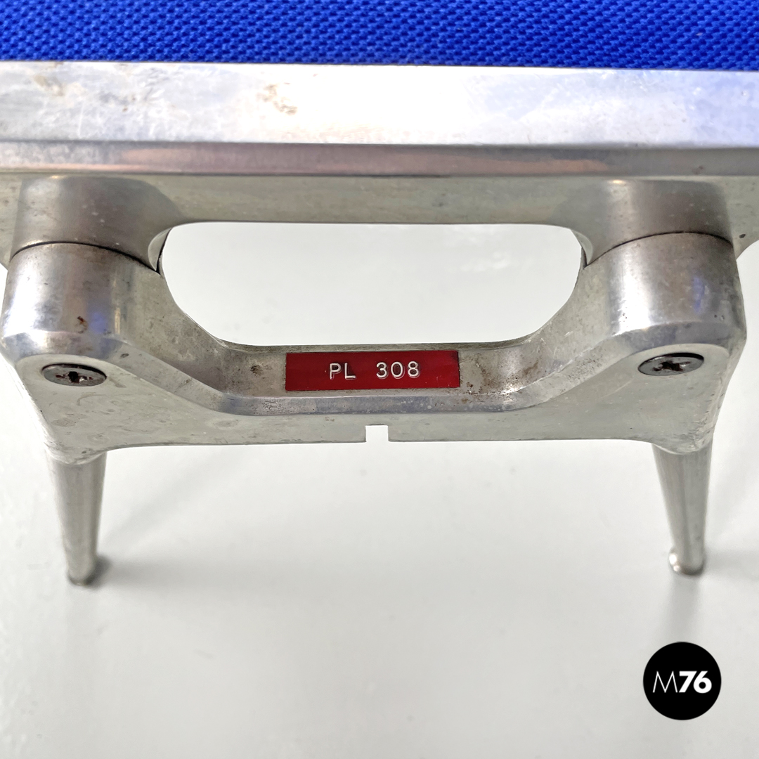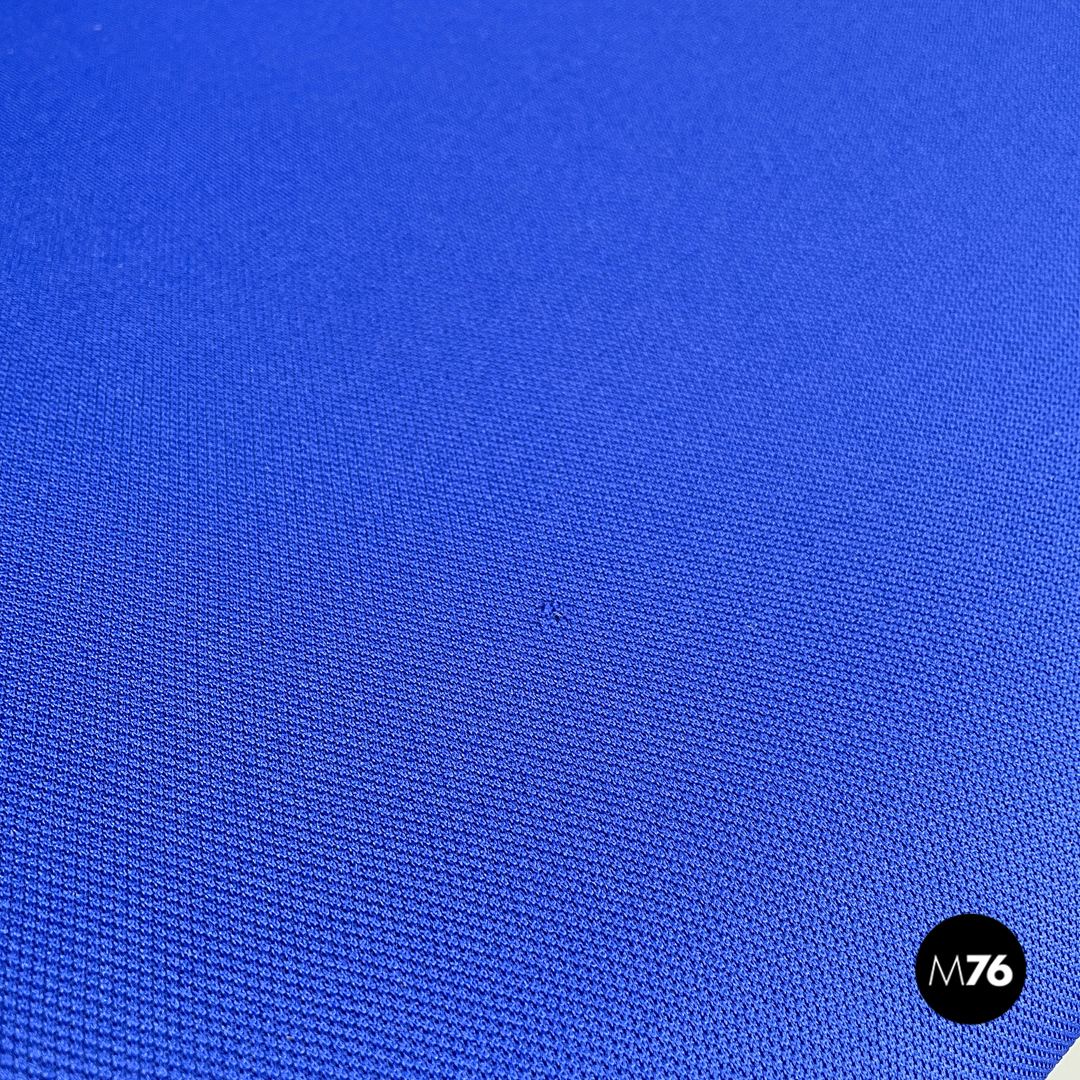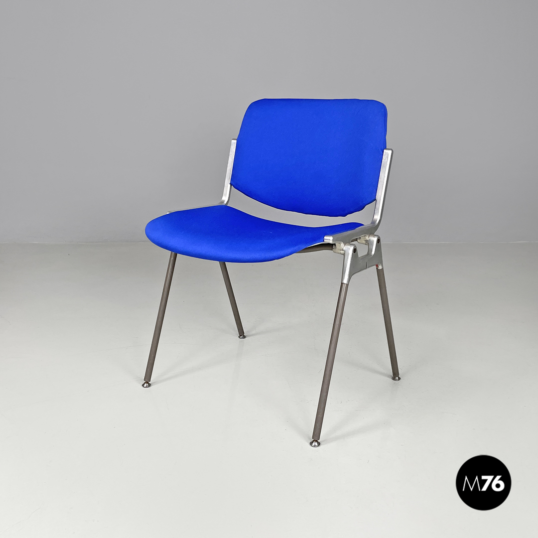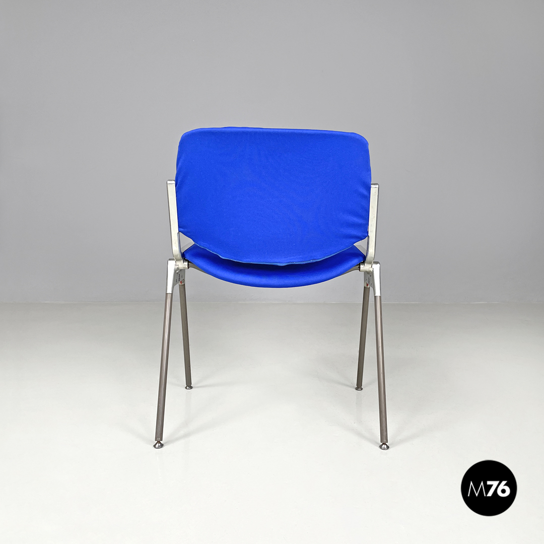 Set di sei sedie modello DSC impilabili imbottite e rivestite in tessuto blu elettrico con seduta e schienale rettangolari con angoli arrotondati. La struttura robusta è in alluminio con gambe a sezione tonda rivestite in plastica grigia con piedini tondi sempre in alluminio.