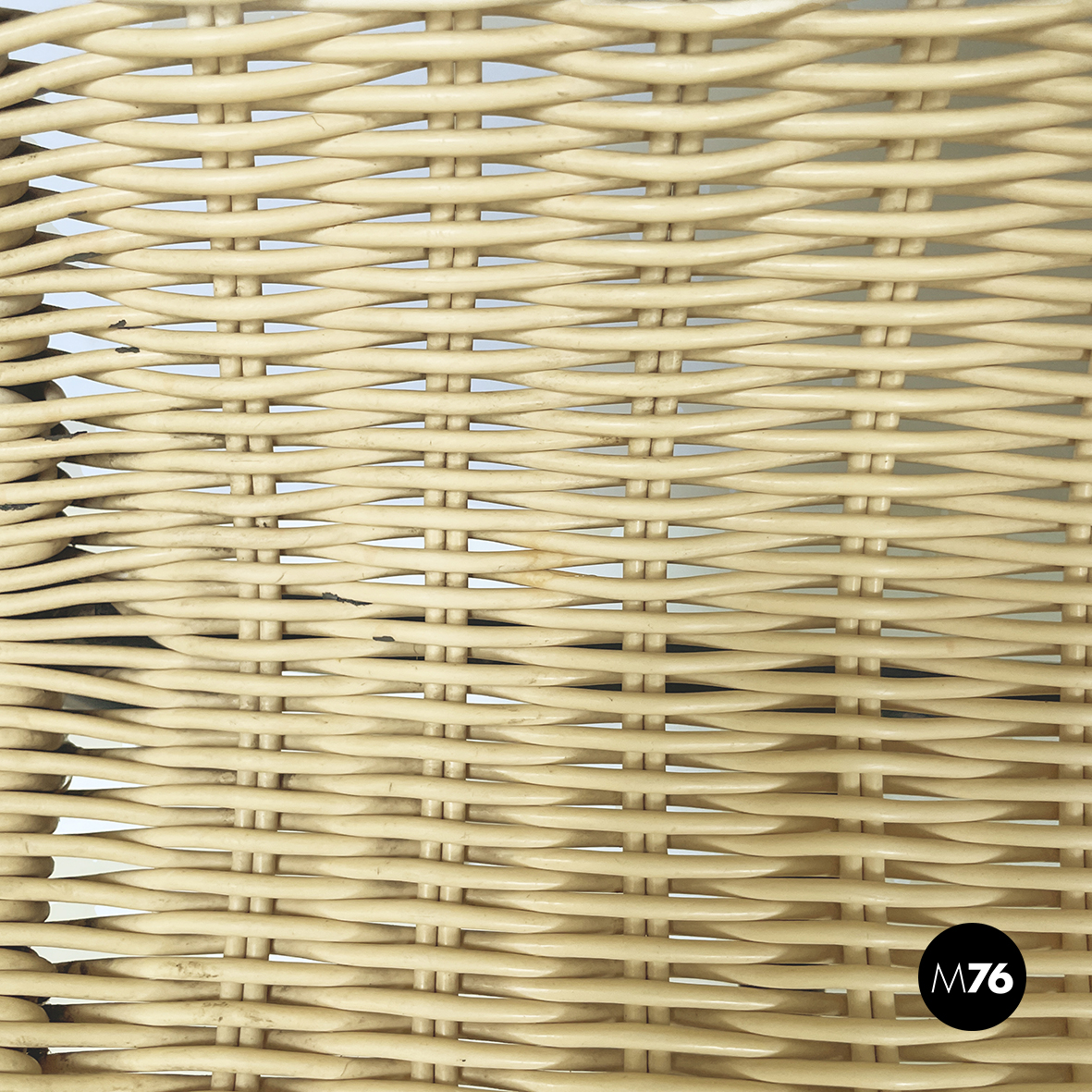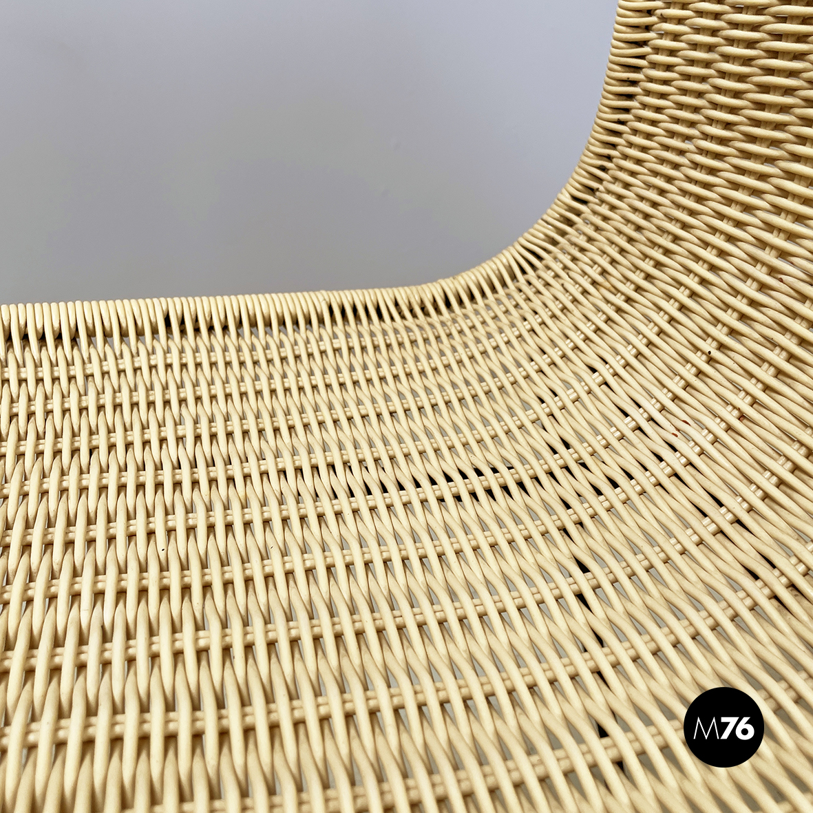 Coppia di sedie modello Du 40 con seduta e schienale curvati in filo intrecciato di plastica gialla. La struttura è in tondino di d’acciaio verniciato nero. Piedini tondi in ottone.