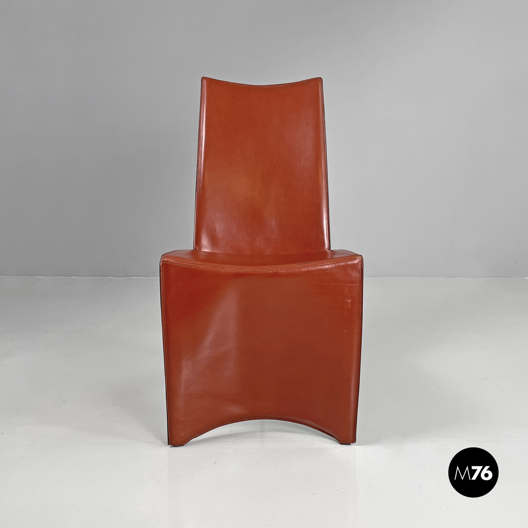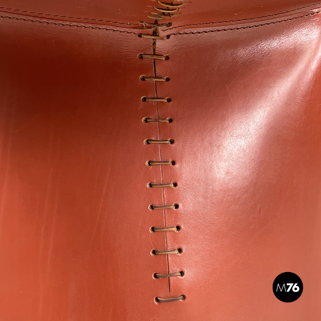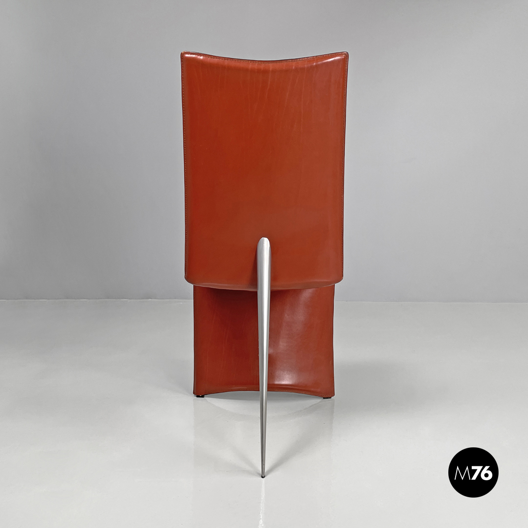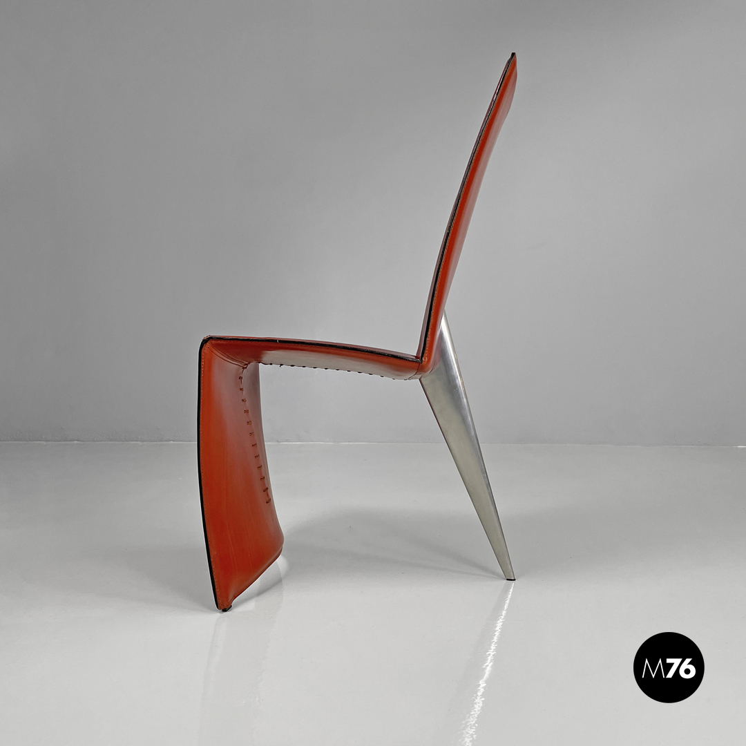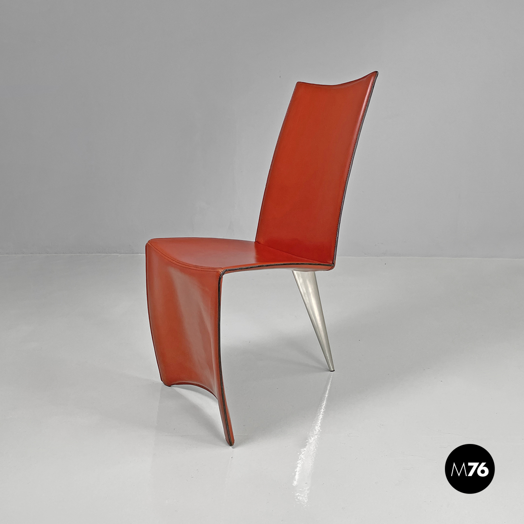 Coppia di sedie modello Ed Archer in pelle rossa. La struttura principale si modella a formare schienale seduta e supporto d’appoggio frontale disegnando una linea essenziale e leggermente tondeggiante. Sul retro in corrispondenza della “piega” tra schienale e seduta si trova la gamba posteriore in metallo dalla forma conica e che si sviluppa in diagonale verso l’esterno della seduta. Nella parte sottostante la seduta e l’appoggio a terra frontale si trova una cucitura decorativa composta da lacci di pelle.