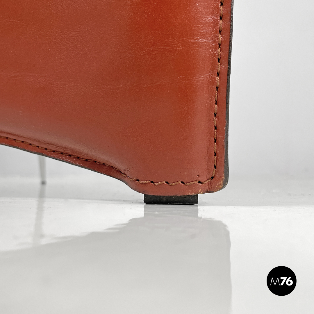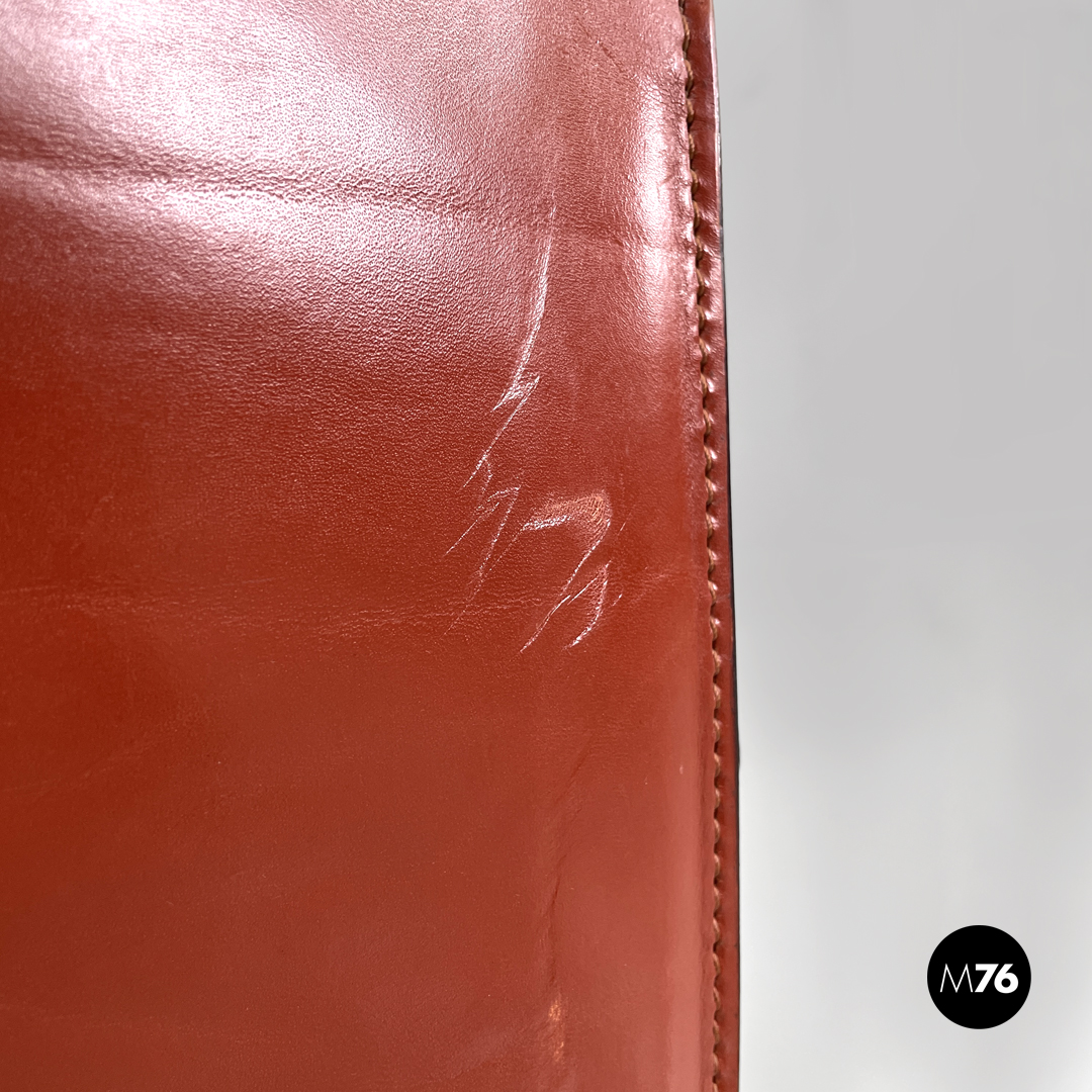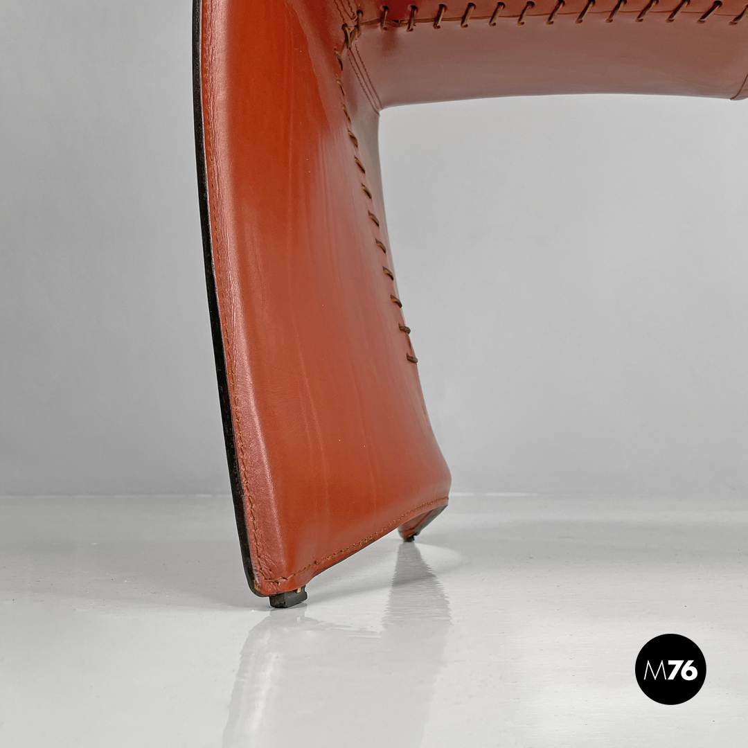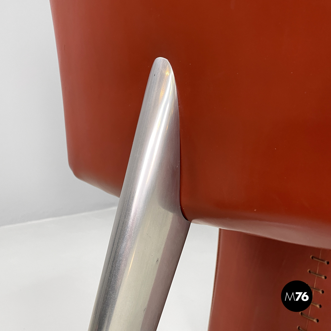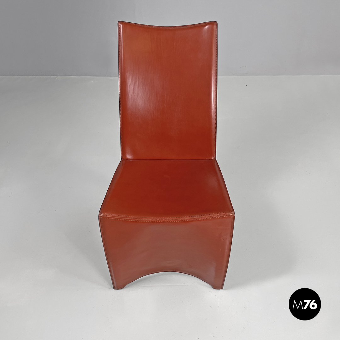 Coppia di sedie modello Ed Archer in pelle rossa. La struttura principale si modella a formare schienale seduta e supporto d’appoggio frontale disegnando una linea essenziale e leggermente tondeggiante. Sul retro in corrispondenza della “piega” tra schienale e seduta si trova la gamba posteriore in metallo dalla forma conica e che si sviluppa in diagonale verso l’esterno della seduta. Nella parte sottostante la seduta e l’appoggio a terra frontale si trova una cucitura decorativa composta da lacci di pelle.