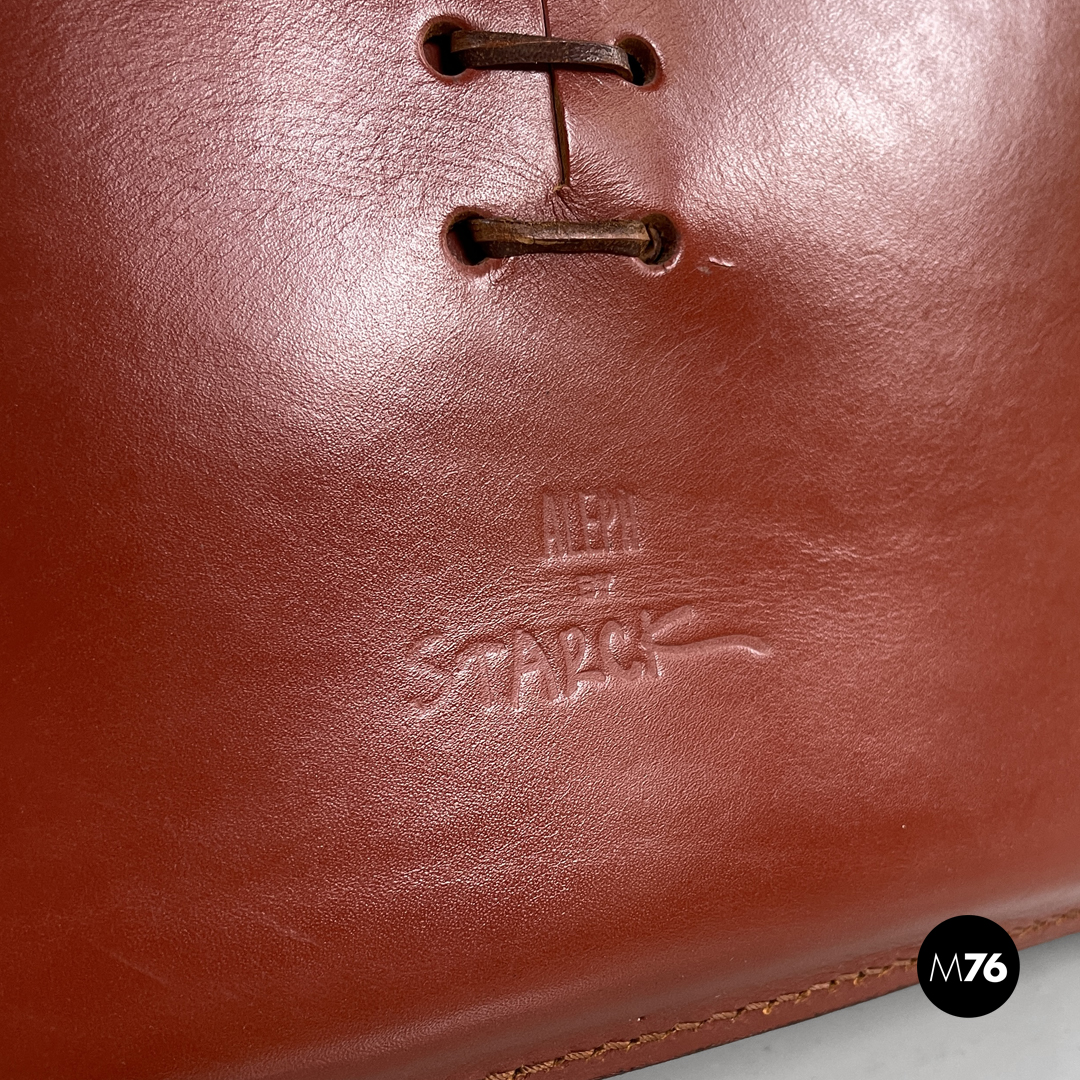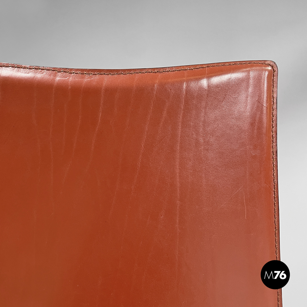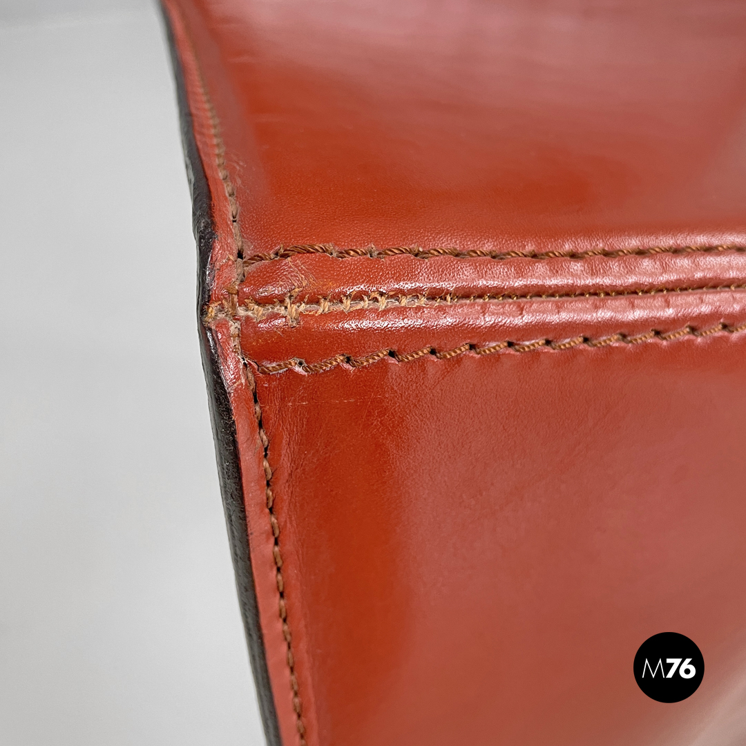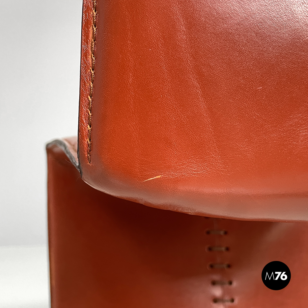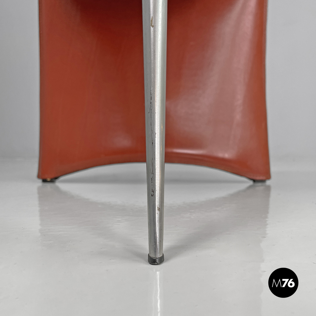 Coppia di sedie modello Ed Archer in pelle rossa. La struttura principale si modella a formare schienale seduta e supporto d’appoggio frontale disegnando una linea essenziale e leggermente tondeggiante. Sul retro in corrispondenza della “piega” tra schienale e seduta si trova la gamba posteriore in metallo dalla forma conica e che si sviluppa in diagonale verso l’esterno della seduta. Nella parte sottostante la seduta e l’appoggio a terra frontale si trova una cucitura decorativa composta da lacci di pelle.