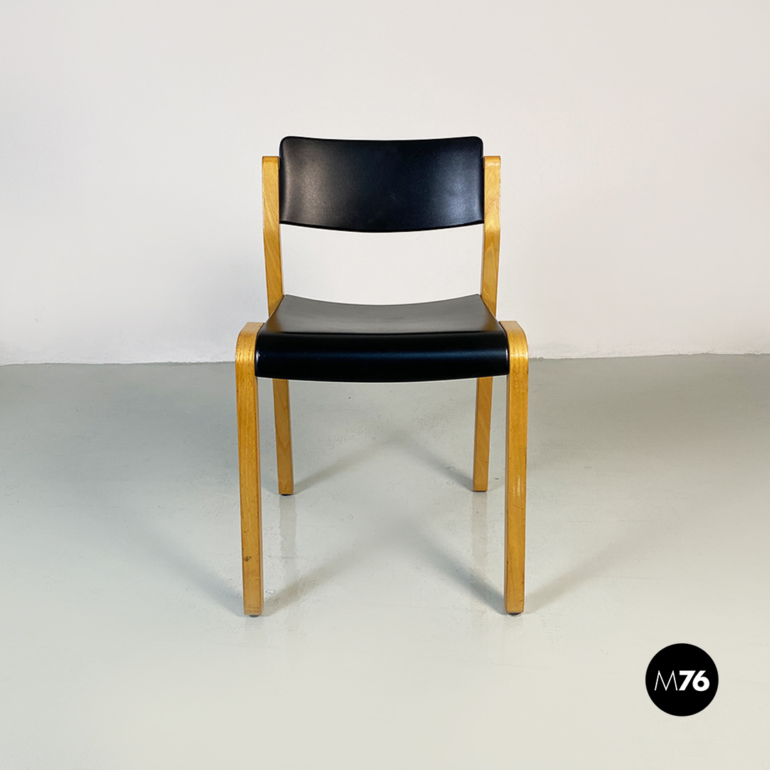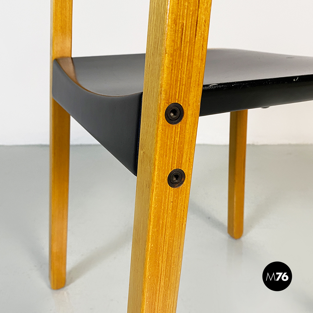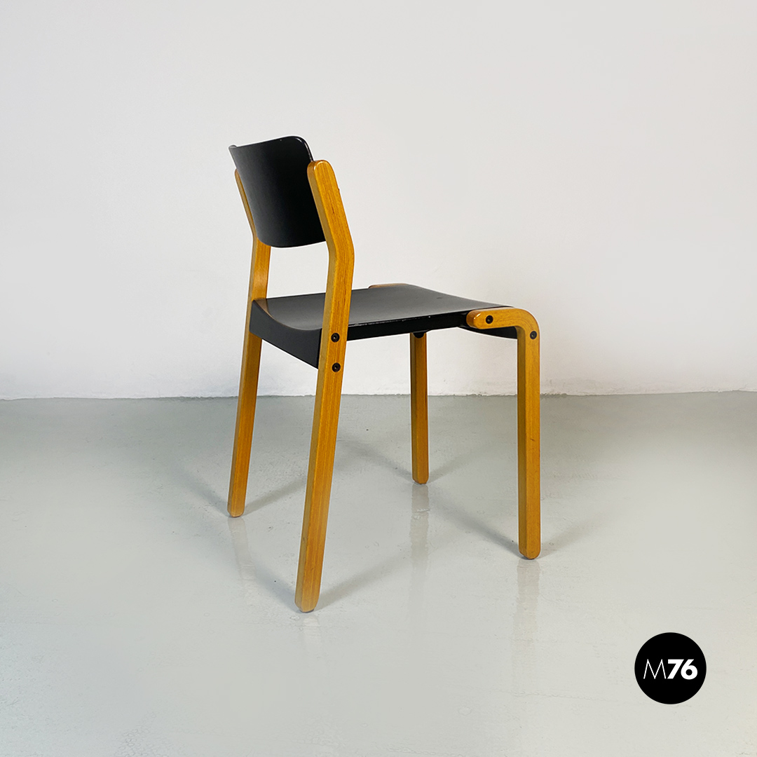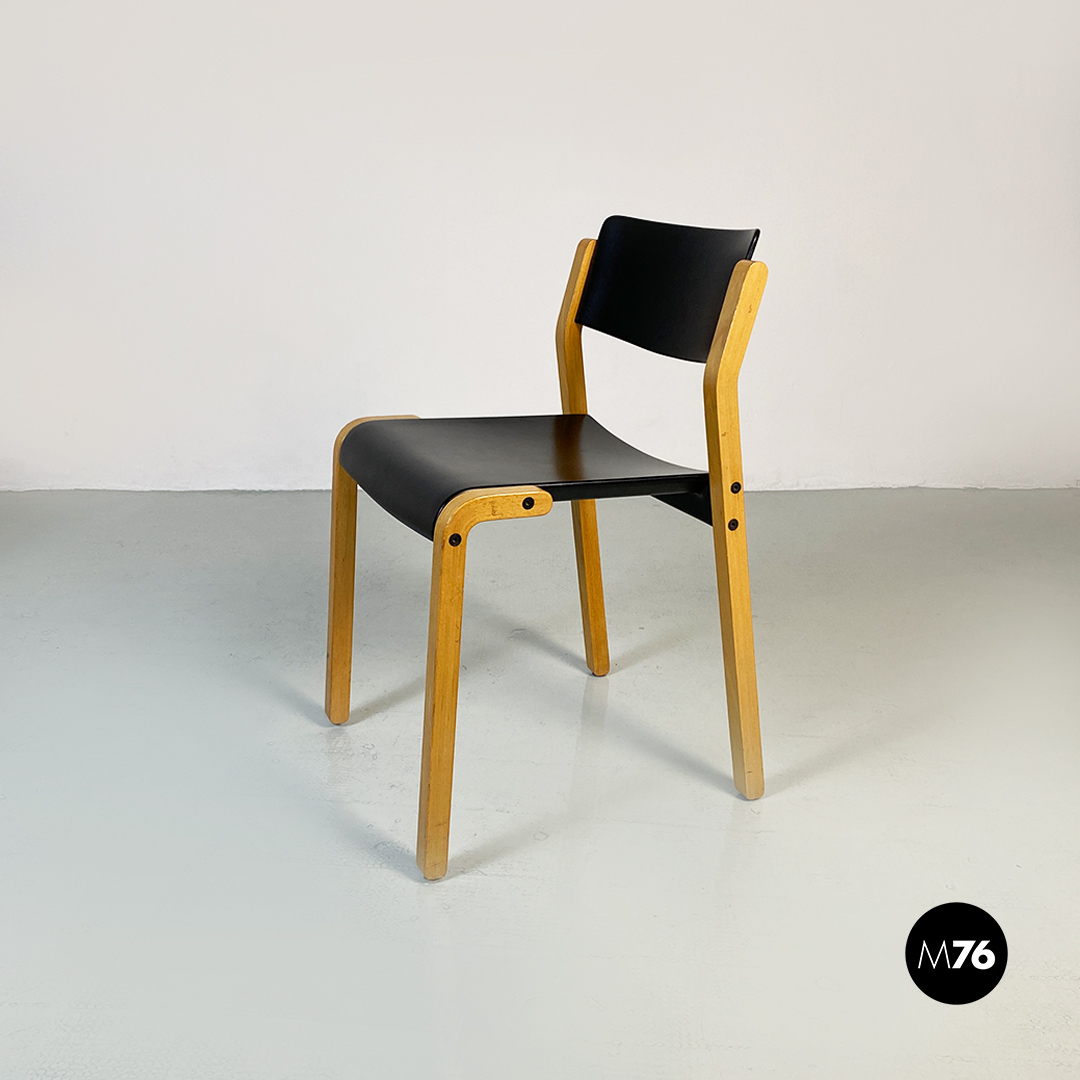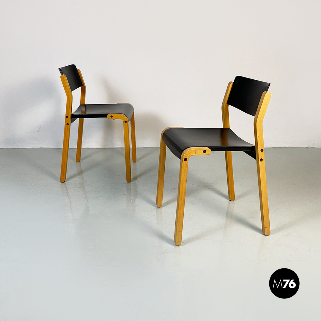Sedie modello Gruppo con struttura in legno chiaro con zampe a sezione quadrata e seduta e schienale curvati in legno nero.