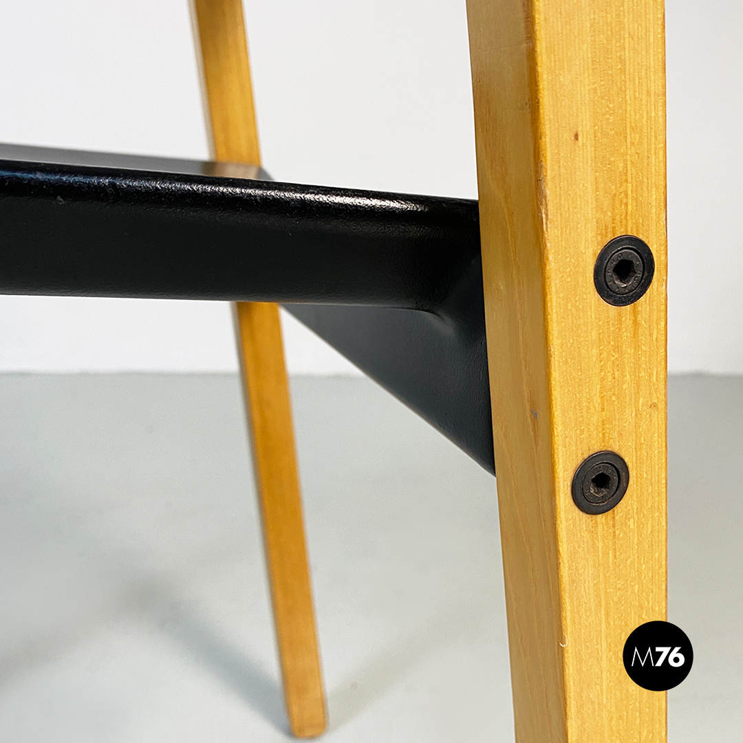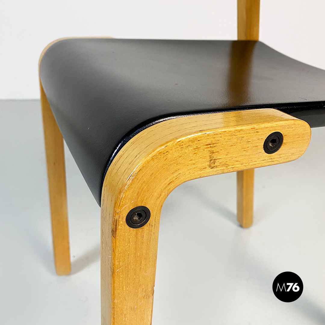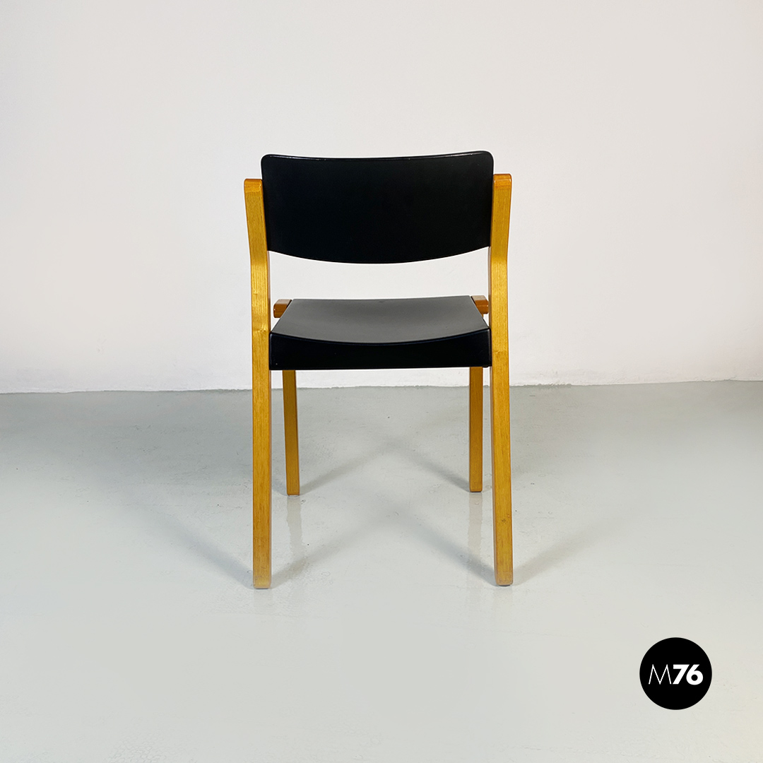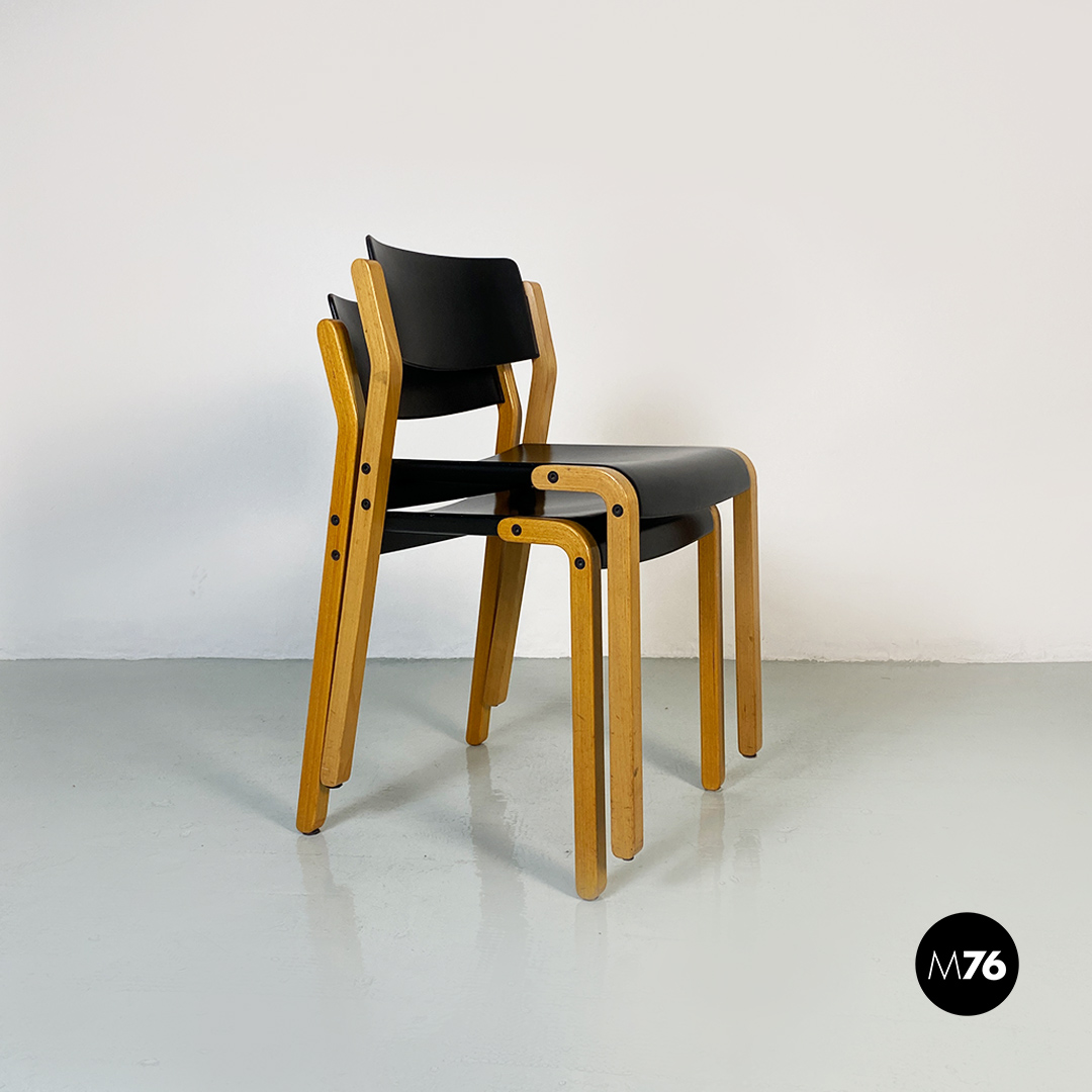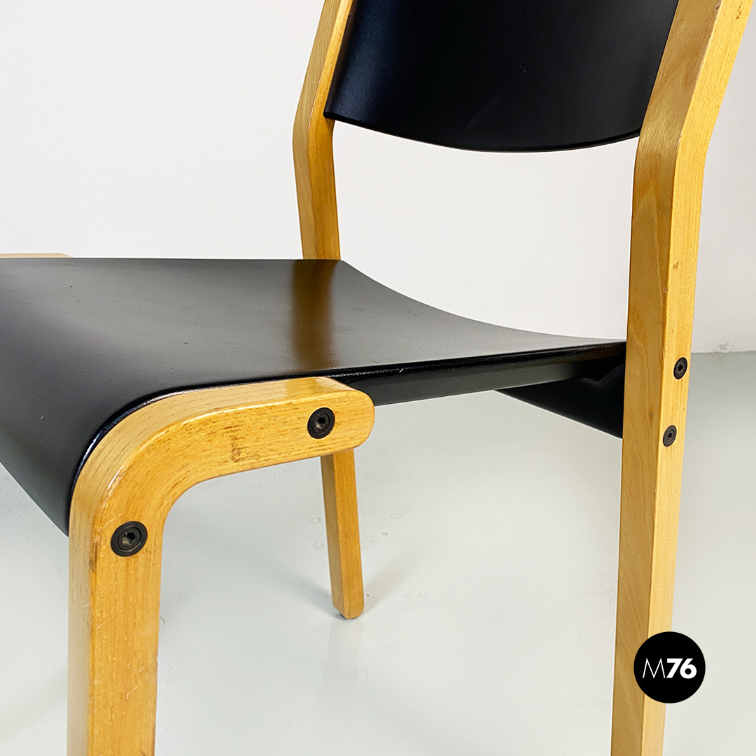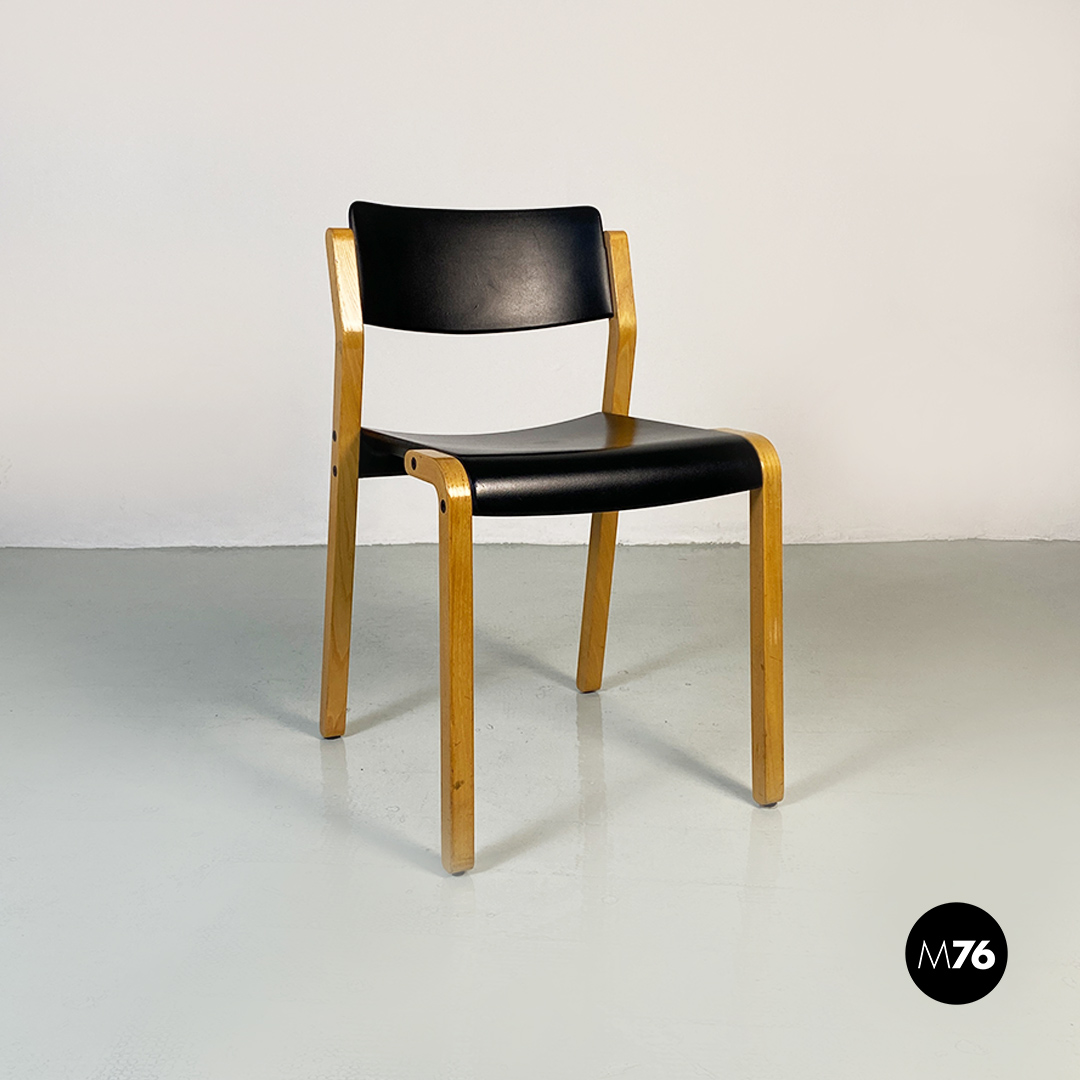 Sedie modello Gruppo con struttura in legno chiaro con zampe a sezione quadrata e seduta e schienale curvati in legno nero.