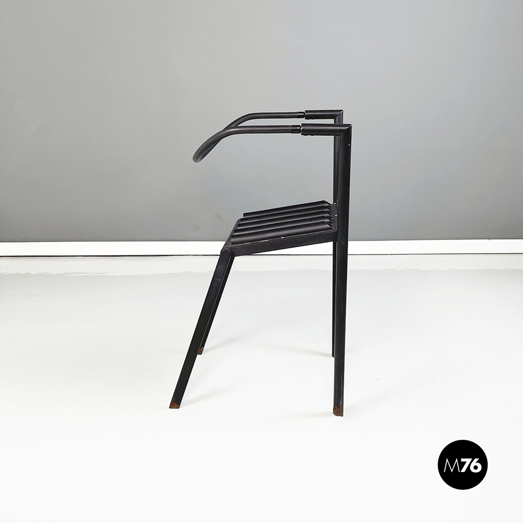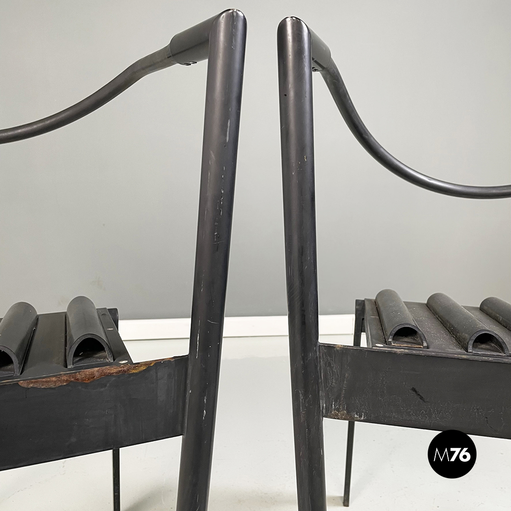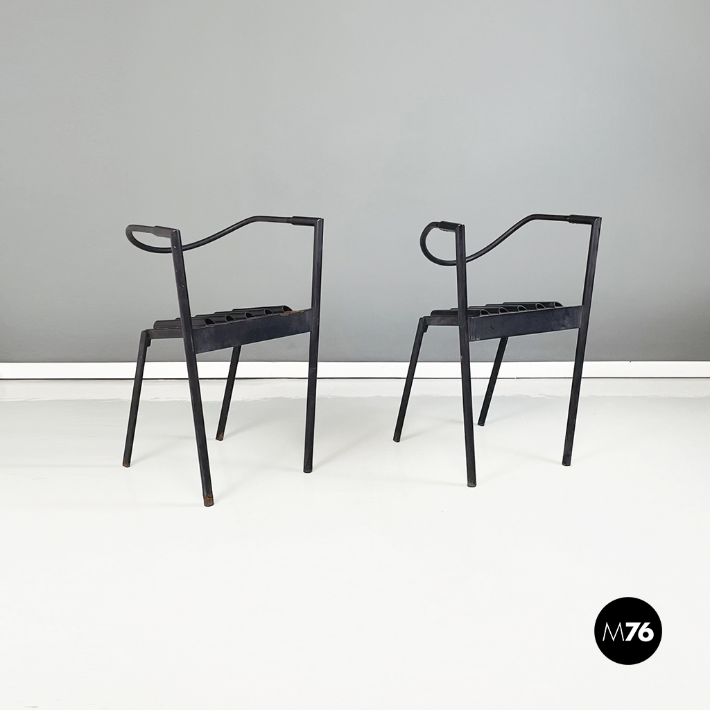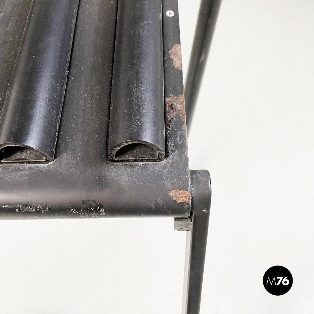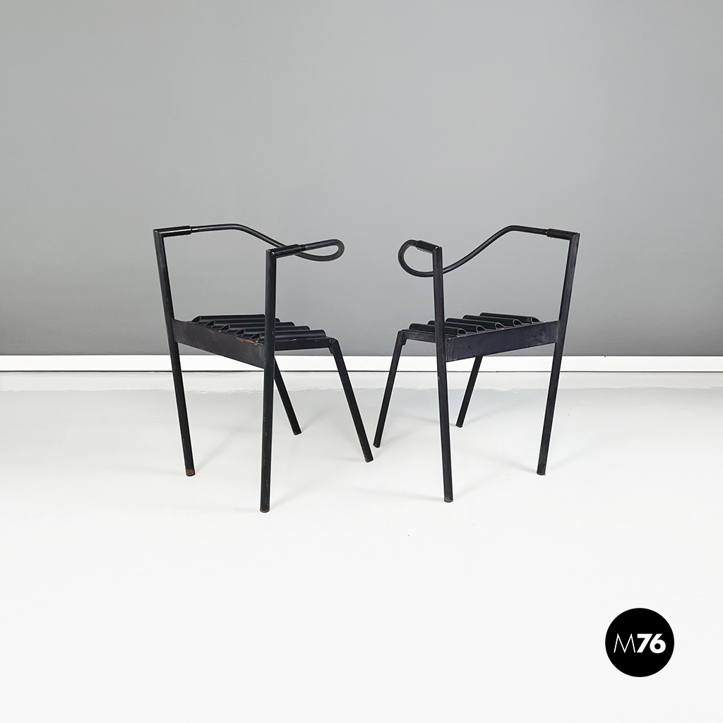 Coppia di sedie modello Hans e Alice in acciaio laccato nero. Lo schienale è composto da un tubo in gomma nera. La seduta è composta da una serie di semi-tubolari. Le zampe anteriori sono a sezione tonda mentre le posteriori sono a sezione rettangolare.