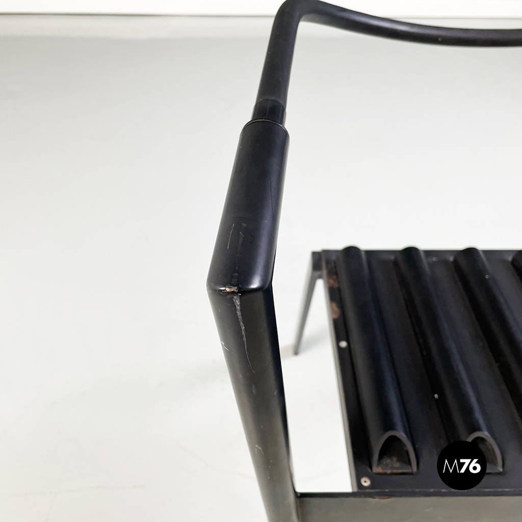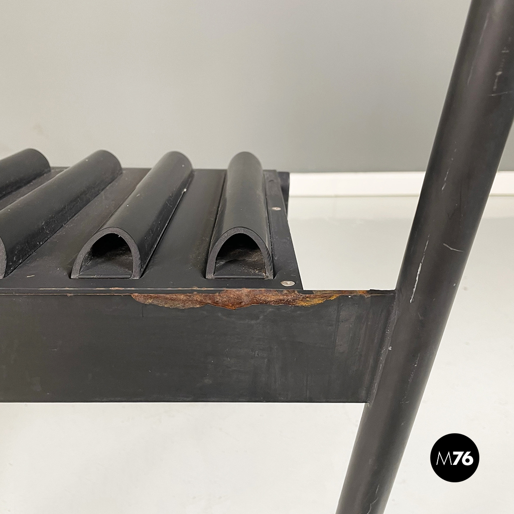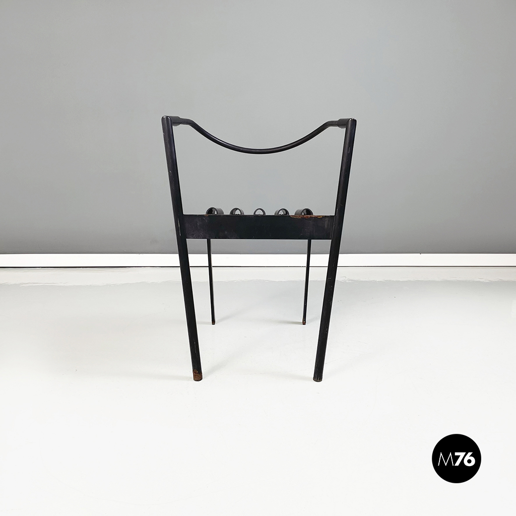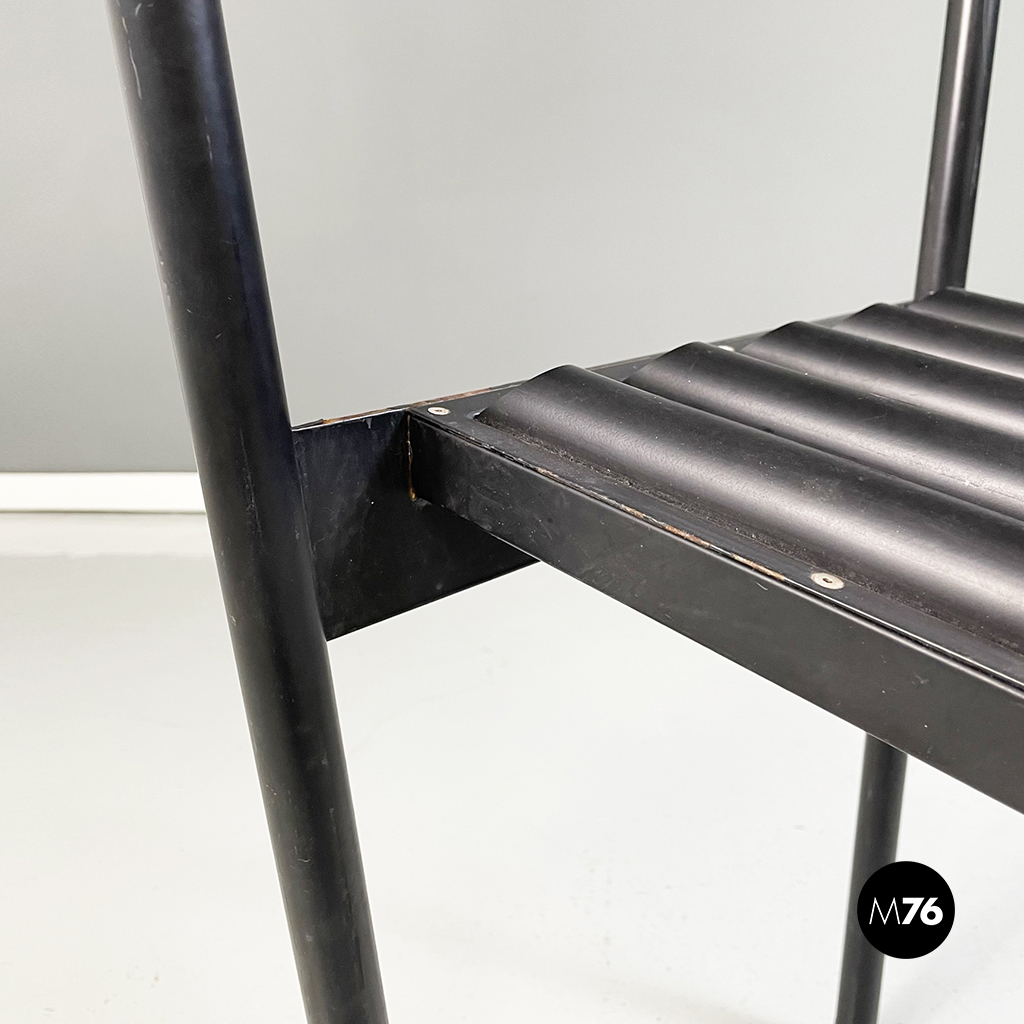 Coppia di sedie modello Hans e Alice in acciaio laccato nero. Lo schienale è composto da un tubo in gomma nera. La seduta è composta da una serie di semi-tubolari. Le zampe anteriori sono a sezione tonda mentre le posteriori sono a sezione rettangolare.