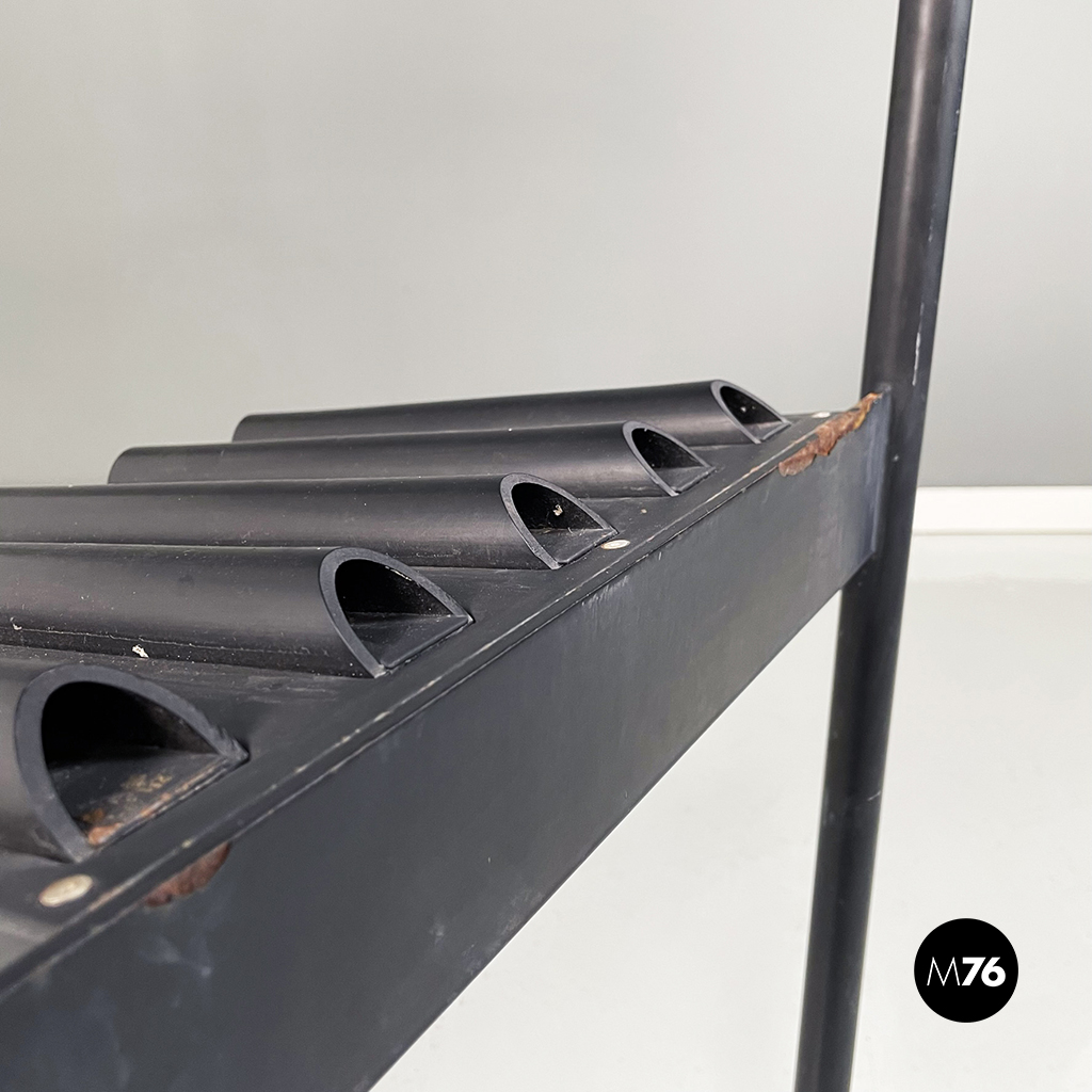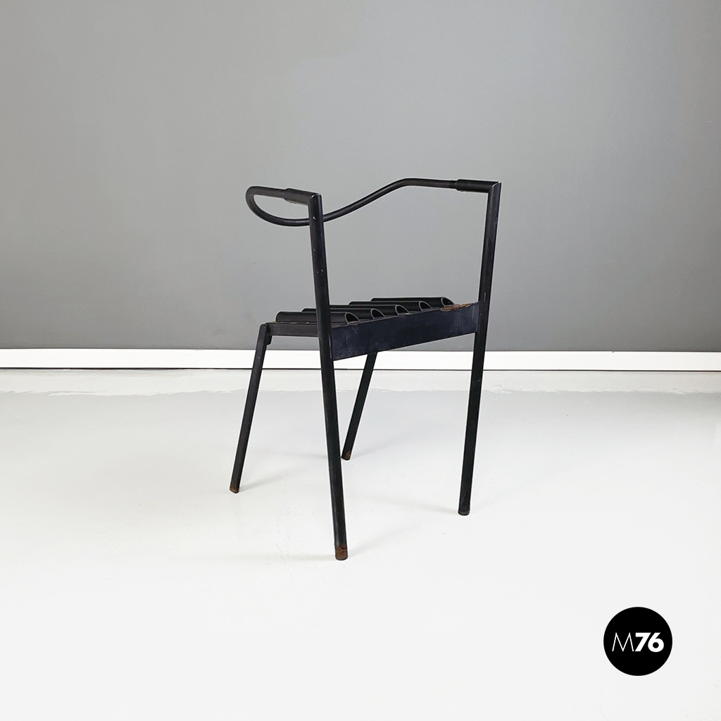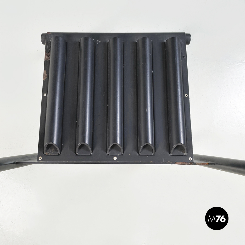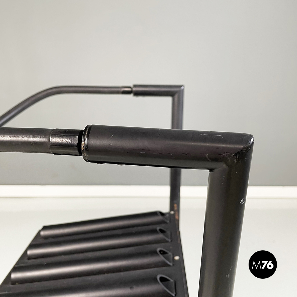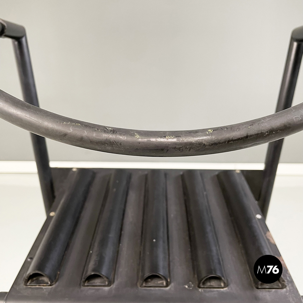 Coppia di sedie modello Hans e Alice in acciaio laccato nero. Lo schienale è composto da un tubo in gomma nera. La seduta è composta da una serie di semi-tubolari. Le zampe anteriori sono a sezione tonda mentre le posteriori sono a sezione rettangolare.