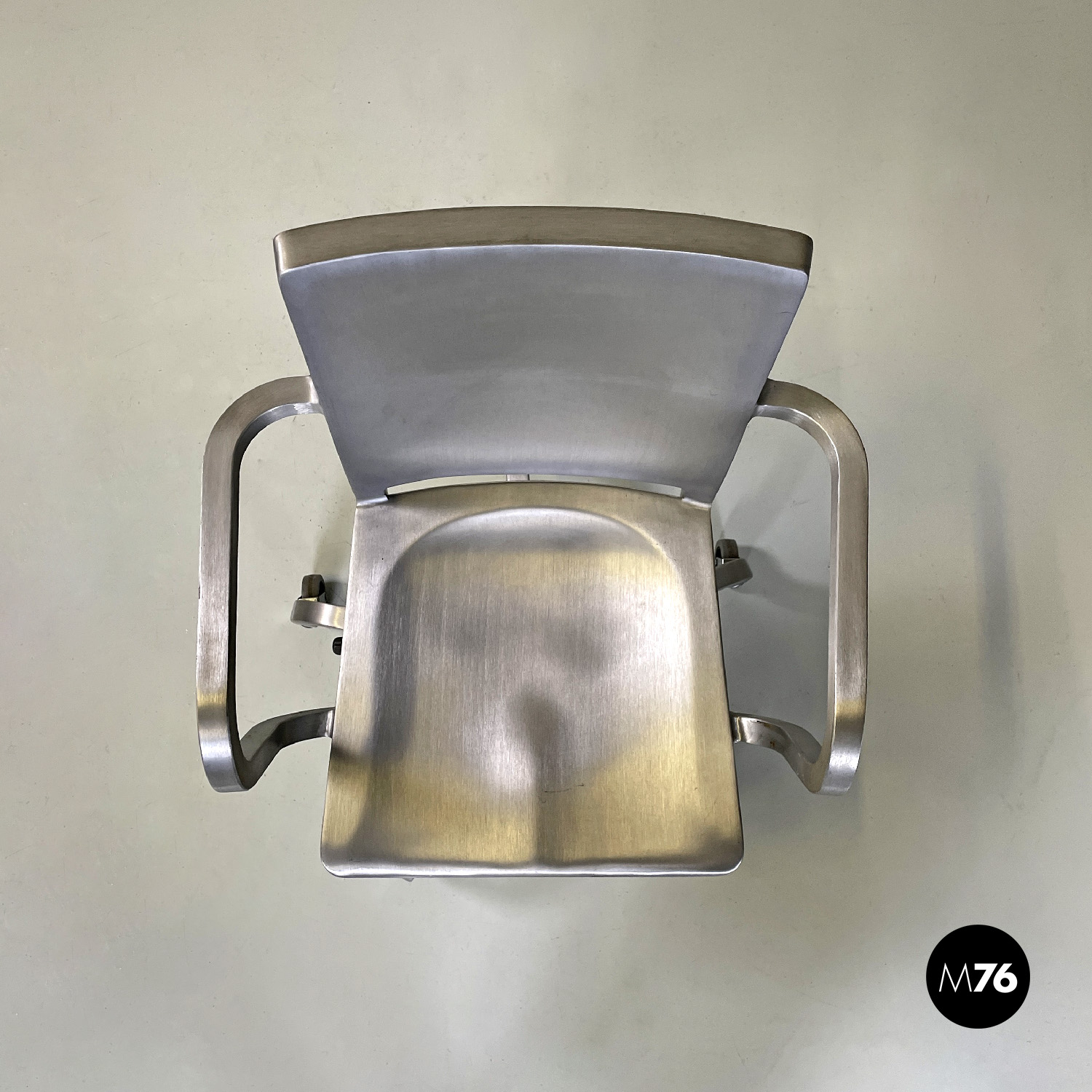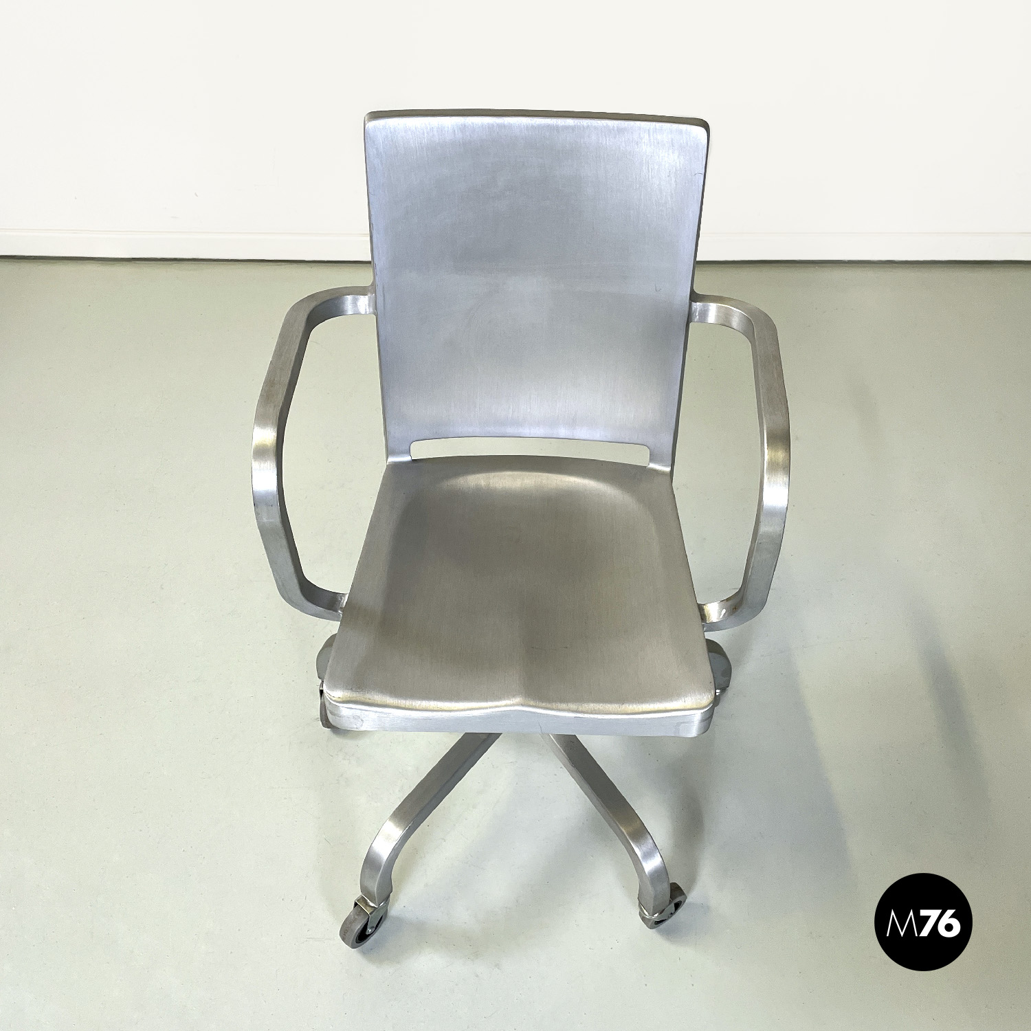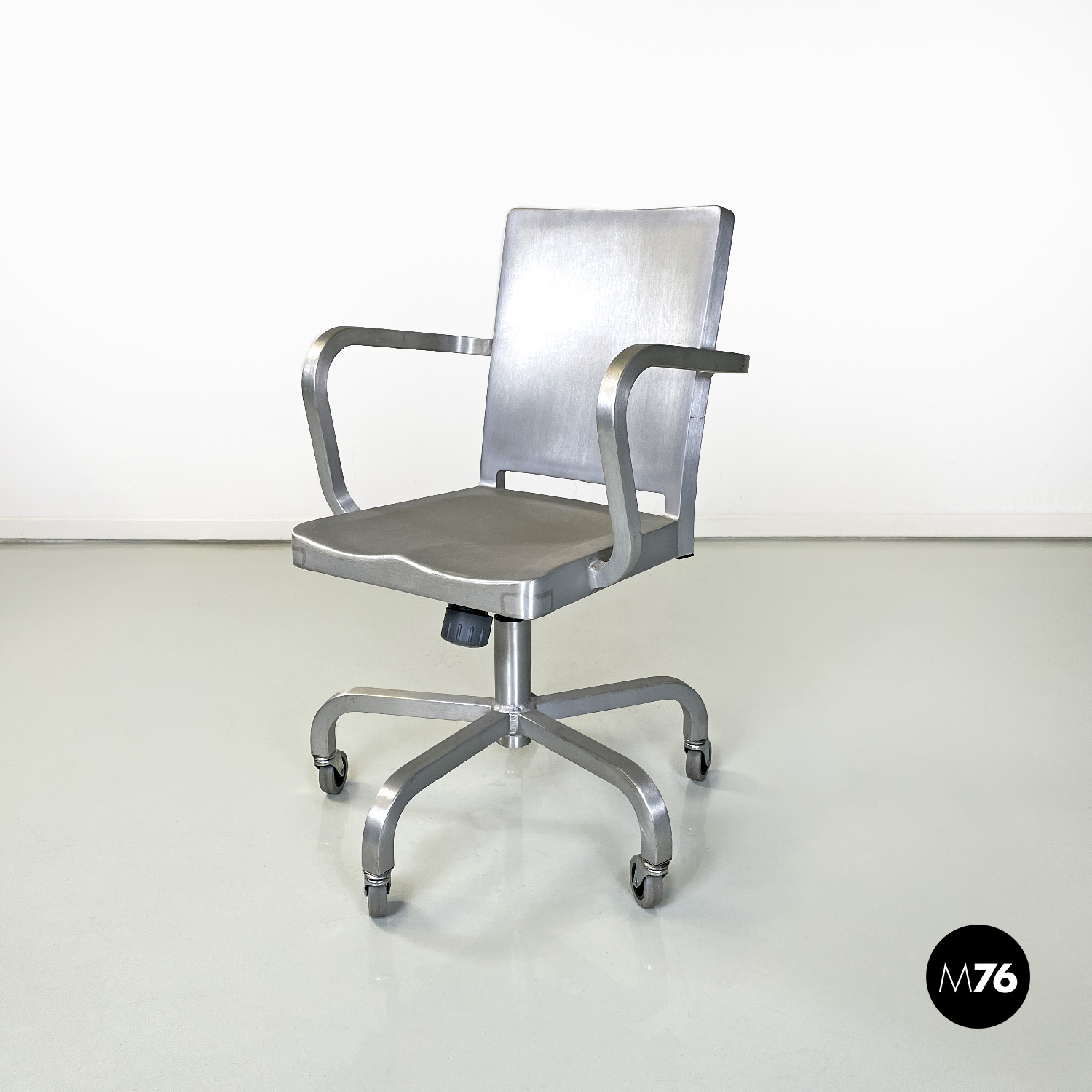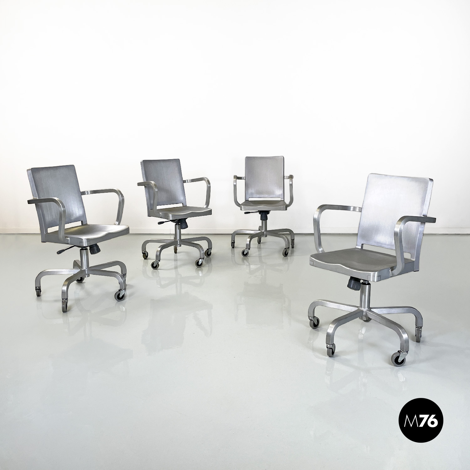 Set di quattro sedie modello Hudson interamente in alluminio spazzolato con braccioli e con lo schienale e la seduta leggermente sagomati. Dallo stelo centrale si estendono cinque razze a sezione quadrata che curvano verso il basso per terminare con una ruota ciascuna in plastica grigia. La sedia può essere modificata in altezza grazie a un meccanismo sotto la seduta.