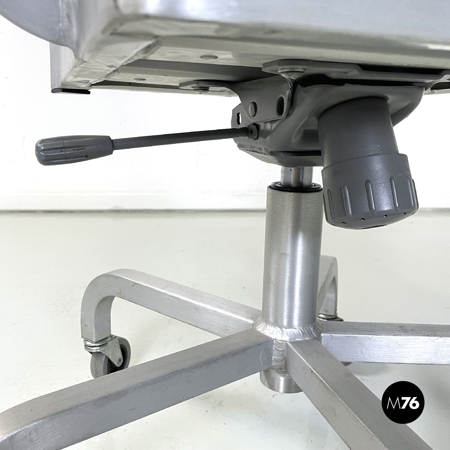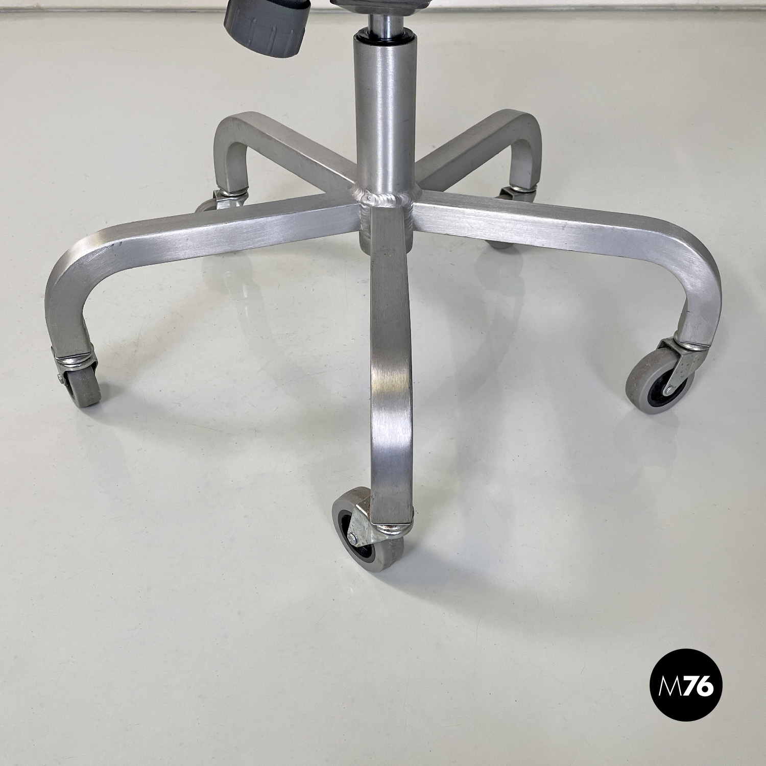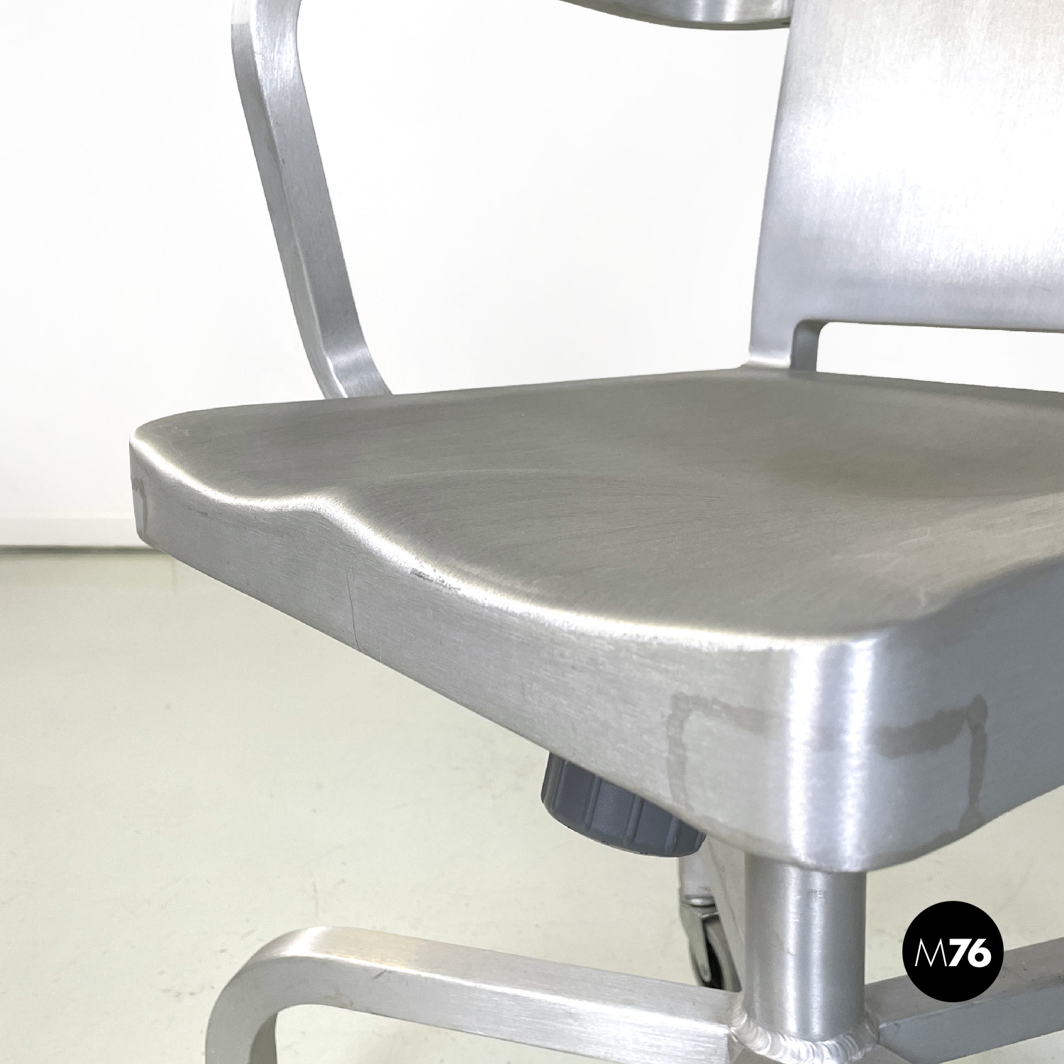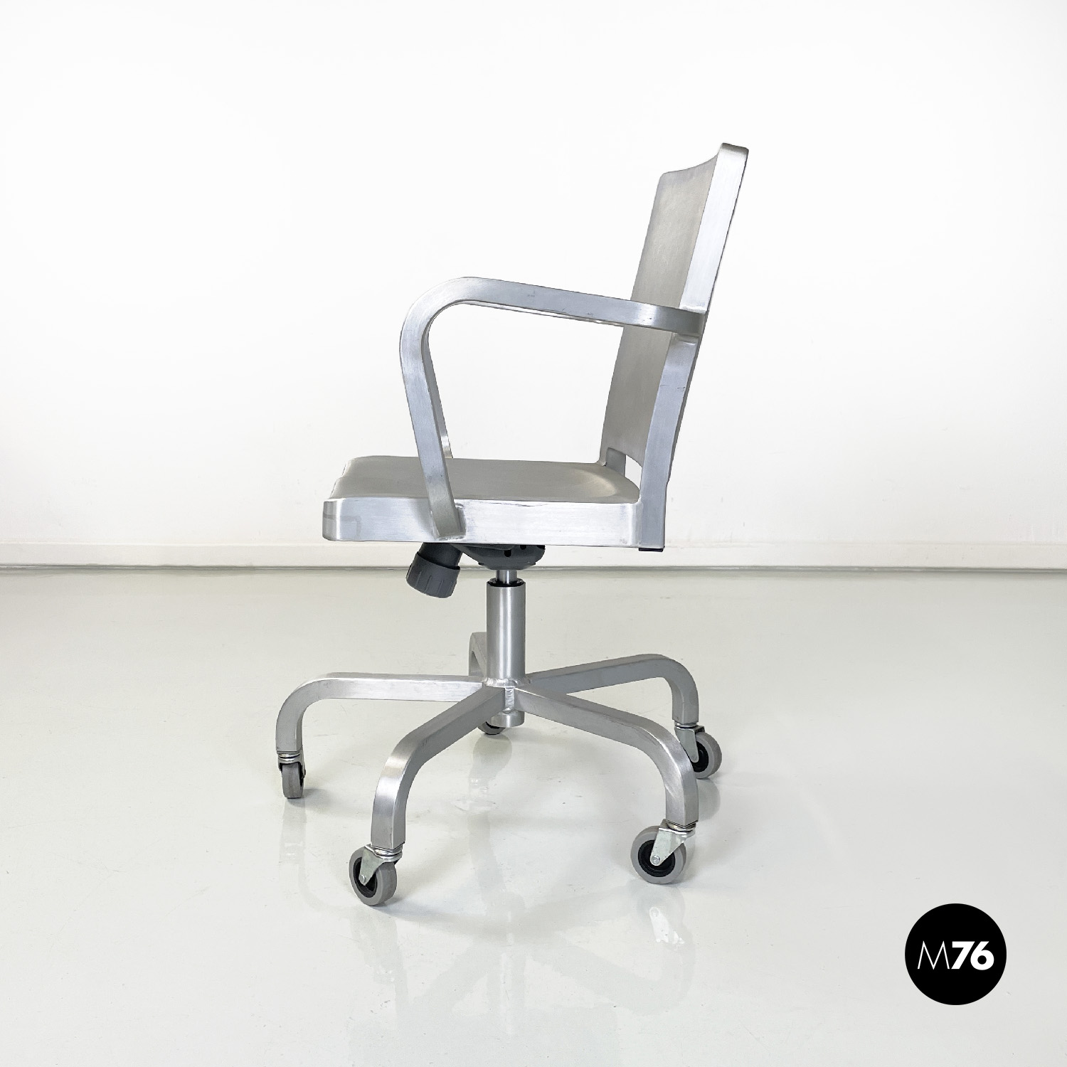 Set di quattro sedie modello Hudson interamente in alluminio spazzolato con braccioli e con lo schienale e la seduta leggermente sagomati. Dallo stelo centrale si estendono cinque razze a sezione quadrata che curvano verso il basso per terminare con una ruota ciascuna in plastica grigia. La sedia può essere modificata in altezza grazie a un meccanismo sotto la seduta.