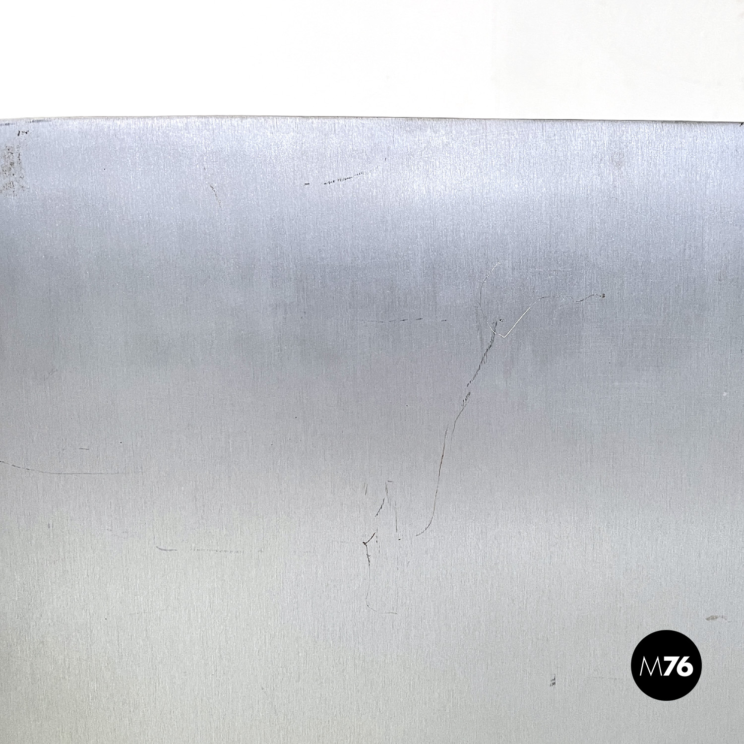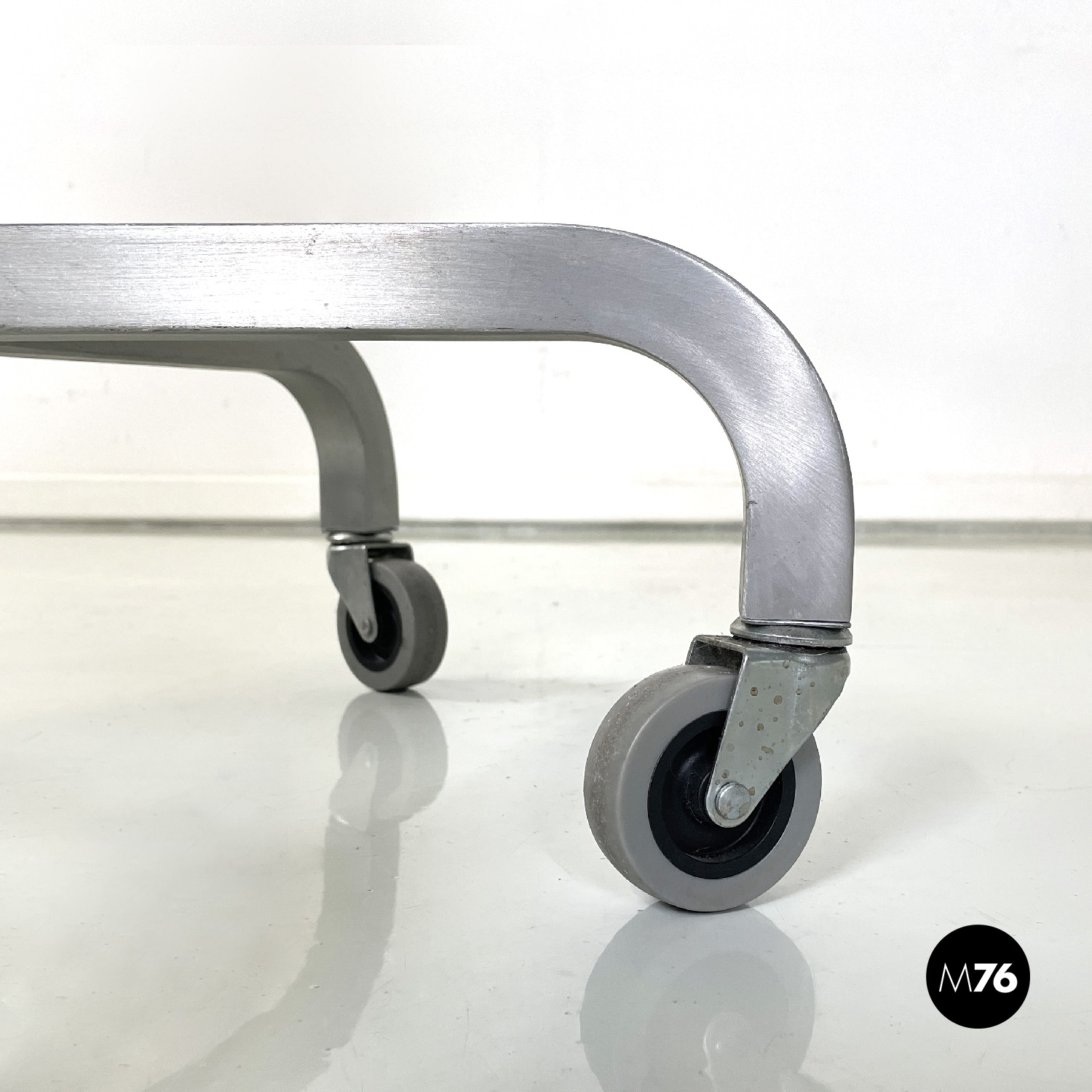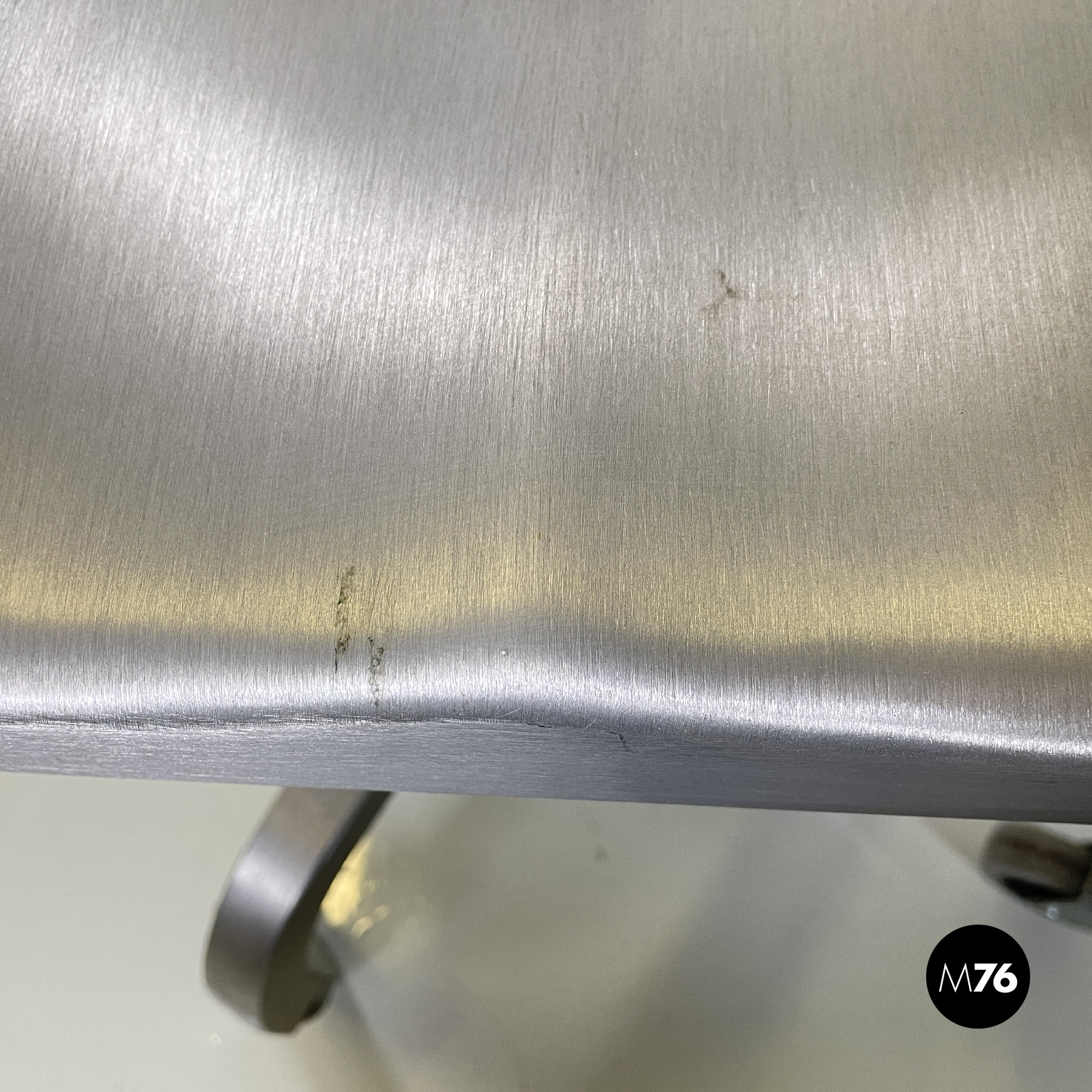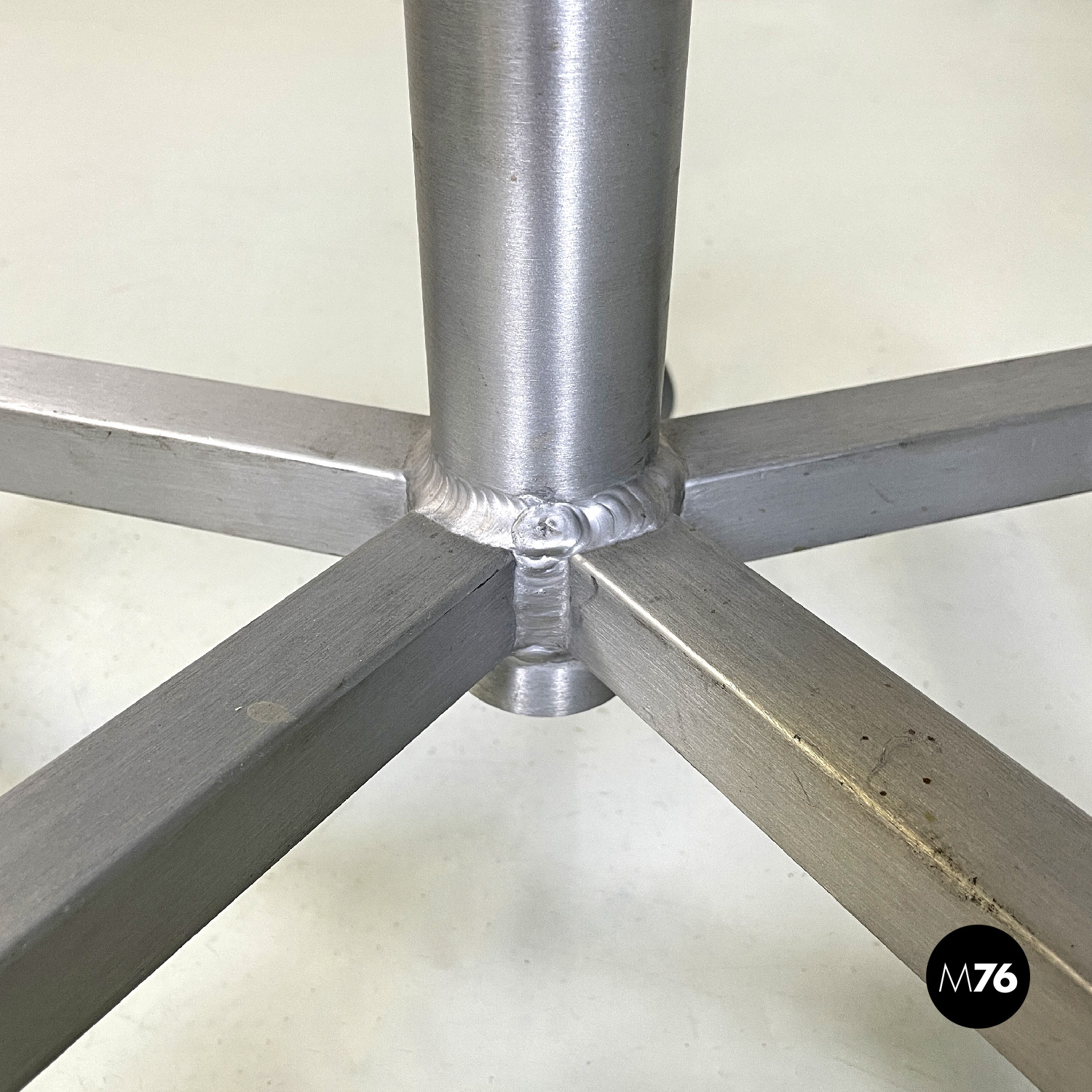 Set di quattro sedie modello Hudson interamente in alluminio spazzolato con braccioli e con lo schienale e la seduta leggermente sagomati. Dallo stelo centrale si estendono cinque razze a sezione quadrata che curvano verso il basso per terminare con una ruota ciascuna in plastica grigia. La sedia può essere modificata in altezza grazie a un meccanismo sotto la seduta.