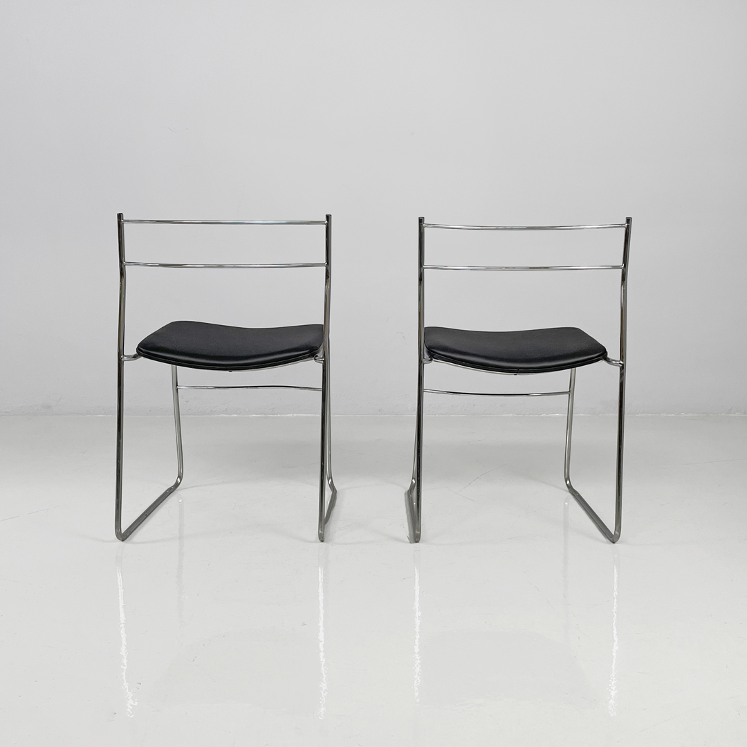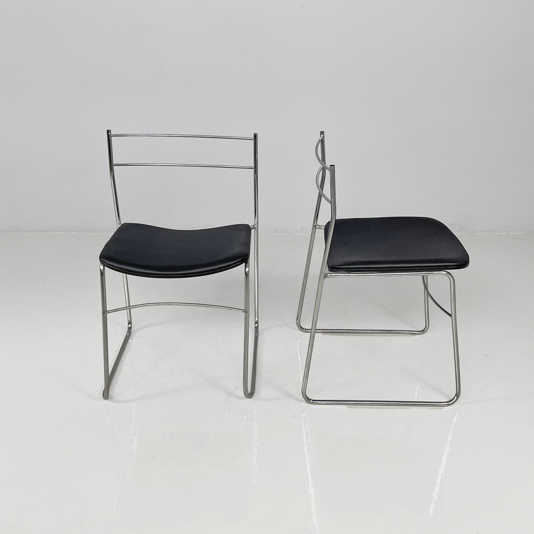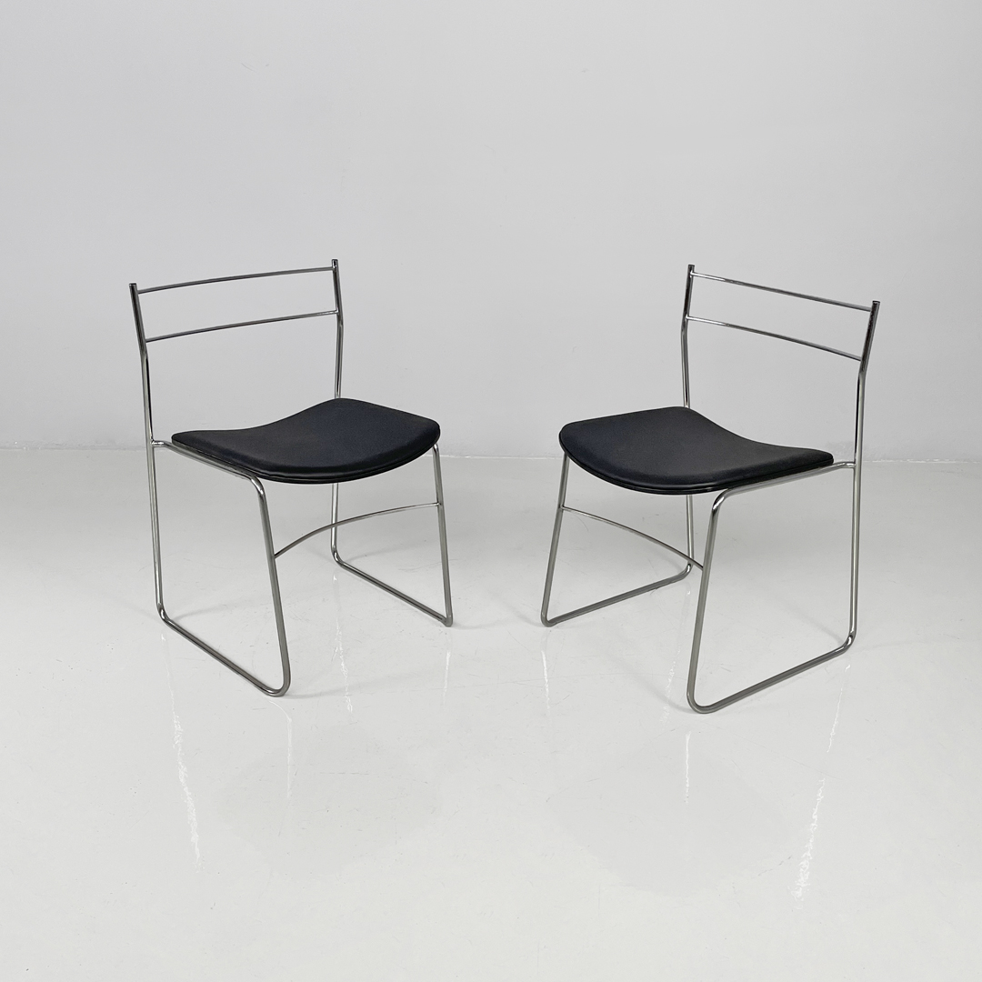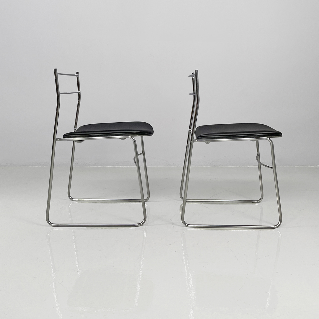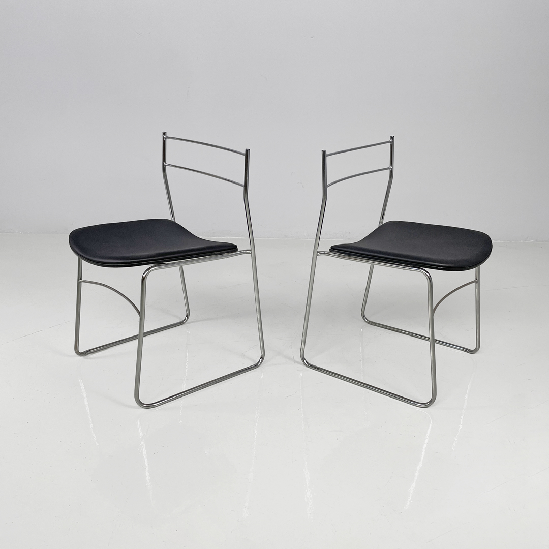 Coppia di sedie in metallo e pelle nera. La struttura è costituita da tondino di acciaio cromato. La seduta è in similpelle di colore nero opaco.