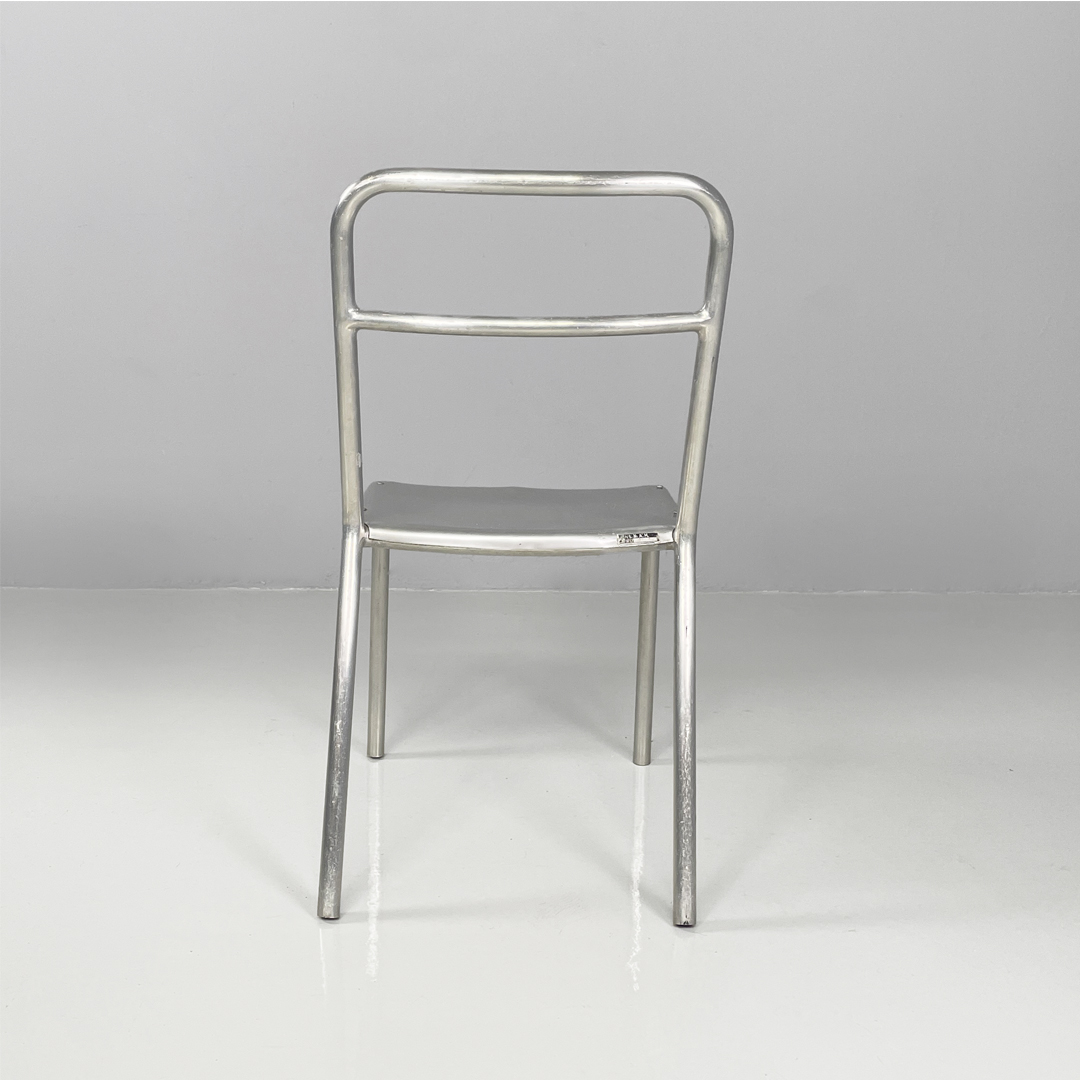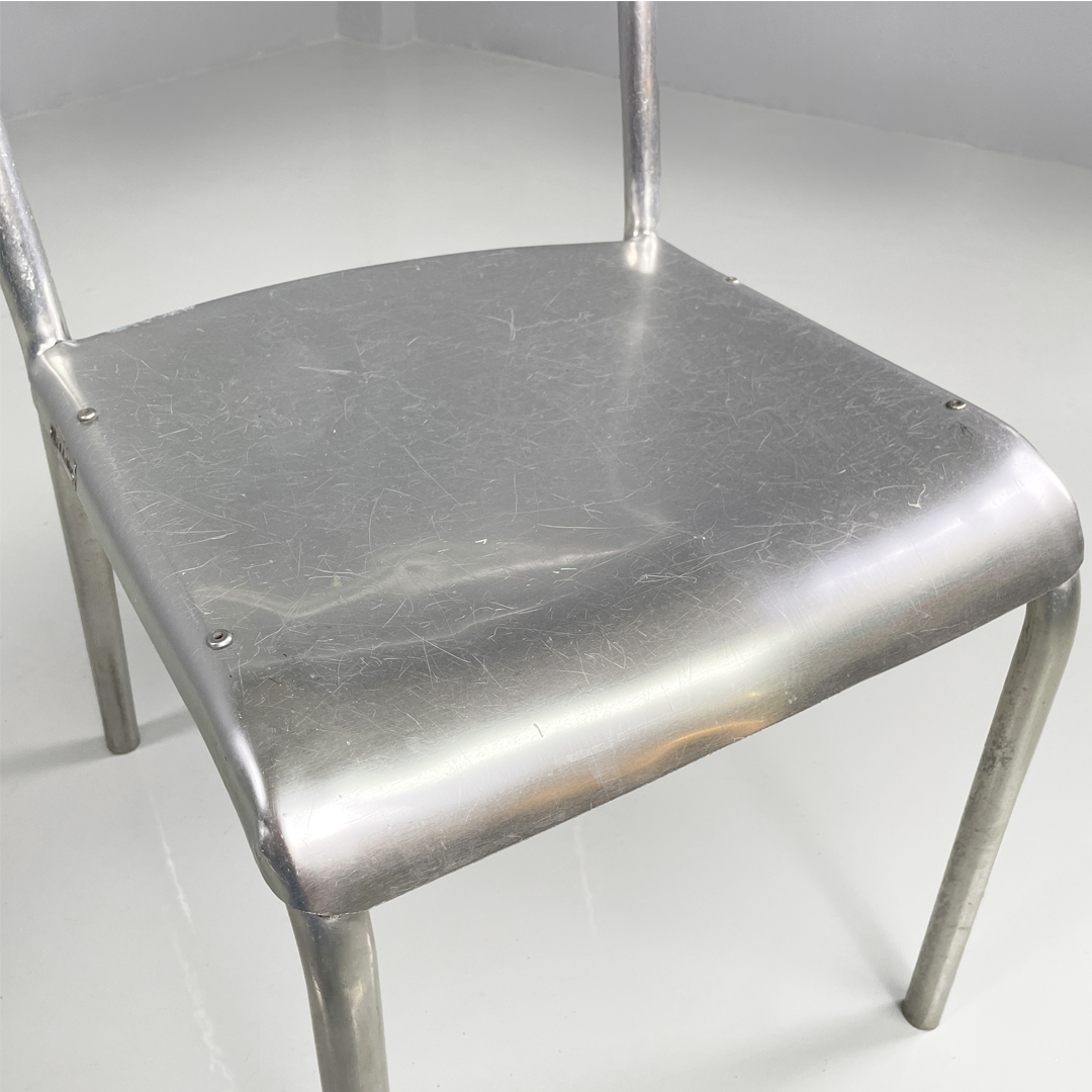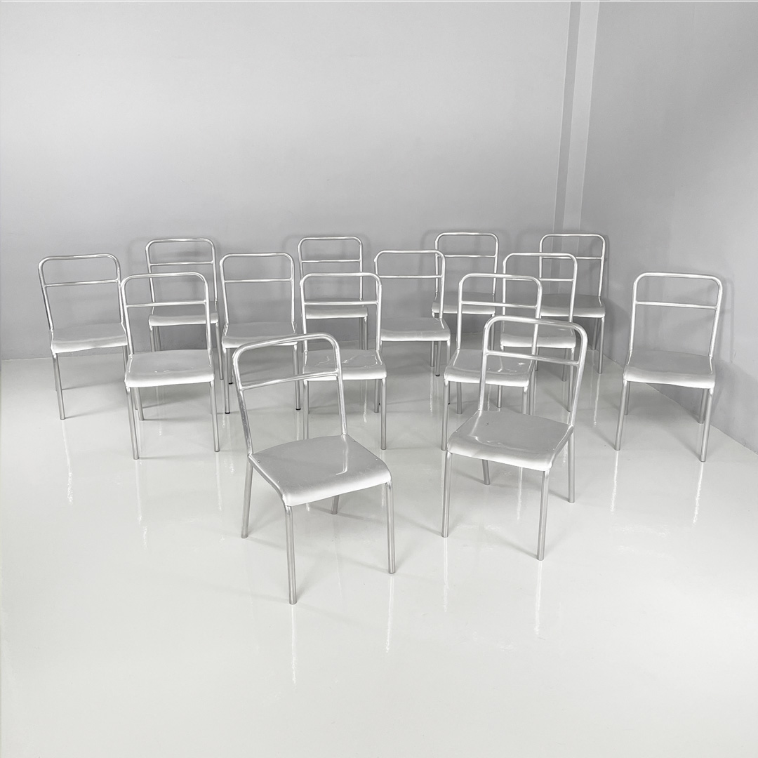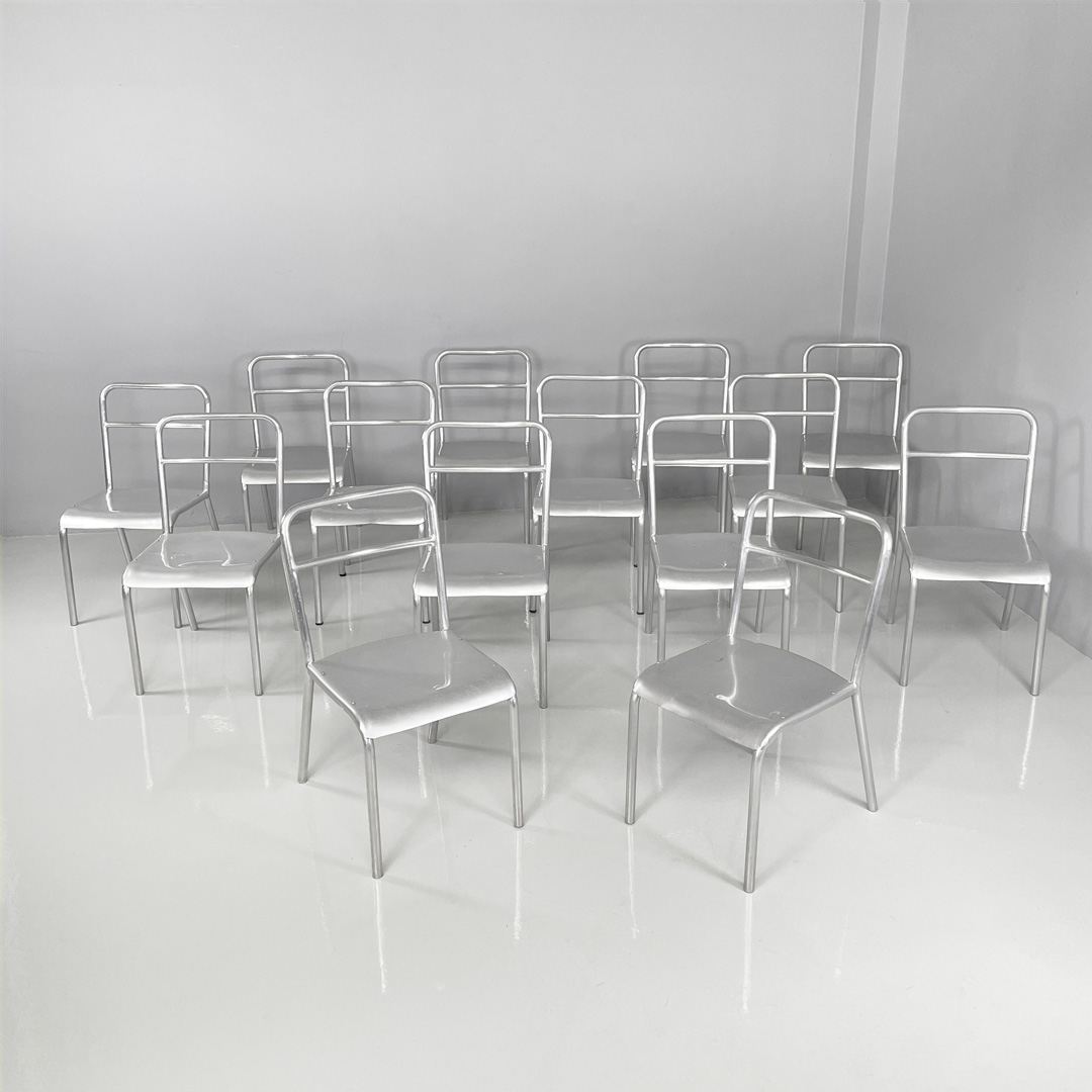 Set di 14 sedie in alluminio. Le zampe sono a sezione tonda con piedini neri in gomma.