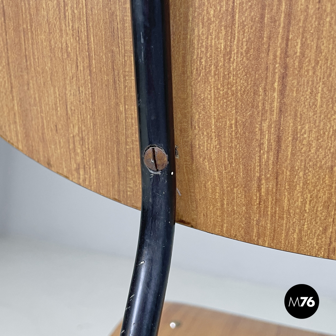Set di sei sedie in formica marrone con decorazioni che richiamano la texture del legno. Lo schienale è di forma ovale mentre la seduta è di forma triangolare con angoli stondati. La struttura è in tondino di metallo verniciato nero con piedini in plastica nera. Le sedie sono impilabili.