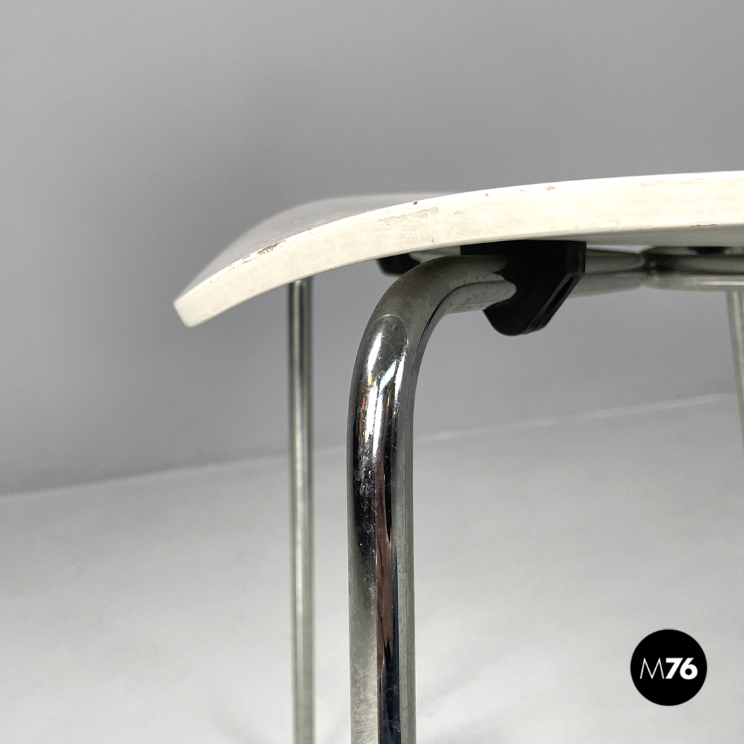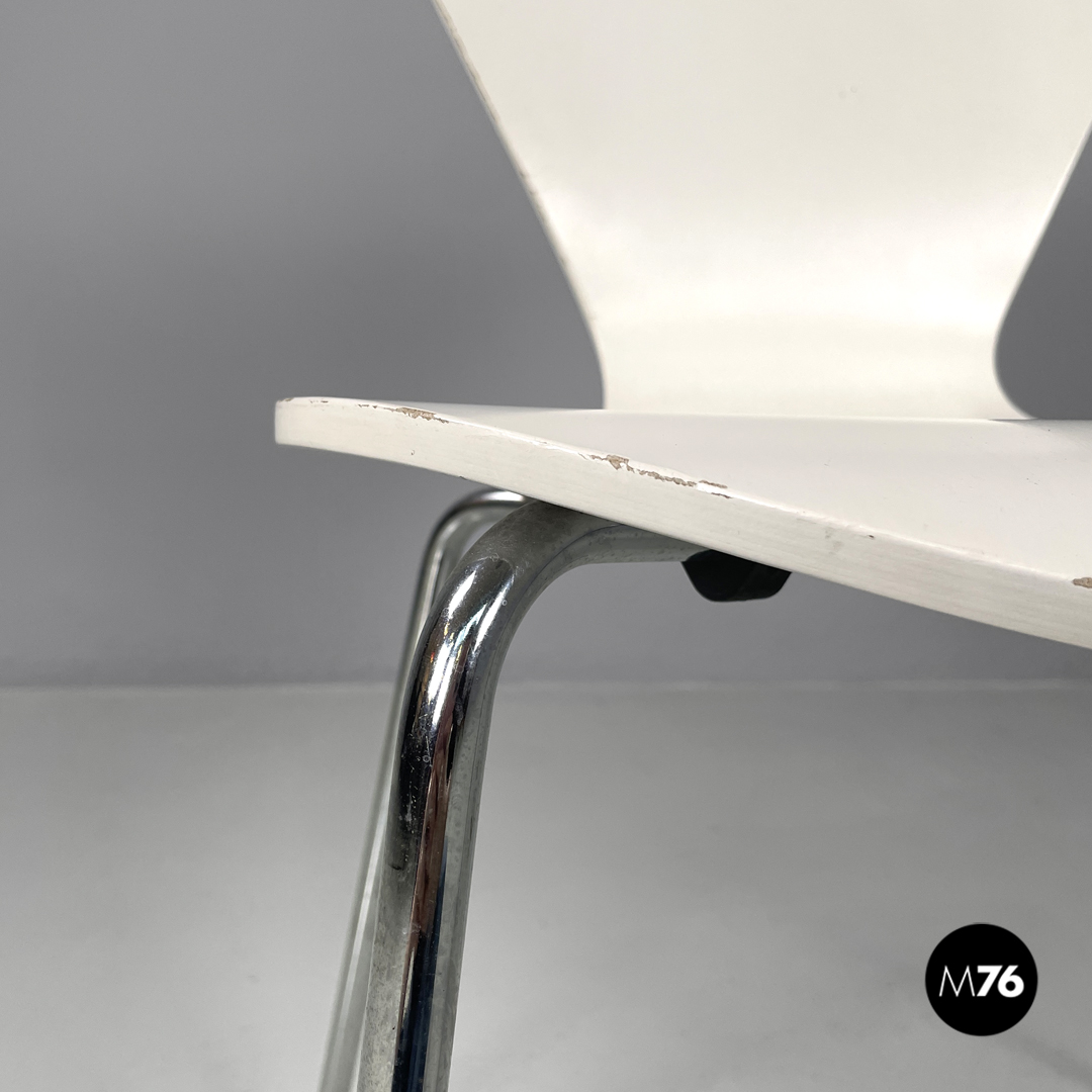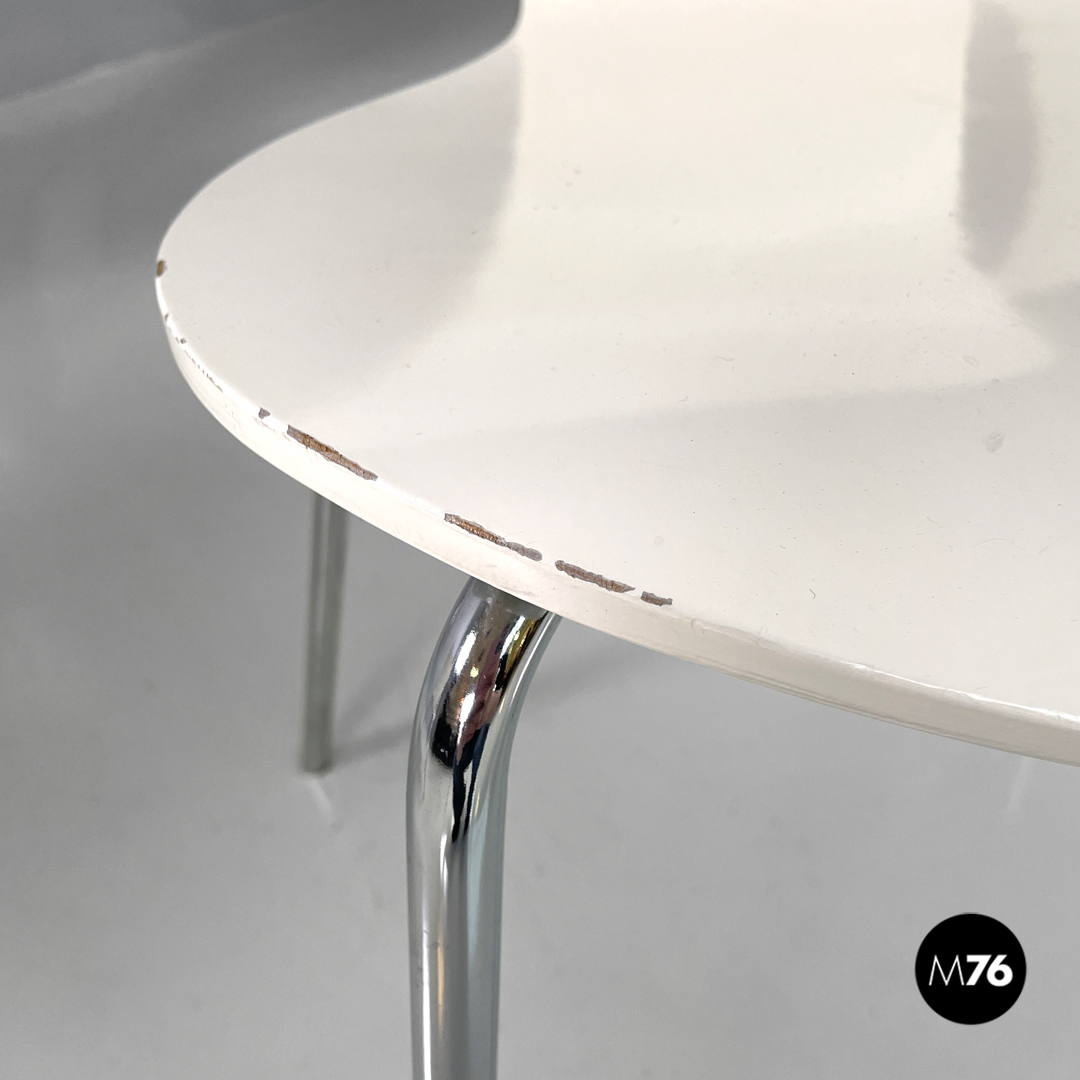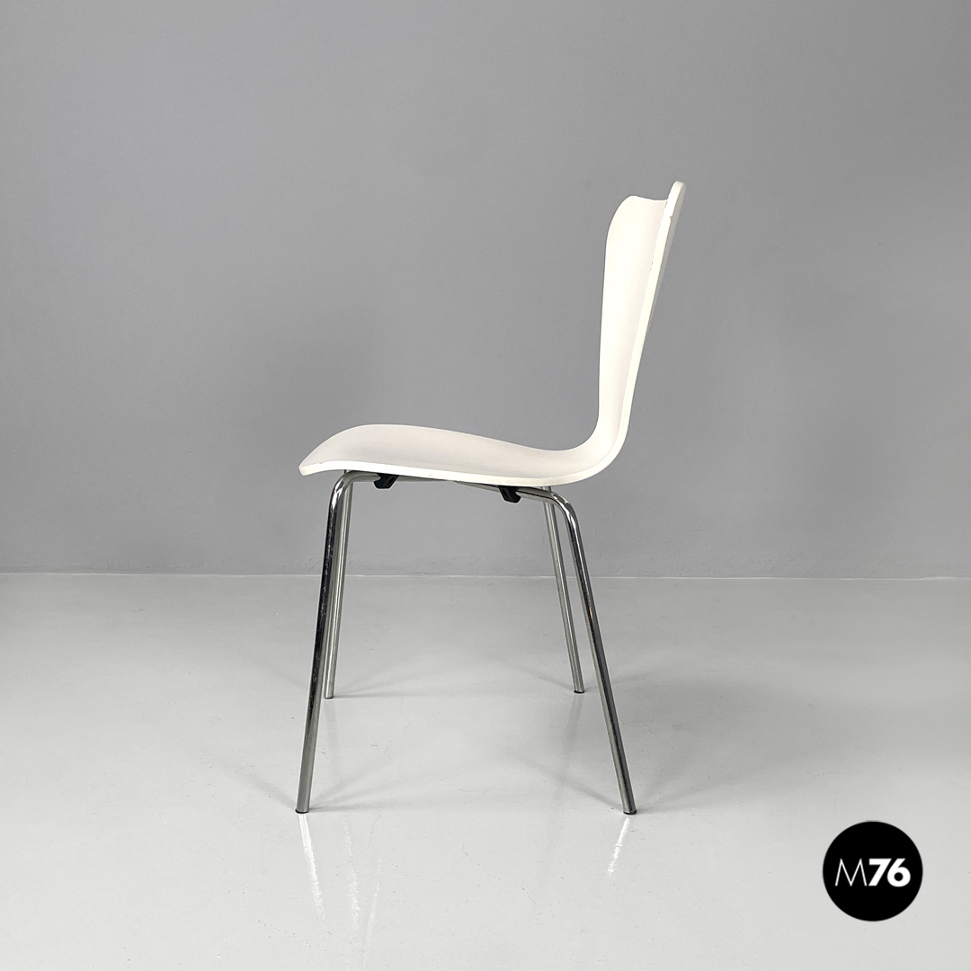 Set di sei sedie in legno laccato bianco. La seduta e lo schienale presentano linee curve e tondeggianti che si sagomano nella parte bassa dello schienale. Le quattro gambe sono in tondino di metallo cromato con piedini in plastica nera. Le sedie possono essere impilate.
