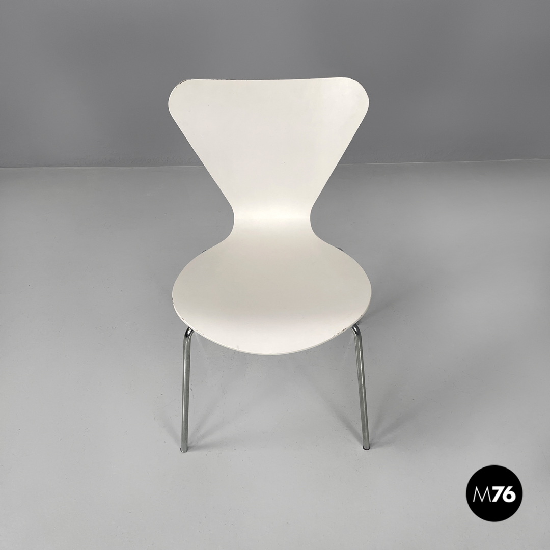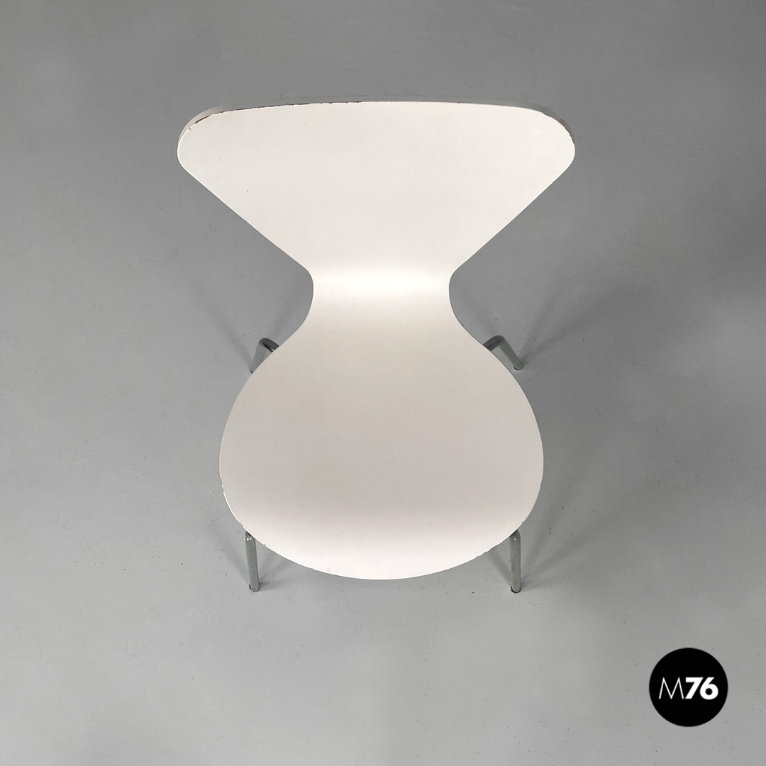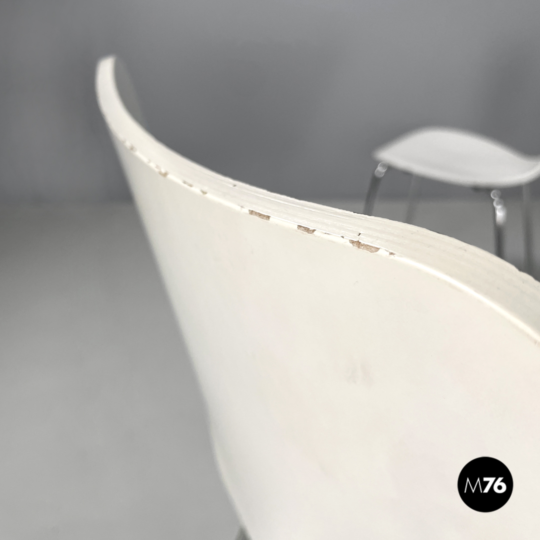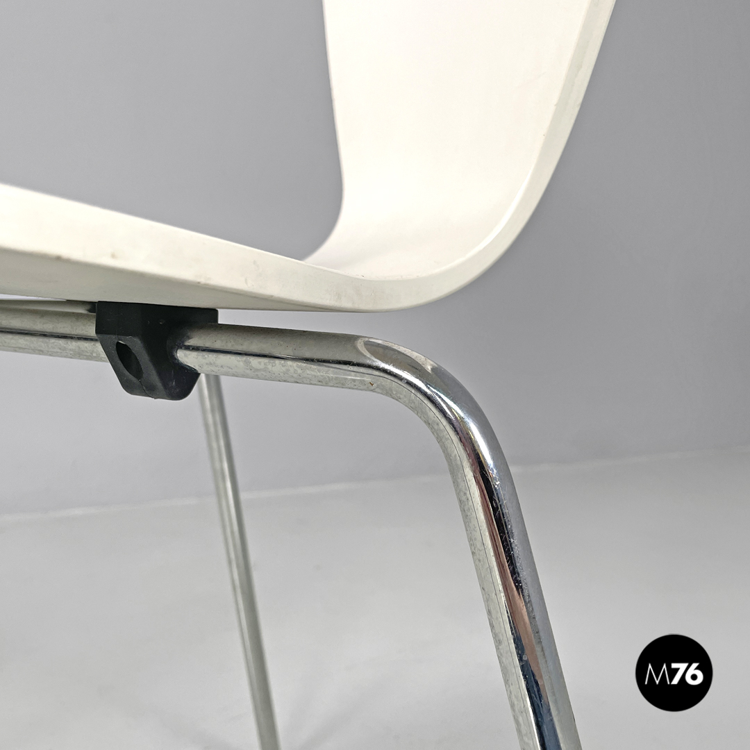 Set di sei sedie in legno laccato bianco. La seduta e lo schienale presentano linee curve e tondeggianti che si sagomano nella parte bassa dello schienale. Le quattro gambe sono in tondino di metallo cromato con piedini in plastica nera. Le sedie possono essere impilate.