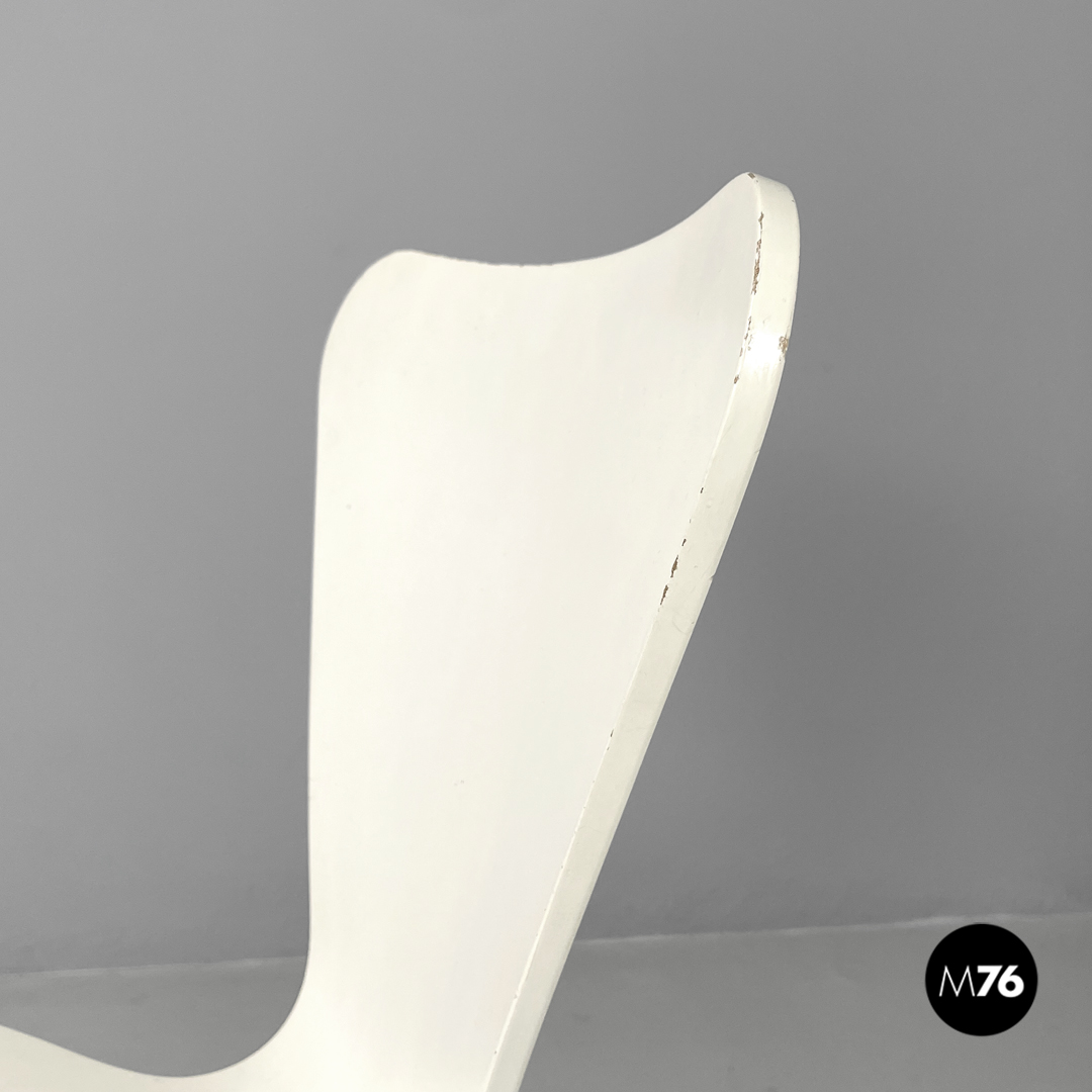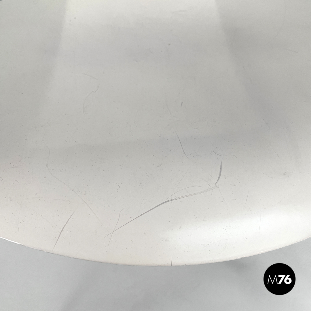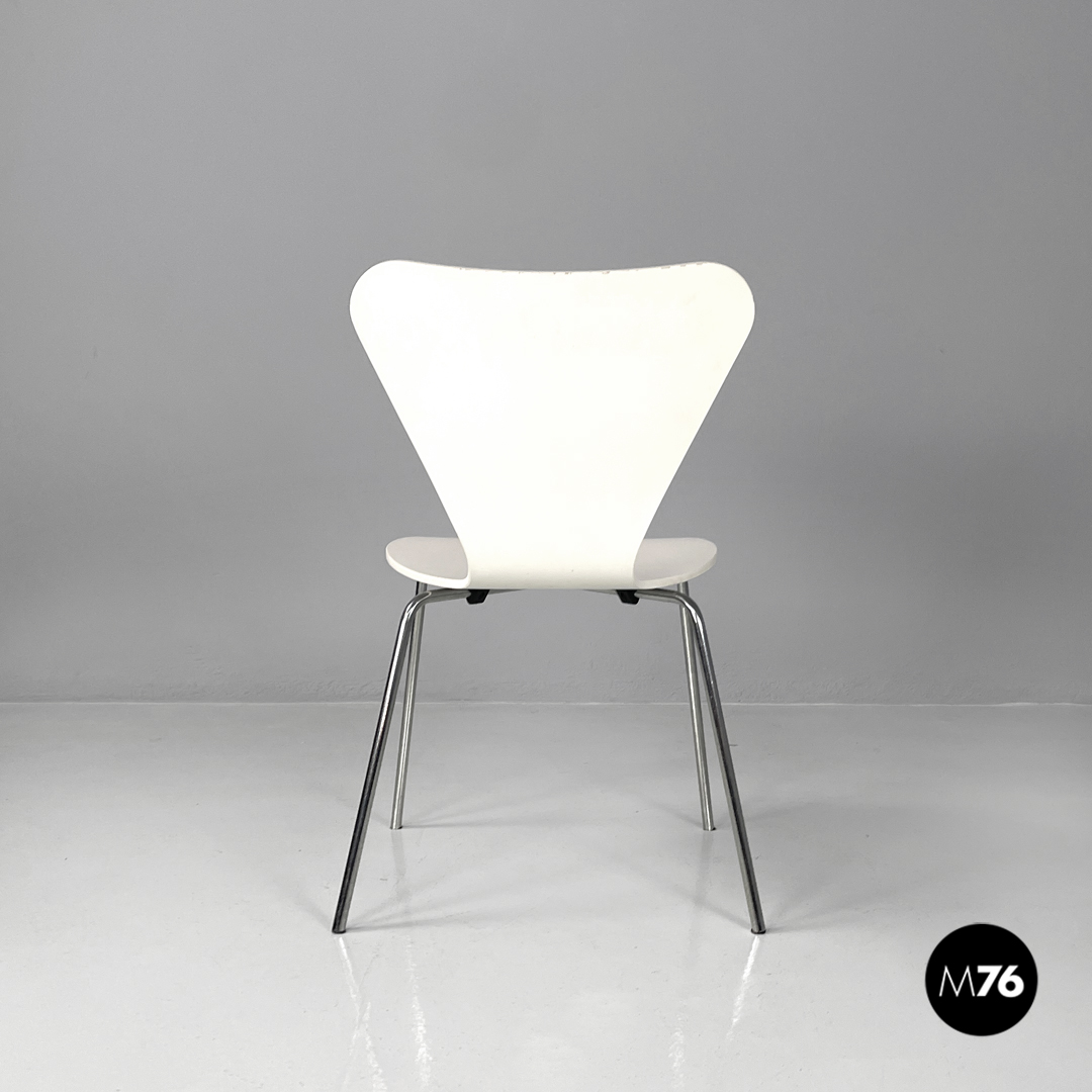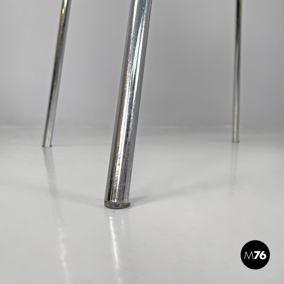 Set di sei sedie in legno laccato bianco. La seduta e lo schienale presentano linee curve e tondeggianti che si sagomano nella parte bassa dello schienale. Le quattro gambe sono in tondino di metallo cromato con piedini in plastica nera. Le sedie possono essere impilate.