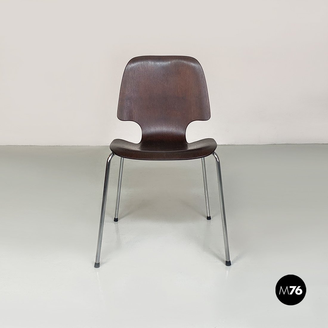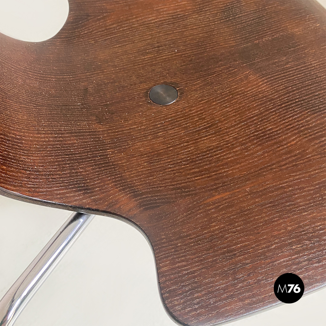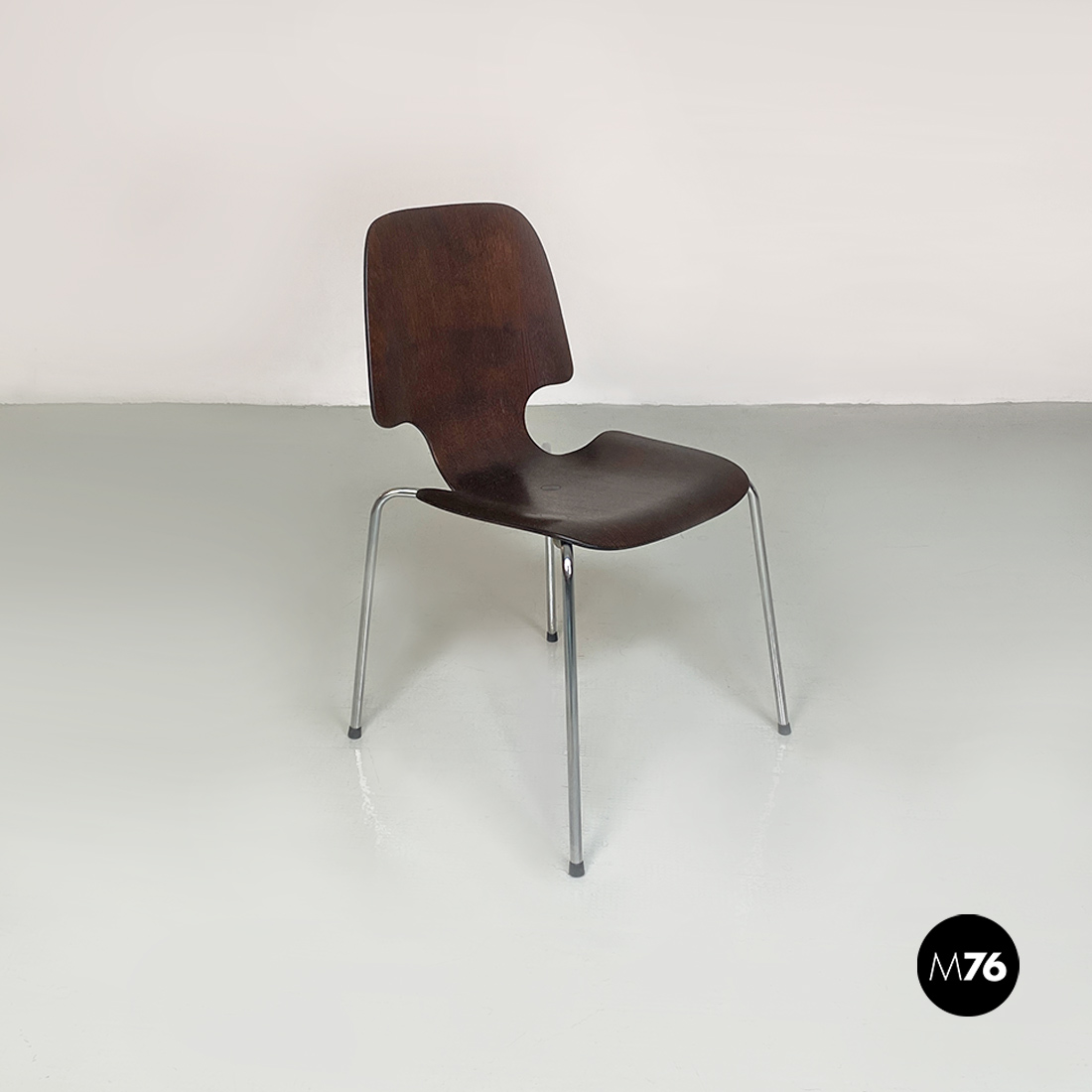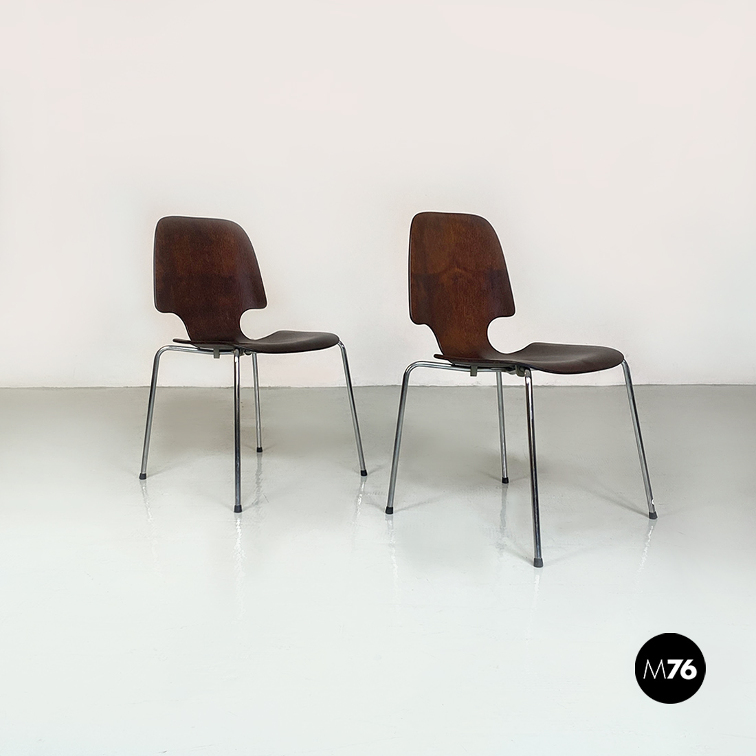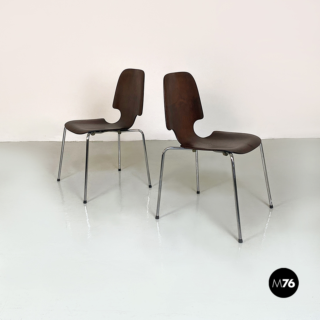 Coppia di sedie con mono scocca in legno scuro curvata con forma sagomata e zampe in tondino di acciaio cromato con dettaglio tondo in metallo nella parte centrale della seduta.