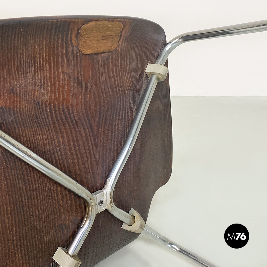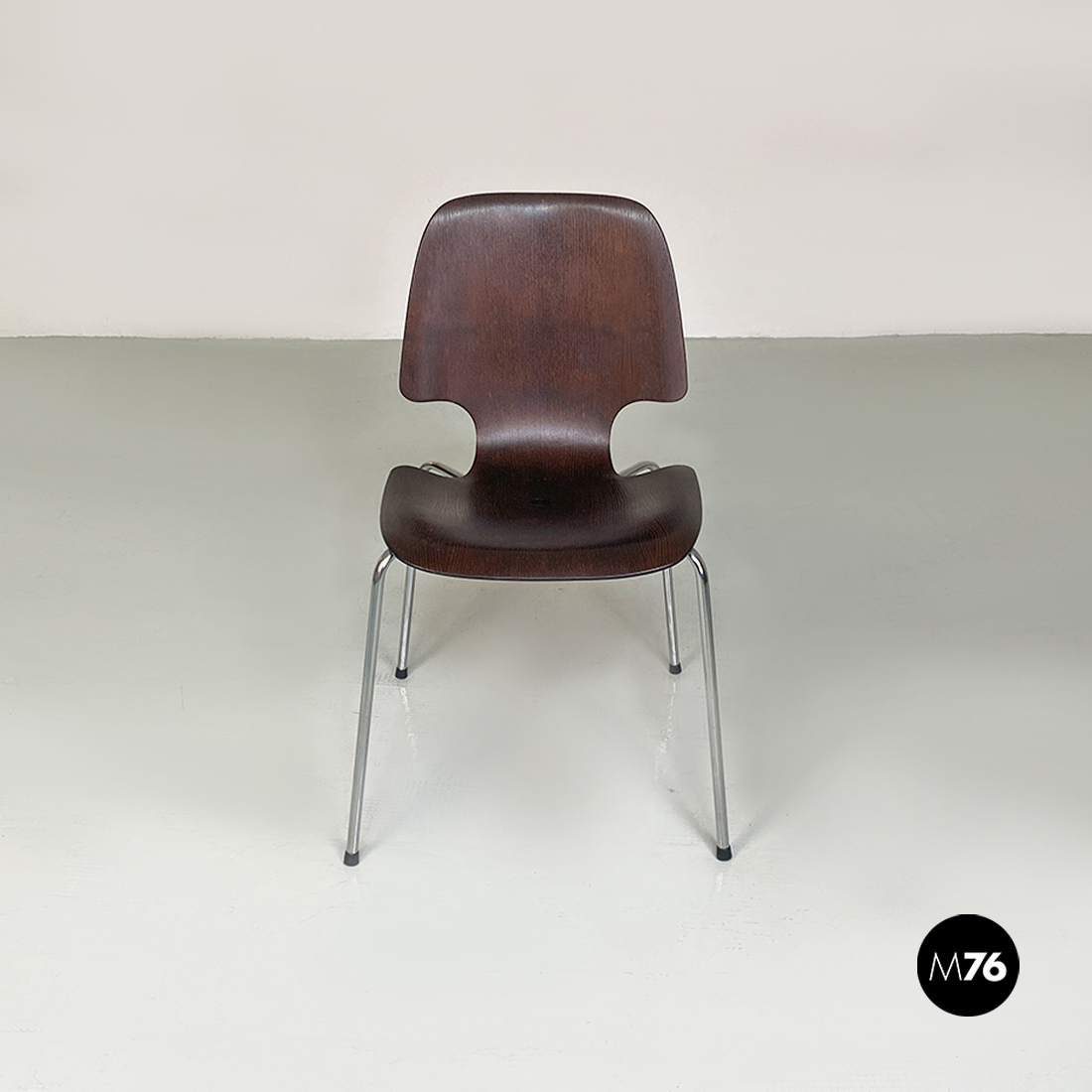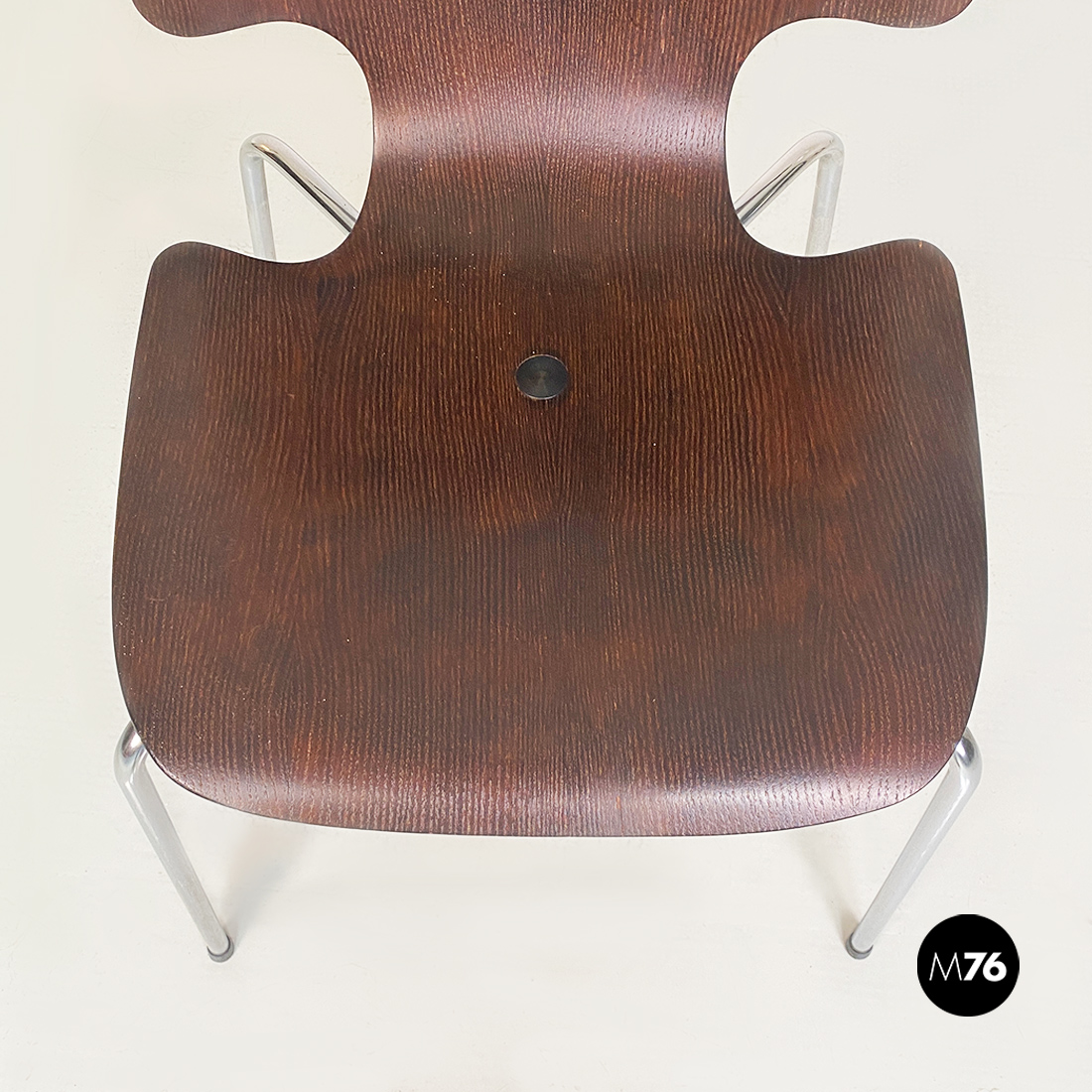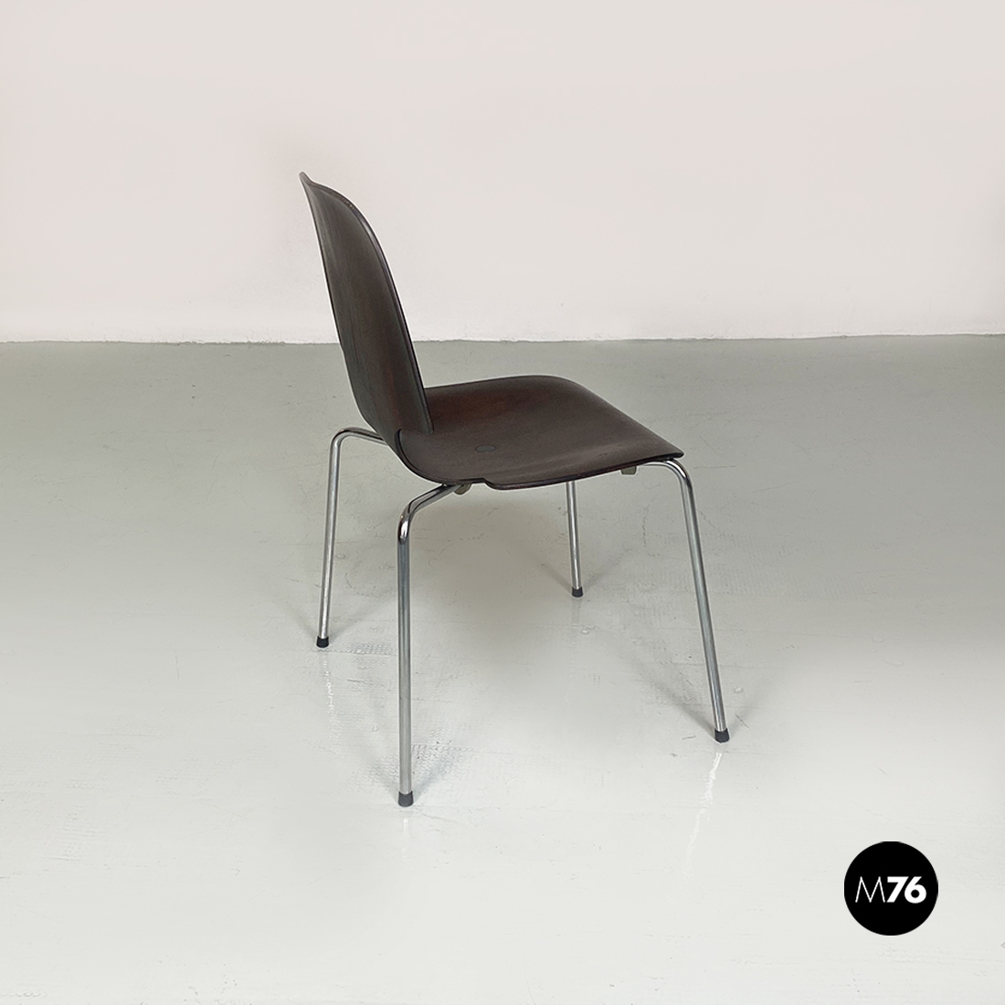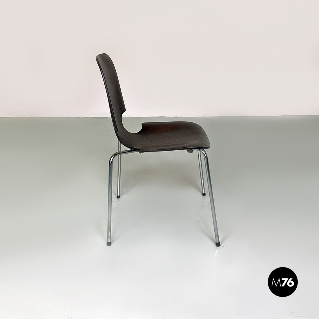 Coppia di sedie con mono scocca in legno scuro curvata con forma sagomata e zampe in tondino di acciaio cromato con dettaglio tondo in metallo nella parte centrale della seduta.
