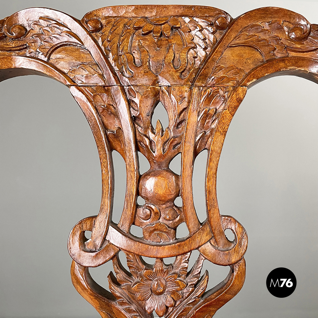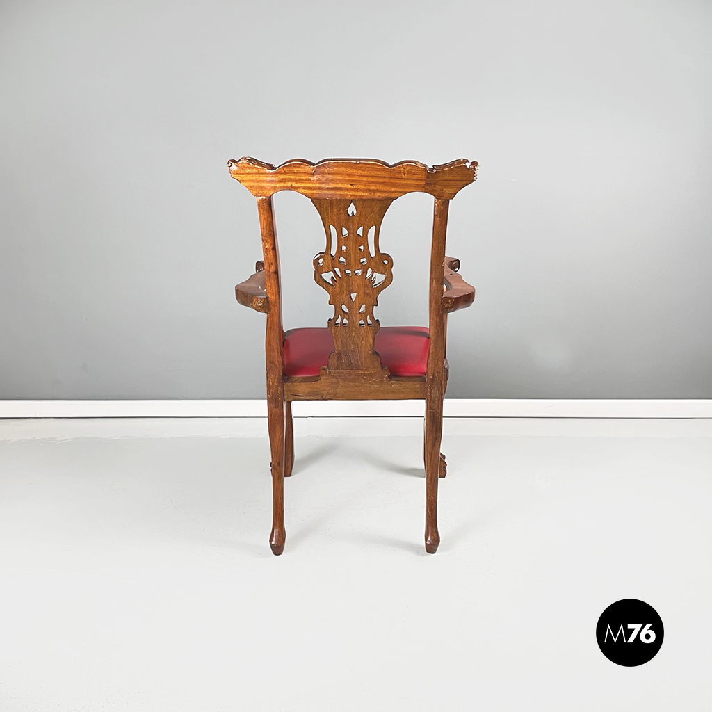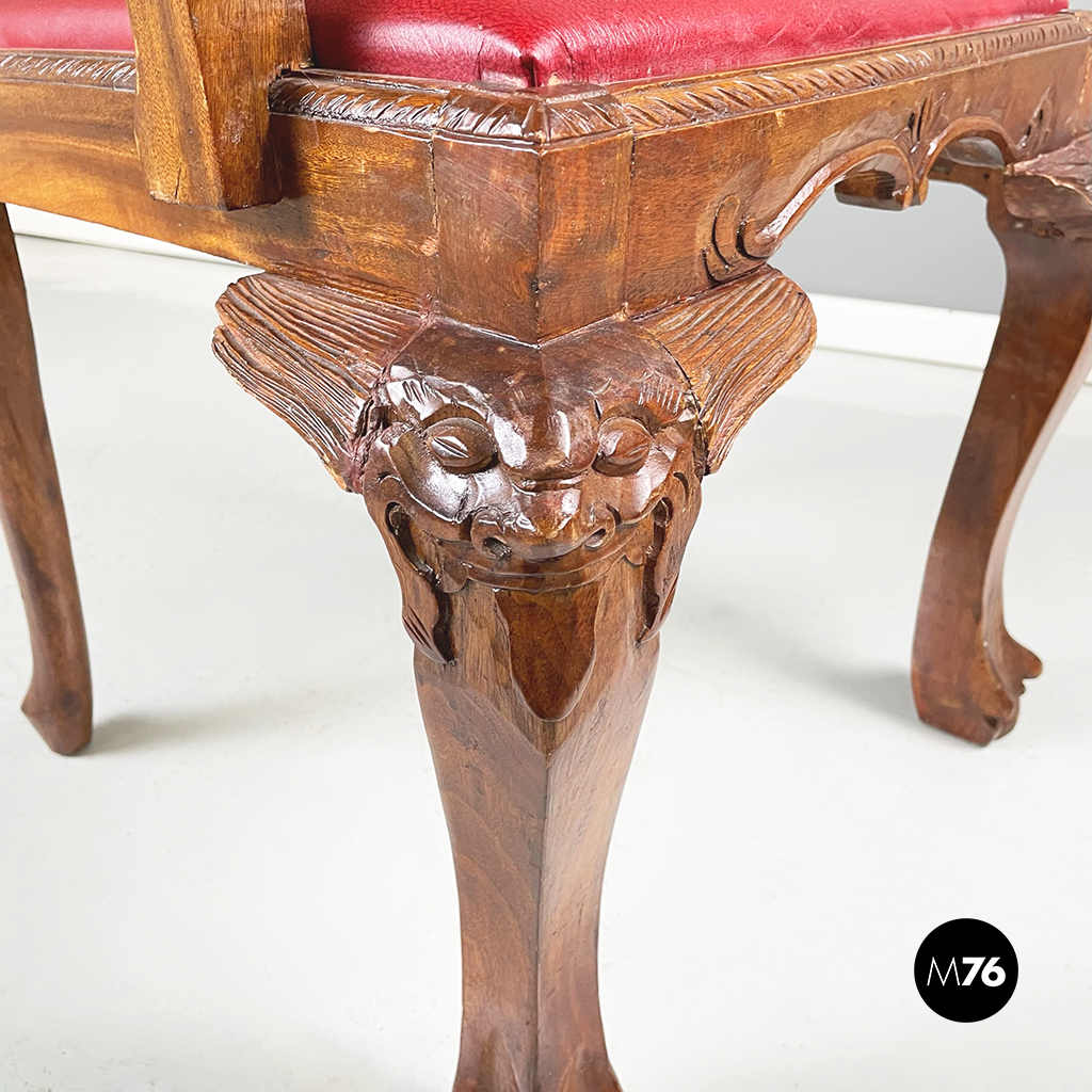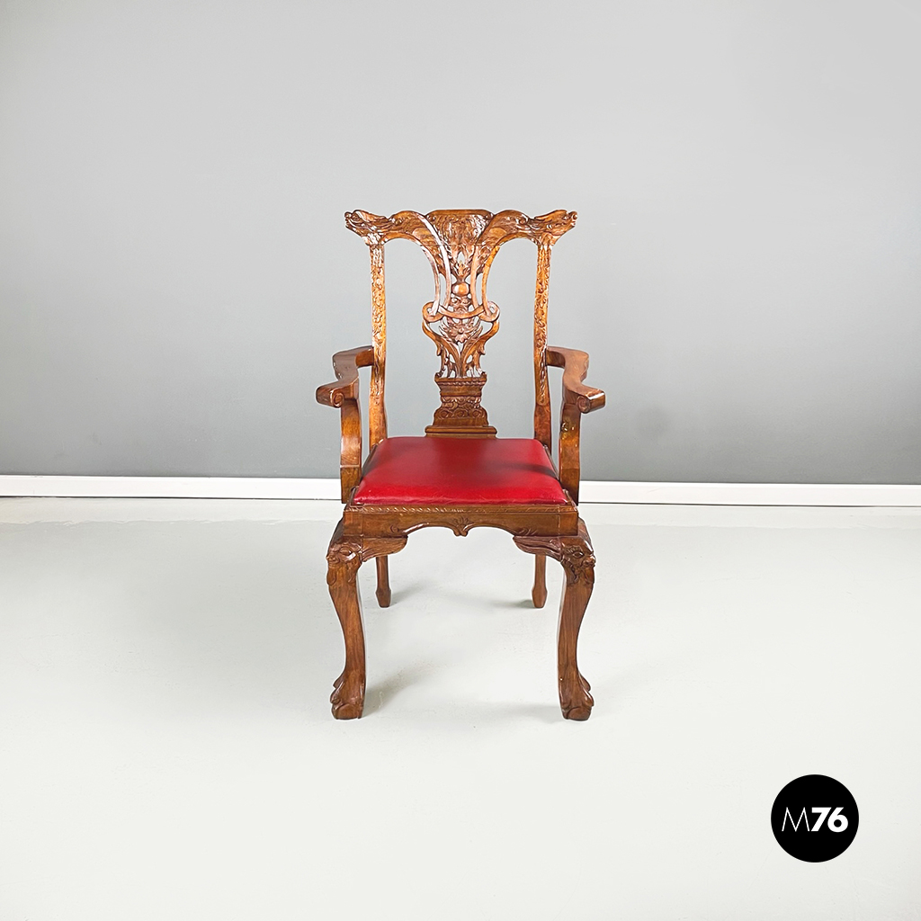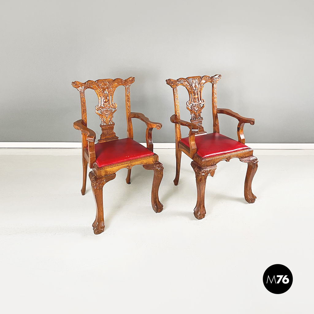 Coppia di sedie con struttura in legno finemente lavorato. La seduta squadrata è imbottita e rivestita in pelle rossa. I braccioli incurvati in legno della sedia terminano con un ricciolo. In stile Chippendale.