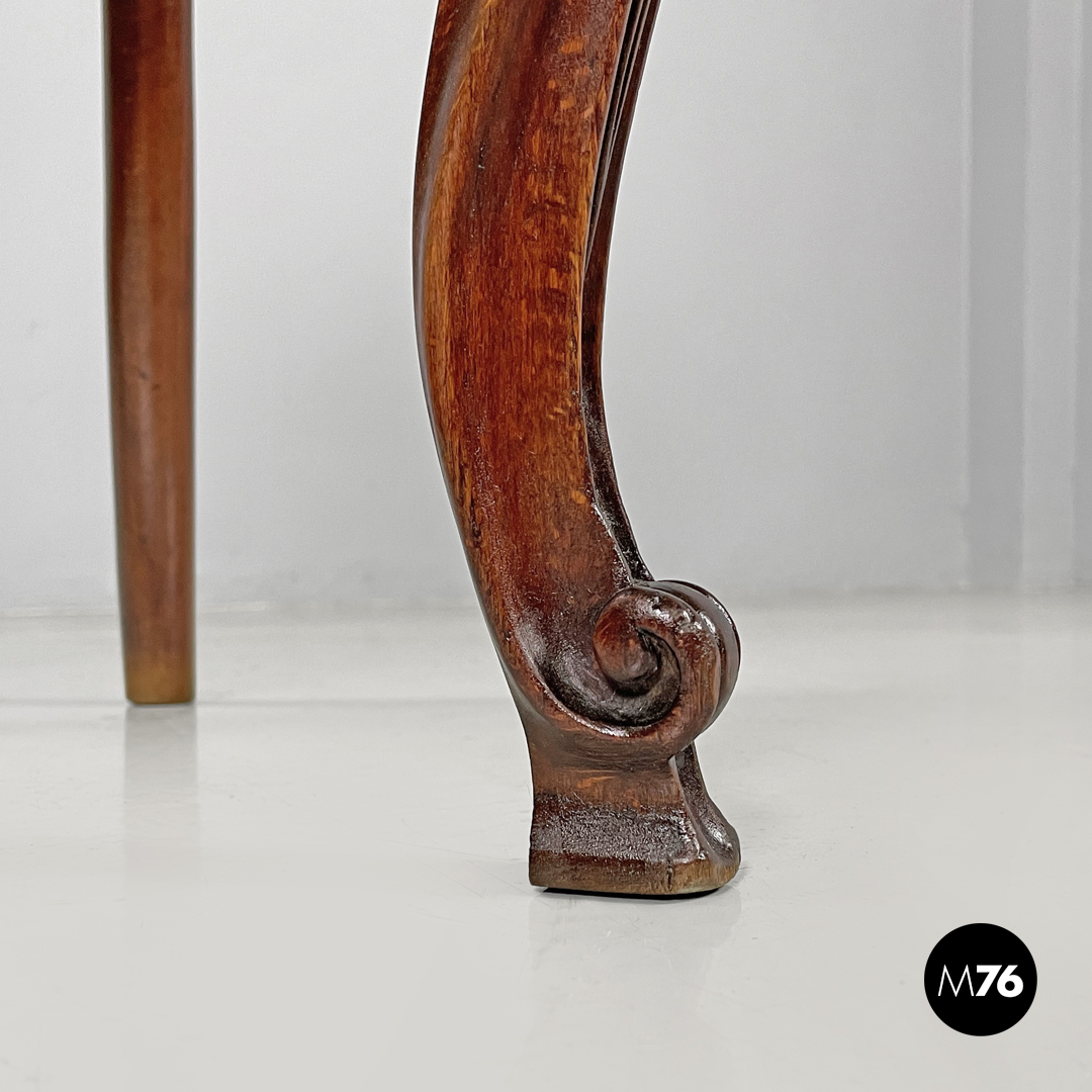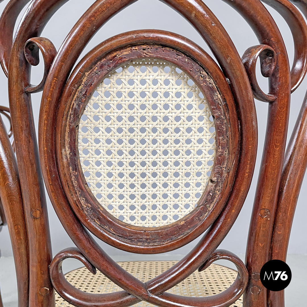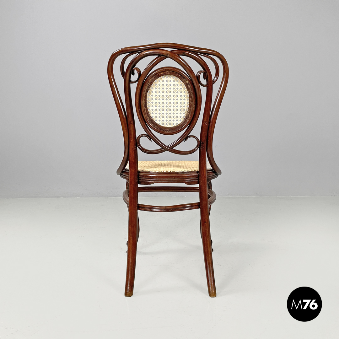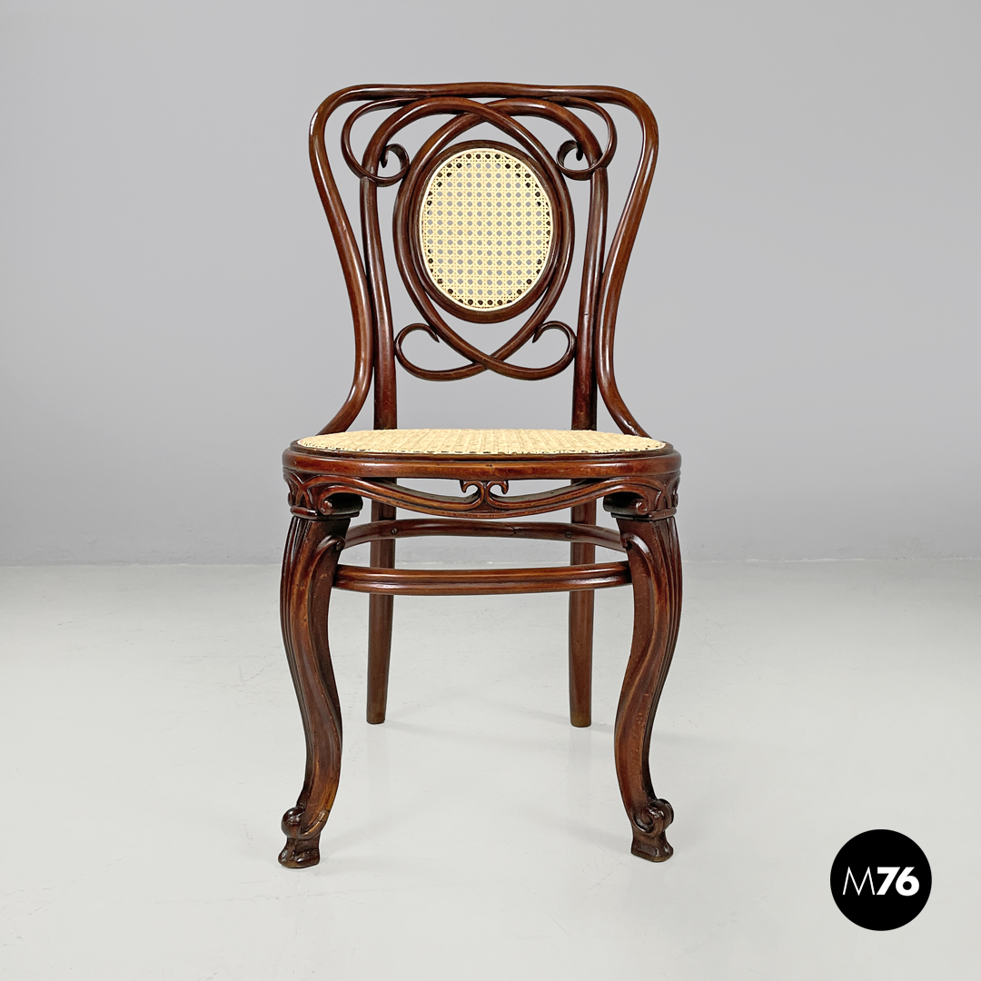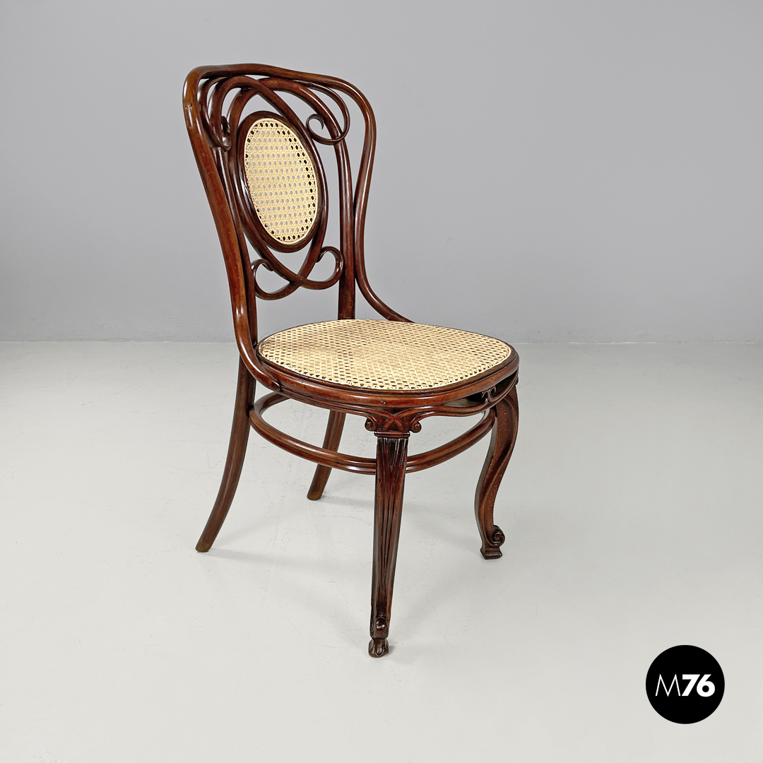 Set di quattro sedie in legno e paglia di Vienna. La struttura in legno presenta profili cilindrici e stondati e forma delle decorazione a ricciolo sullo schienale e sulle gambe. La seduta e la parte centrale dello schienale sono rivestiti in paglia.