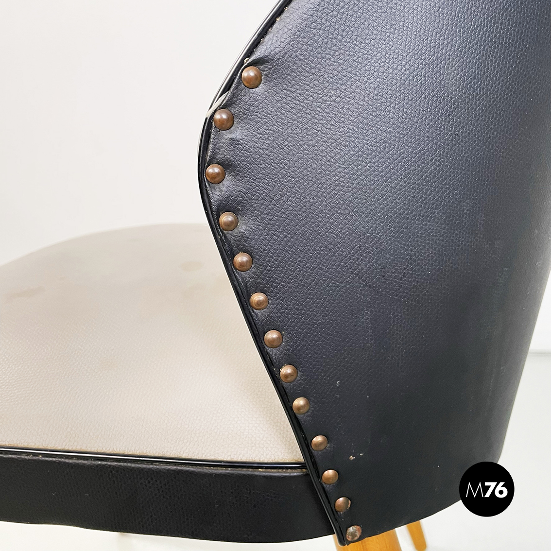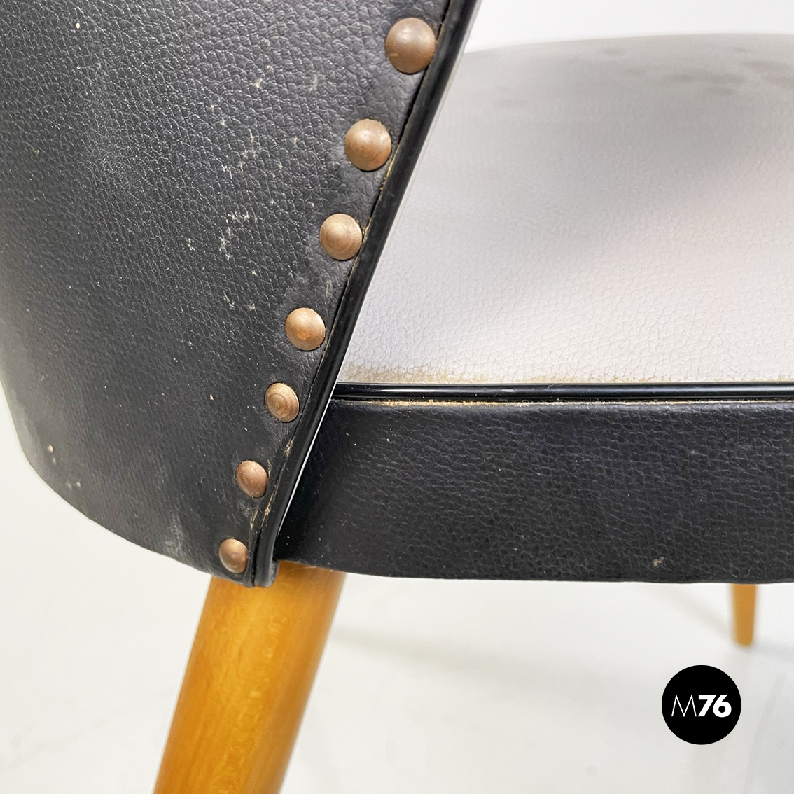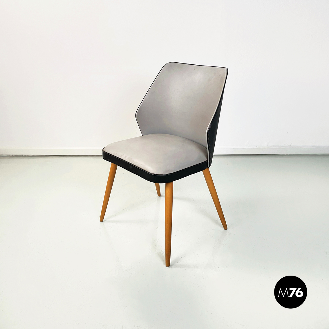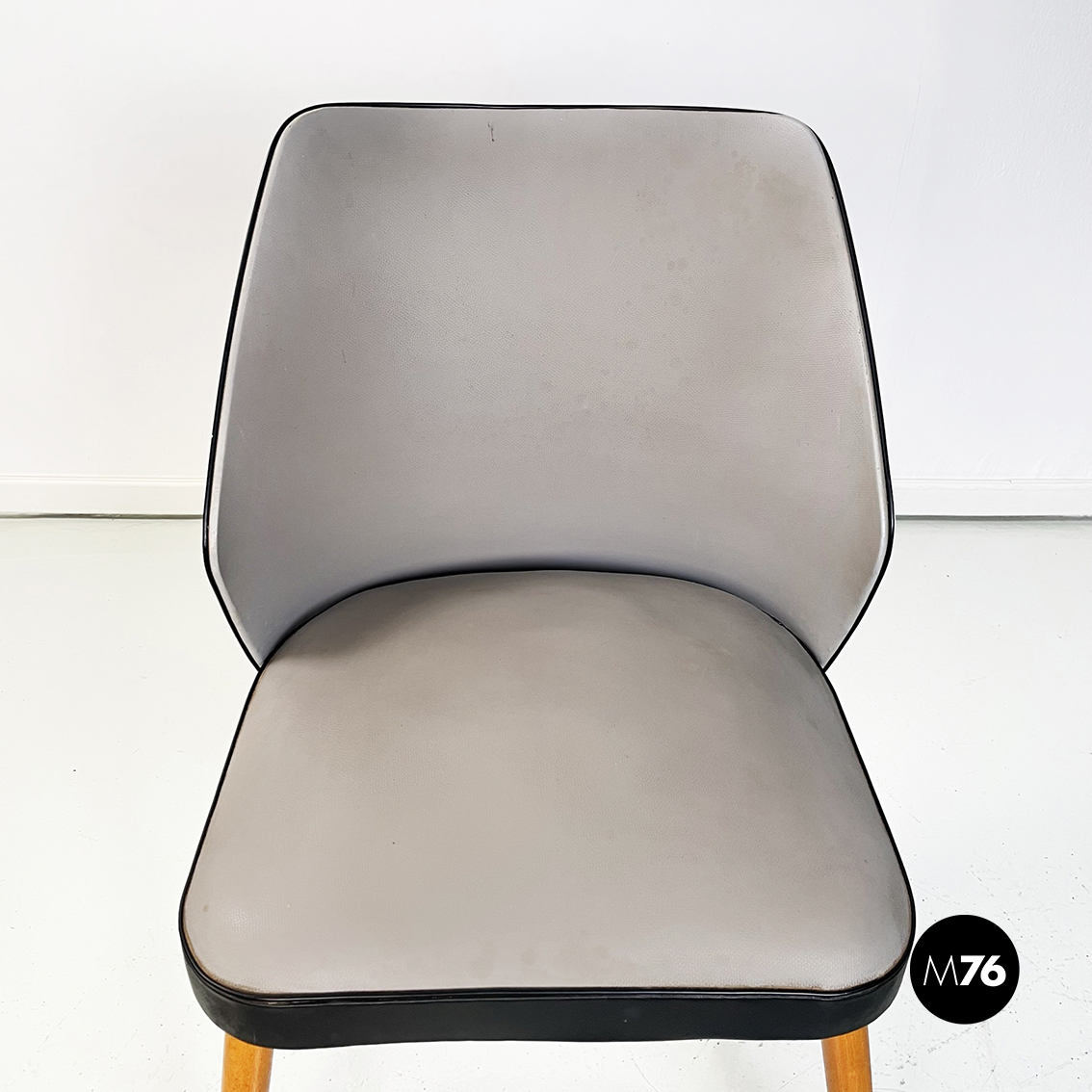 Set di tre sedie con seduta quadrati ad angoli arrotondati in pelle bicolore grigia e nera. Lo schienale ricurvo in pelle bicolore nera e grigia presenta sul retro piccole borchie tonde. Gambe a sezione tonda in legno.