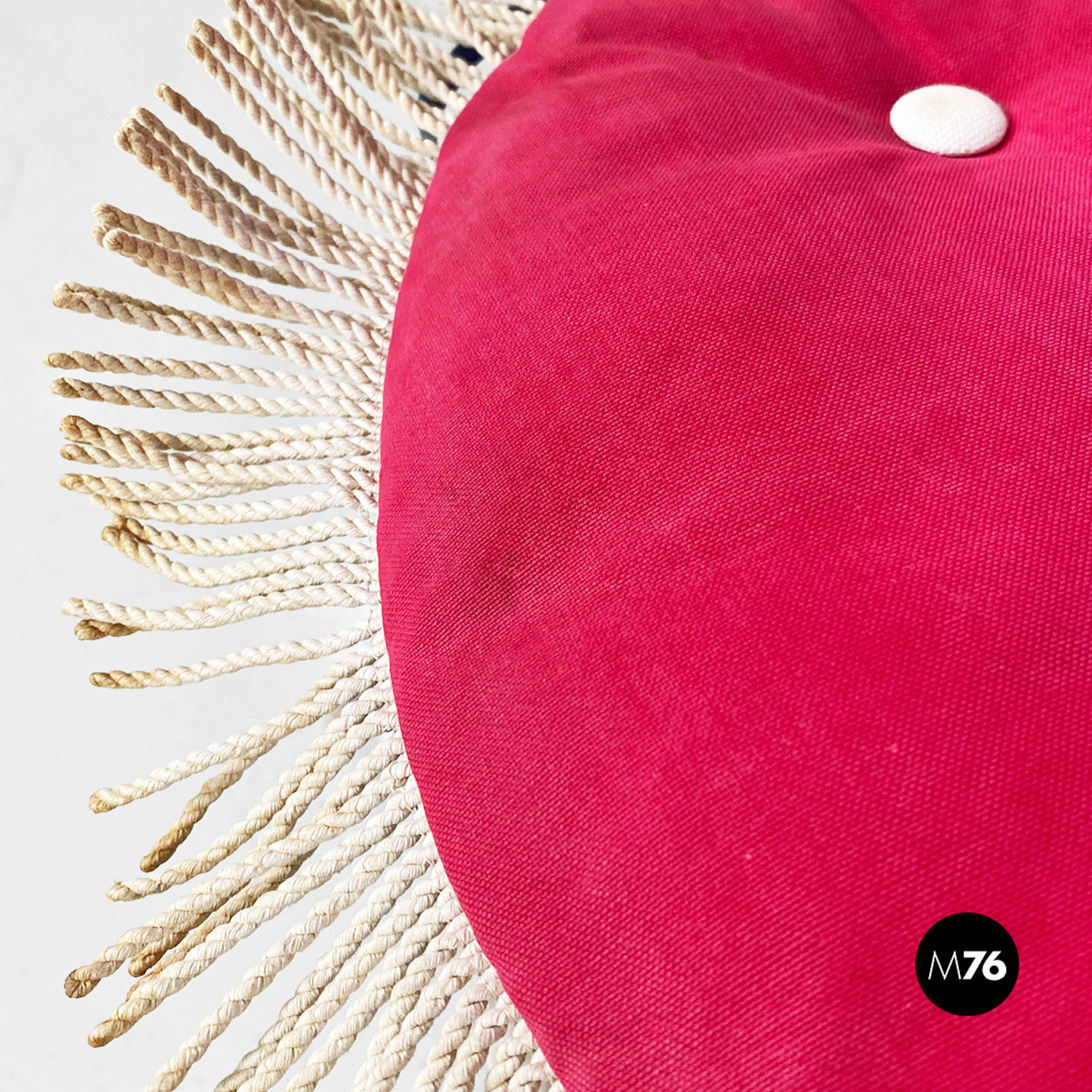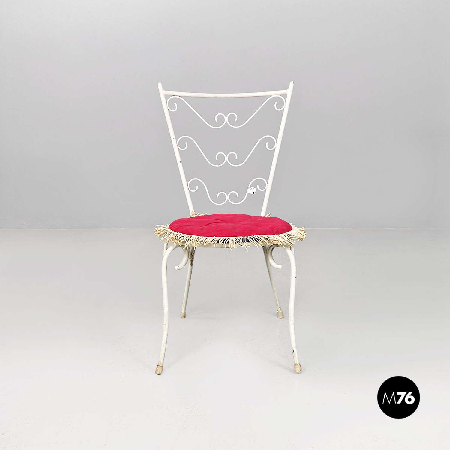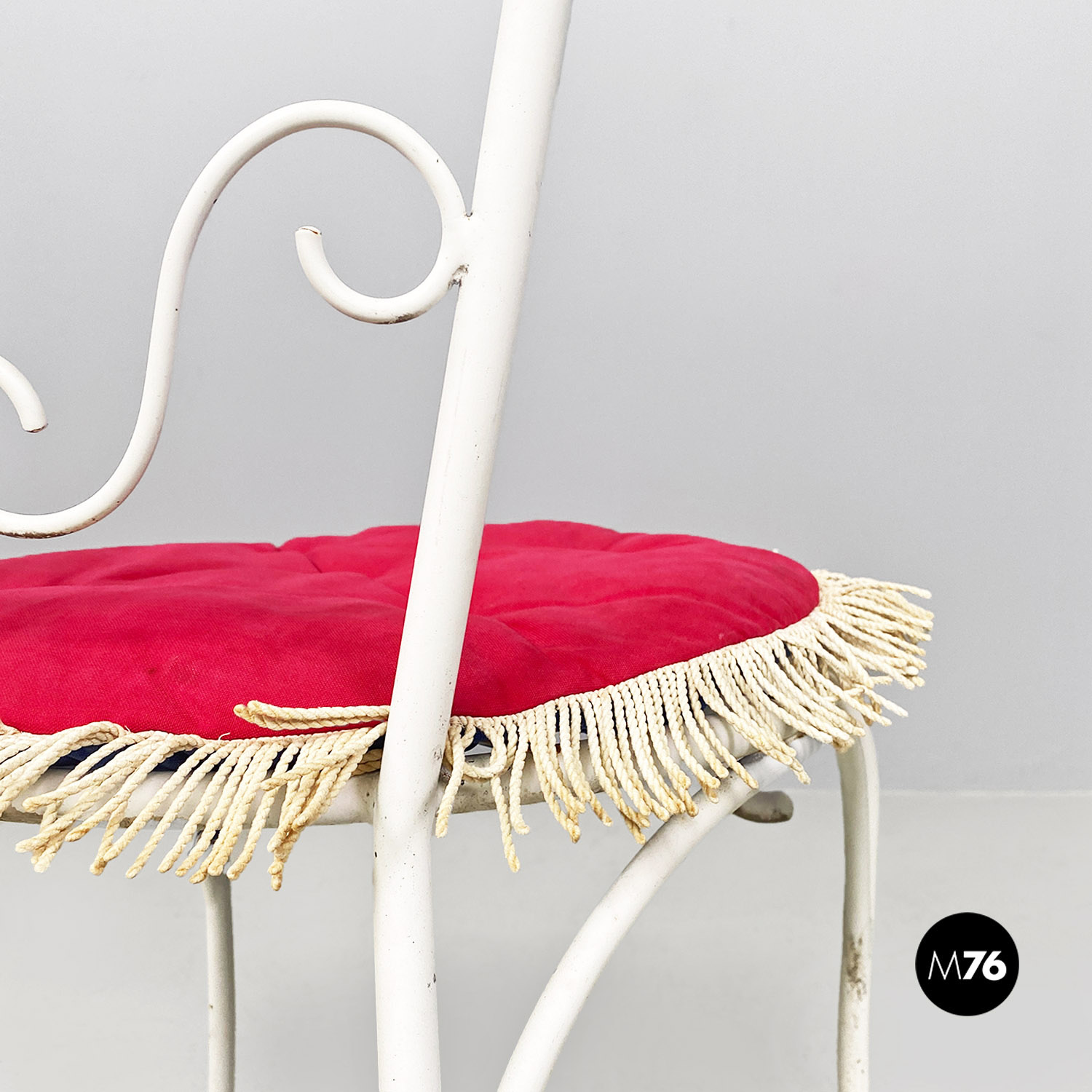 Coppia di sedie da esterno in ferro battuto verniciato bianco con seduta a molle di forma tonda su cui è posto un cuscino imbottito e rivestito in tessuto double face rosso magenta da un lato e blu dall’altro con frange bianche lungo il bordo. Lo schienale presenta tre fasce di riccioli decorativi. Sono adatte ad essere usate in giardino ma anche per utilizzo interno.