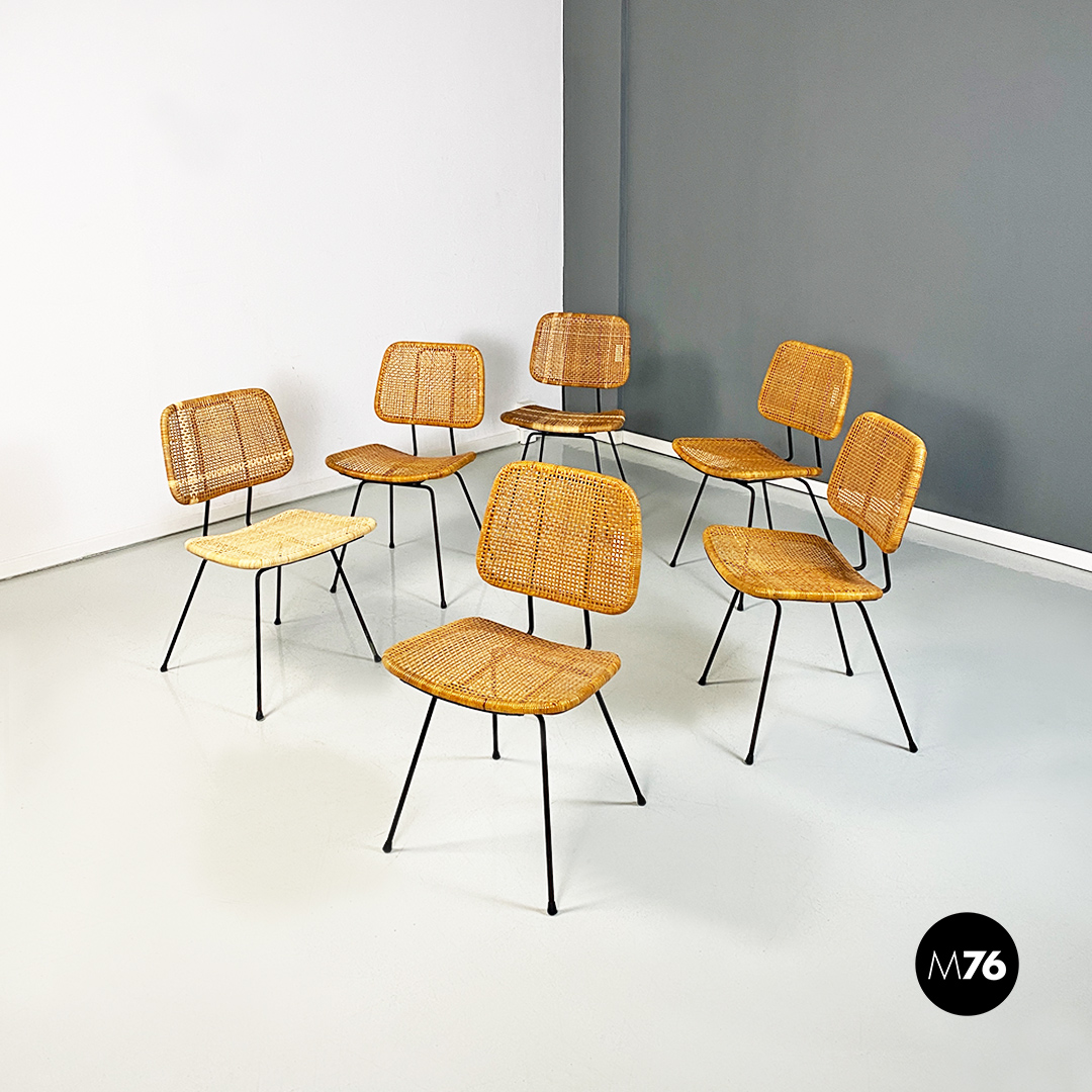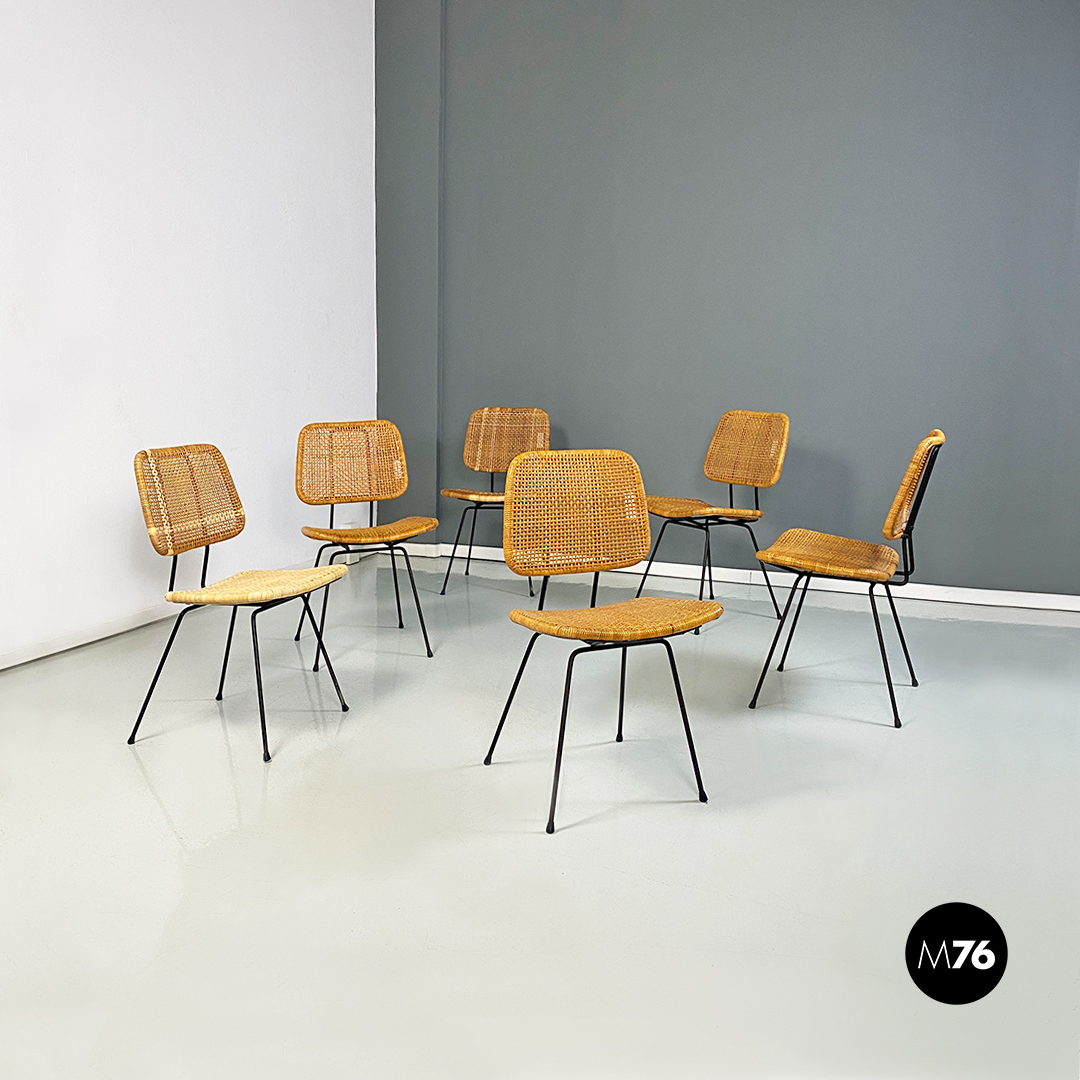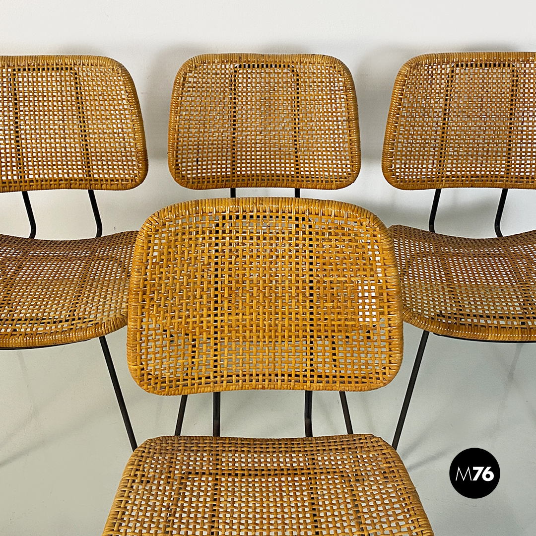 Set composto da sei sedie con struttura in metallo seduta e schienale con angoli stondati interamente in vimini e zampe in tondino di metallo e puntali in gomma.