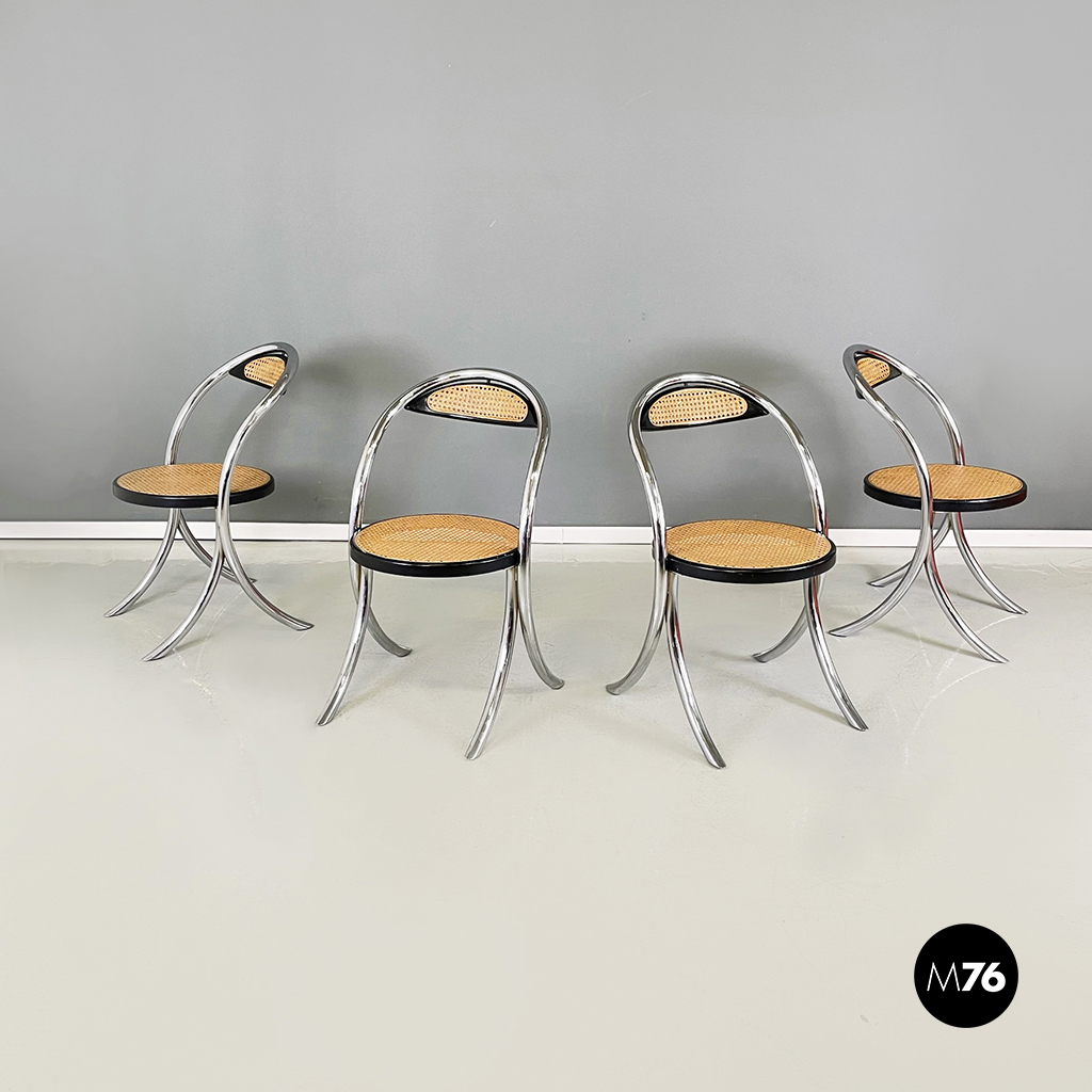Set di quattro sedie con seduta tonda e schienale a semi-cerchio in legno verniciato nero e paglia. La struttura è interamente composta da tubolari di acciaio curvati.