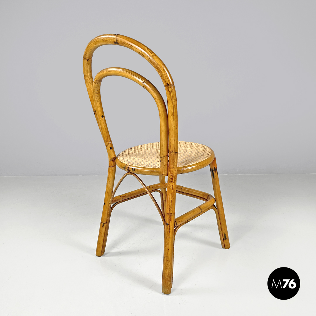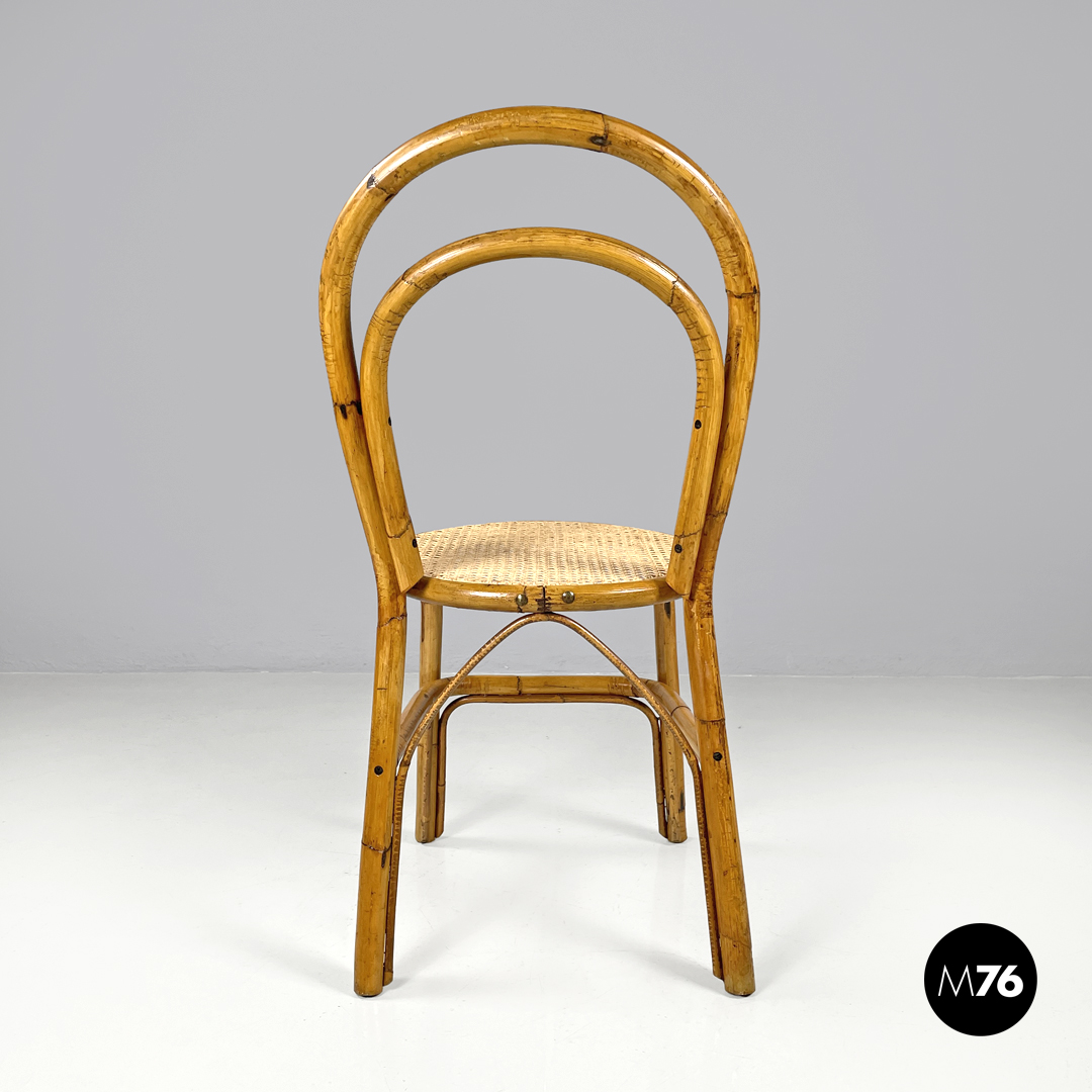 Set di sei sedie in rattan. Lo schienale è composto da due elementi curvi a sezione circolare mentre le seduta tonda è in paglia di Vienna. Poggiapiedi sulla struttura.