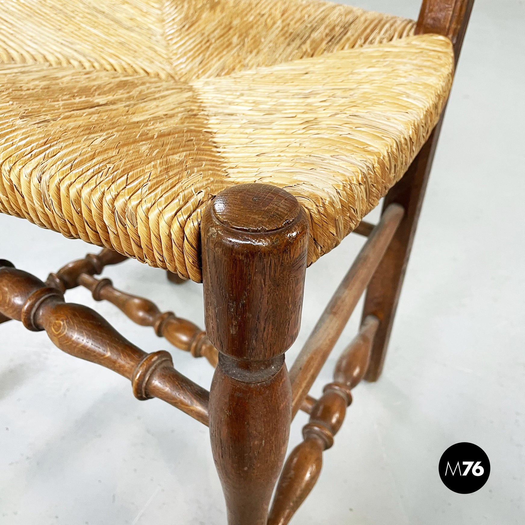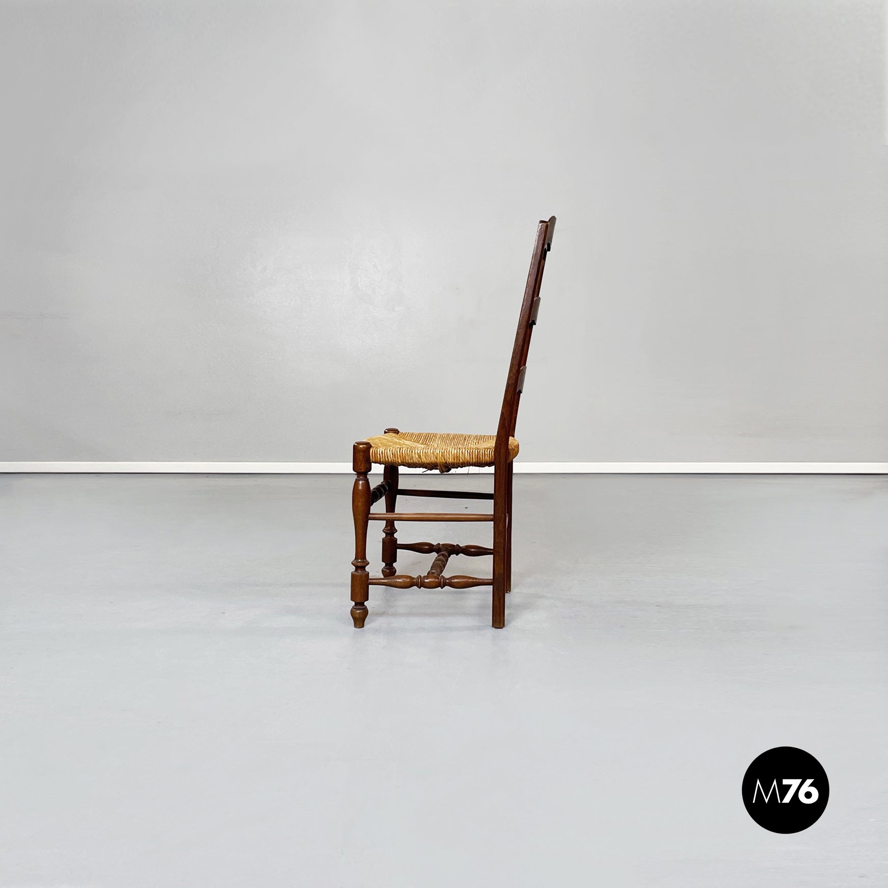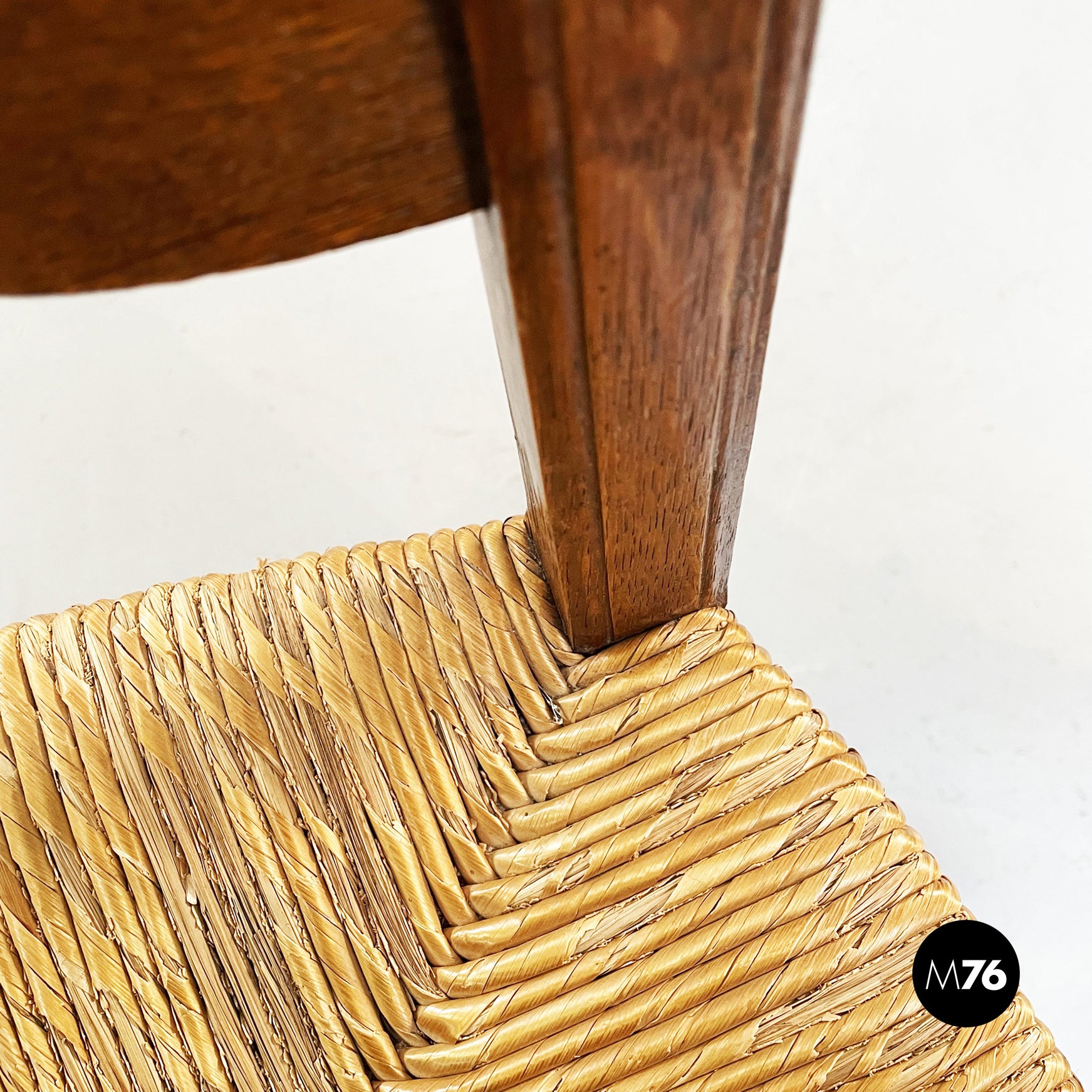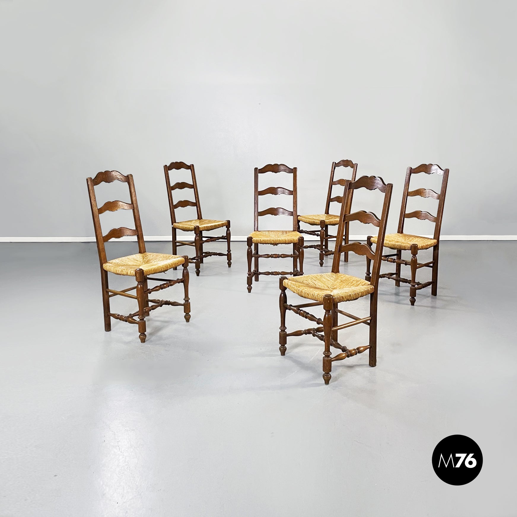 Set di sei sedie con seduta quadrata in paglia e struttura in legno finemente lavorata.