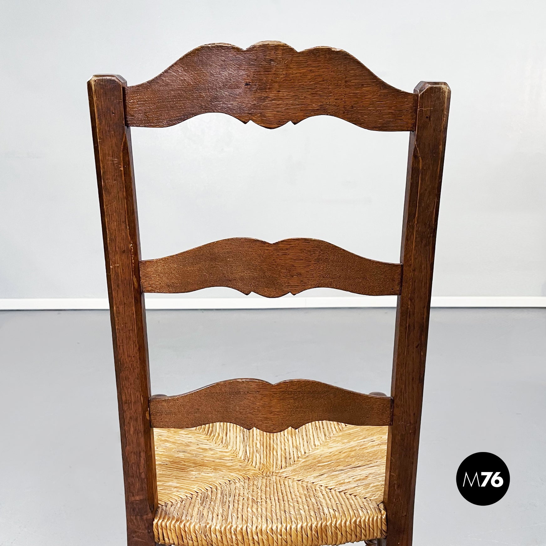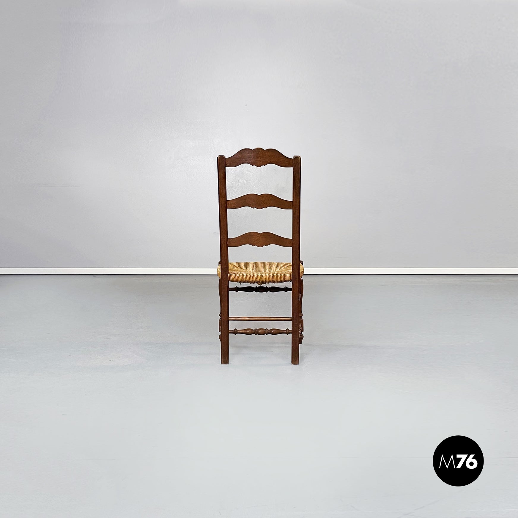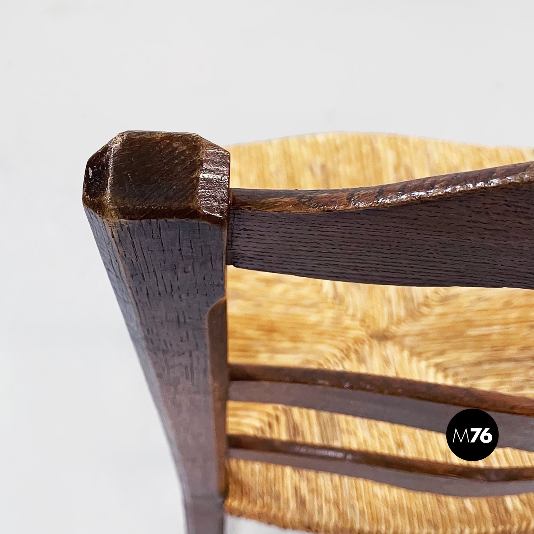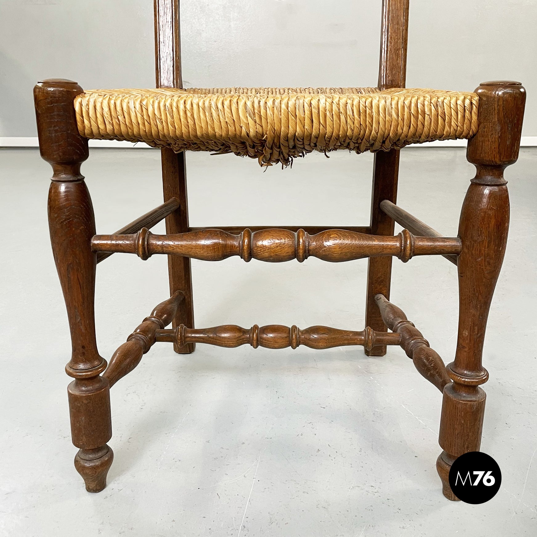 Set di sei sedie con seduta quadrata in paglia e struttura in legno finemente lavorata.