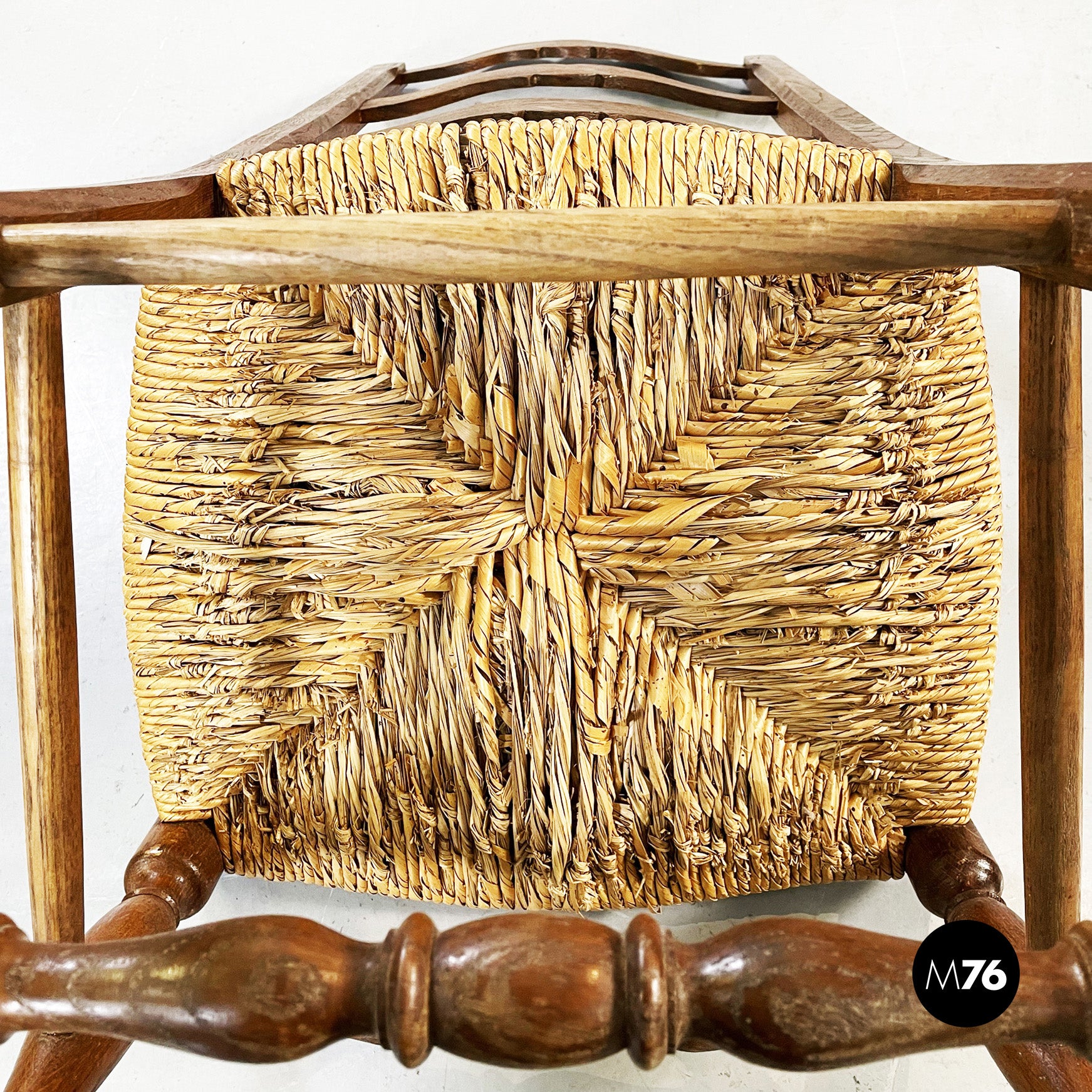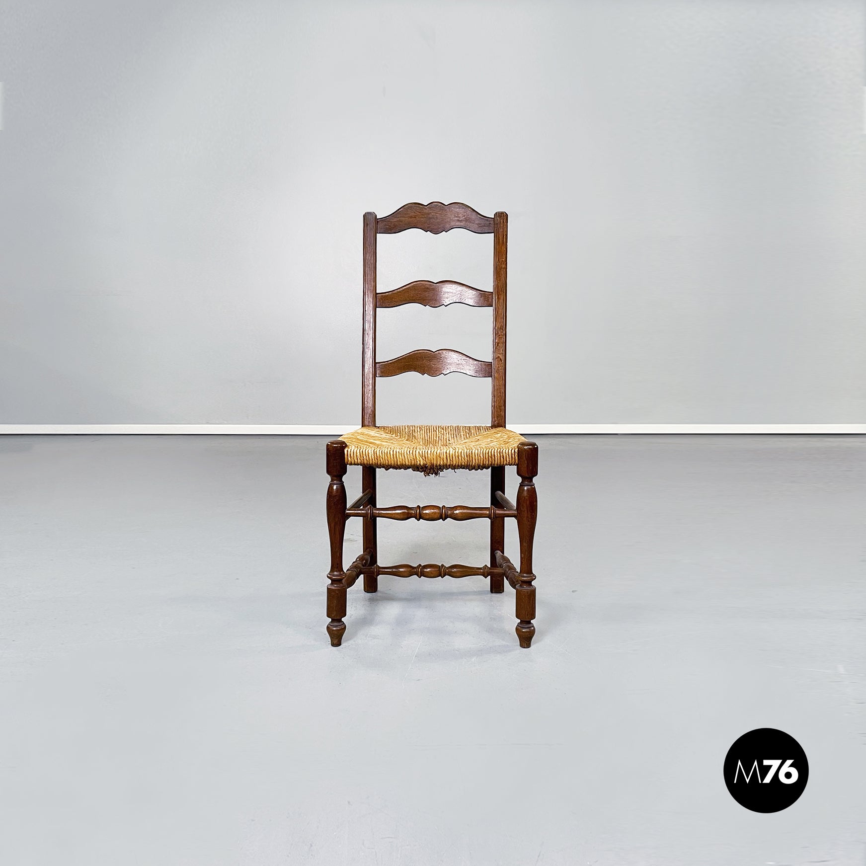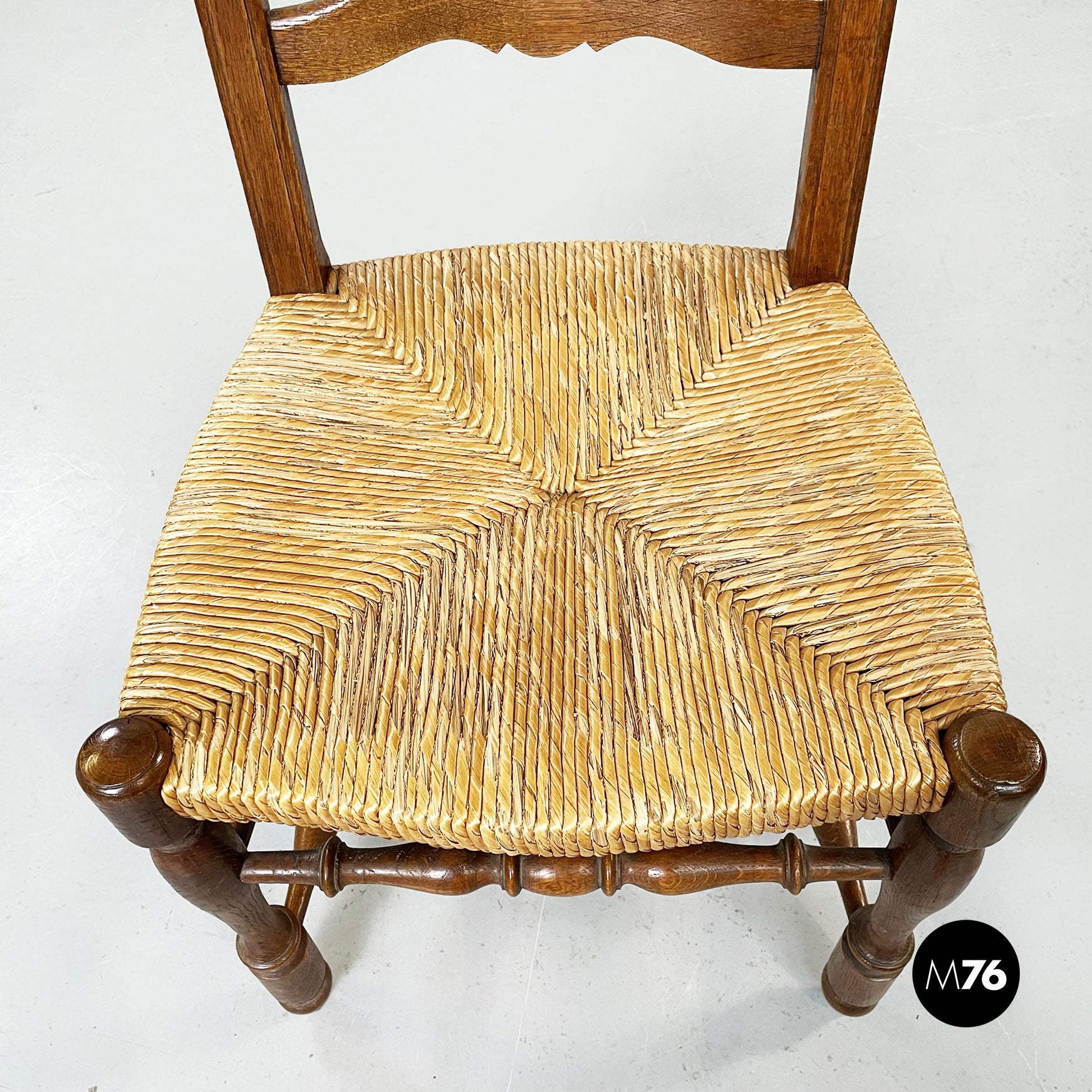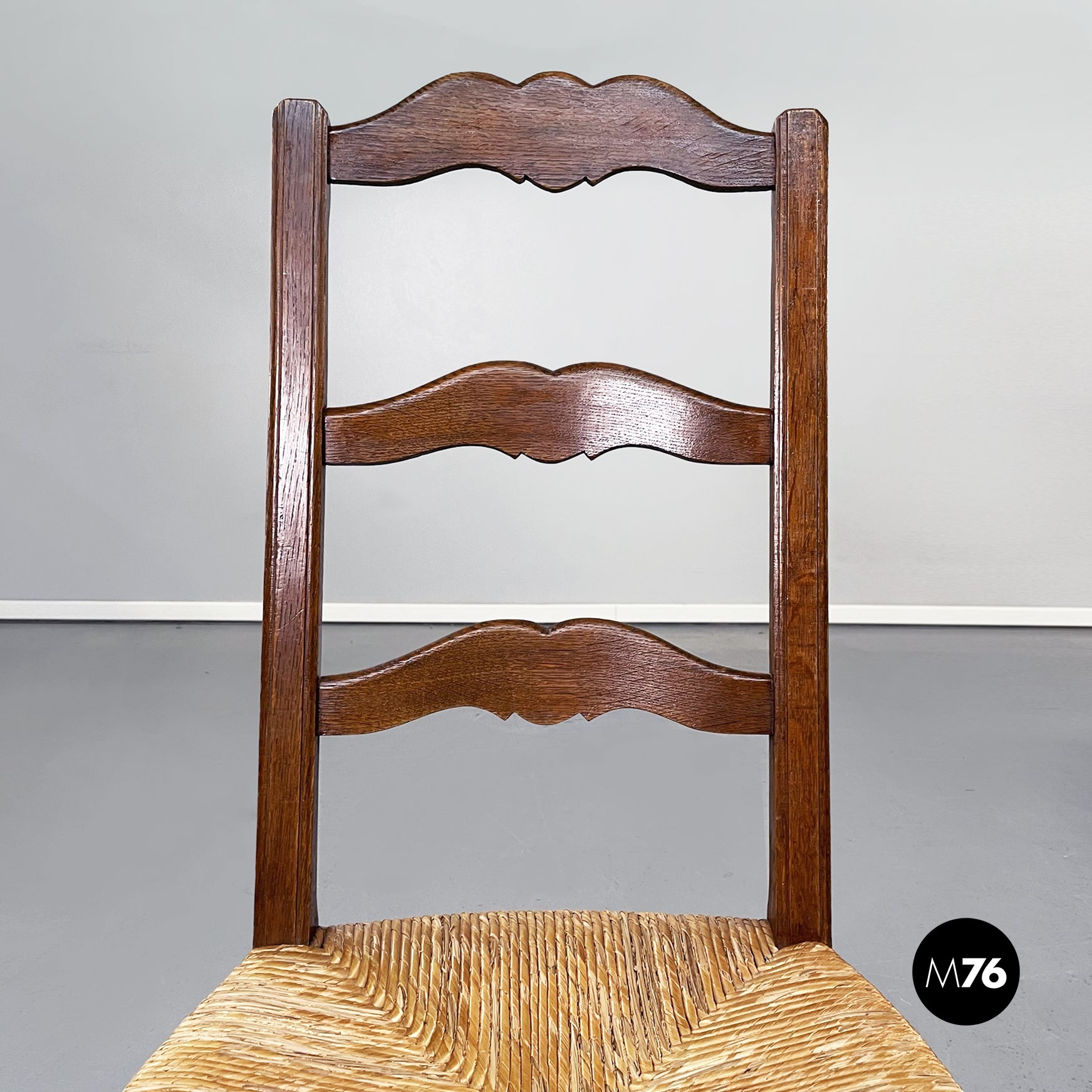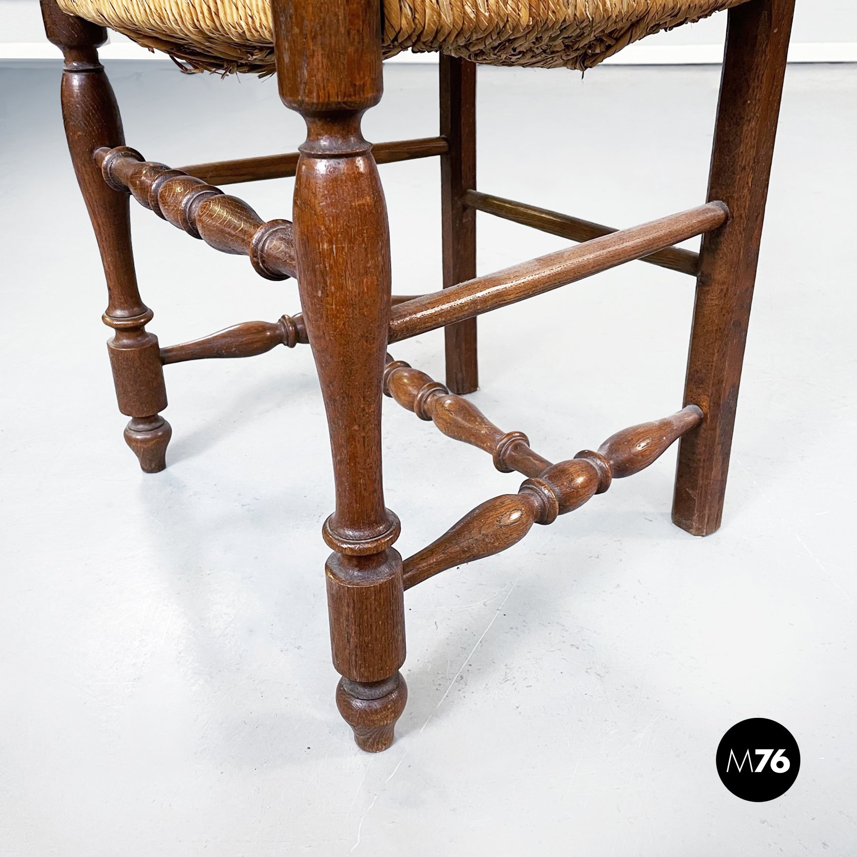 Set di sei sedie con seduta quadrata in paglia e struttura in legno finemente lavorata.