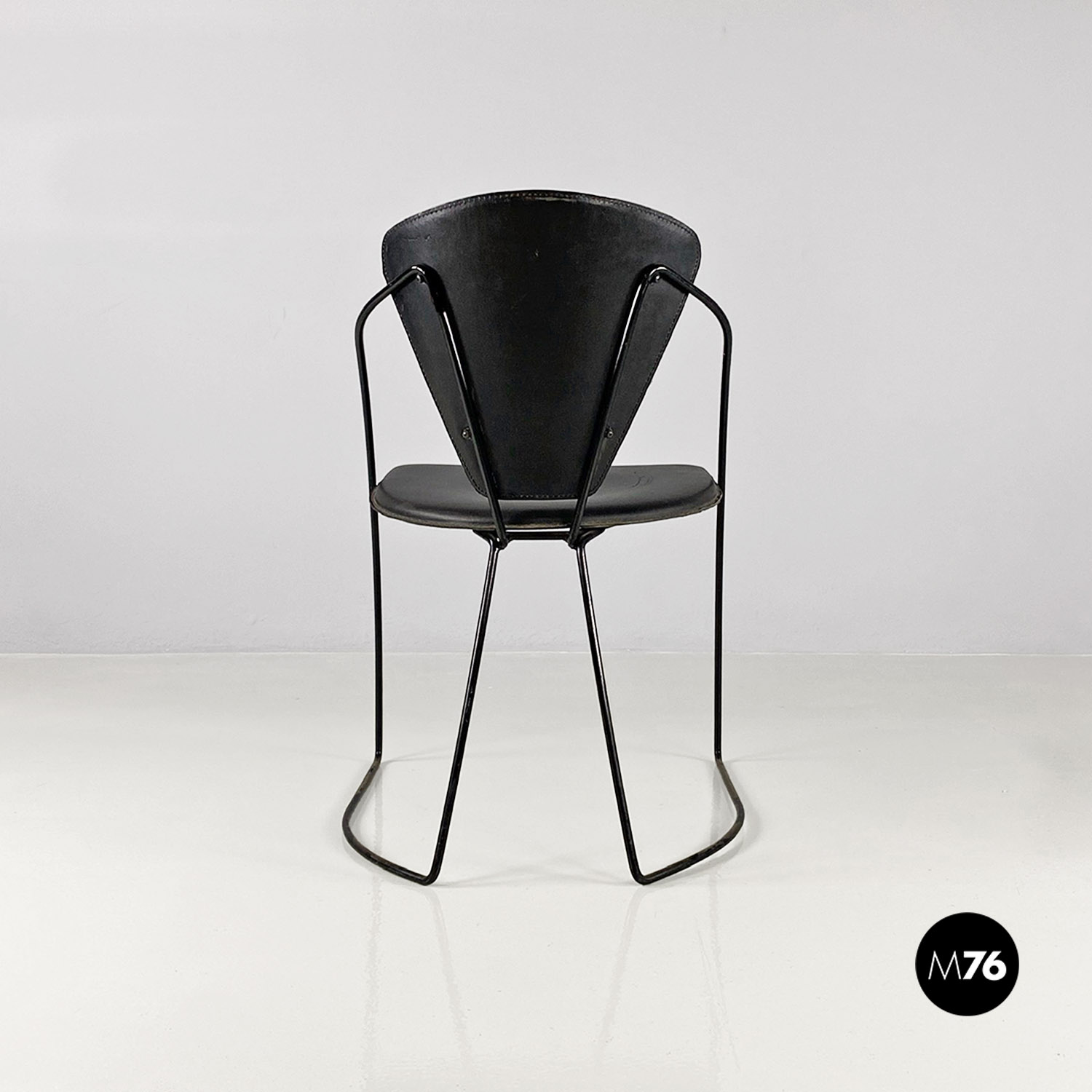 Set di quattro sedie con struttura in tondino di metallo verniciato nero e seduta e schienale in pelle nera originale.
