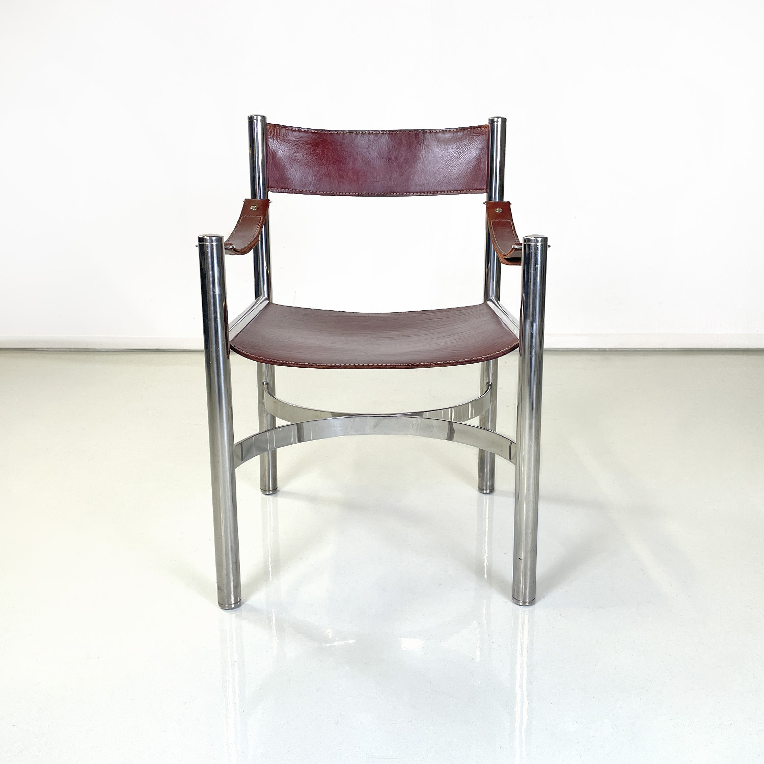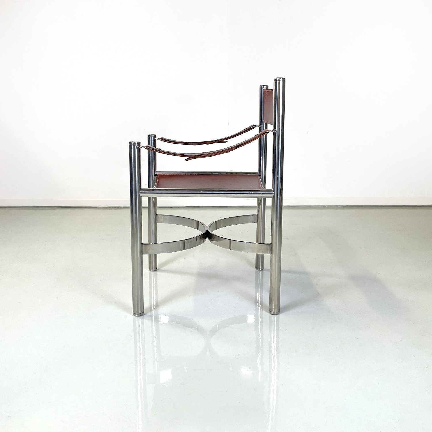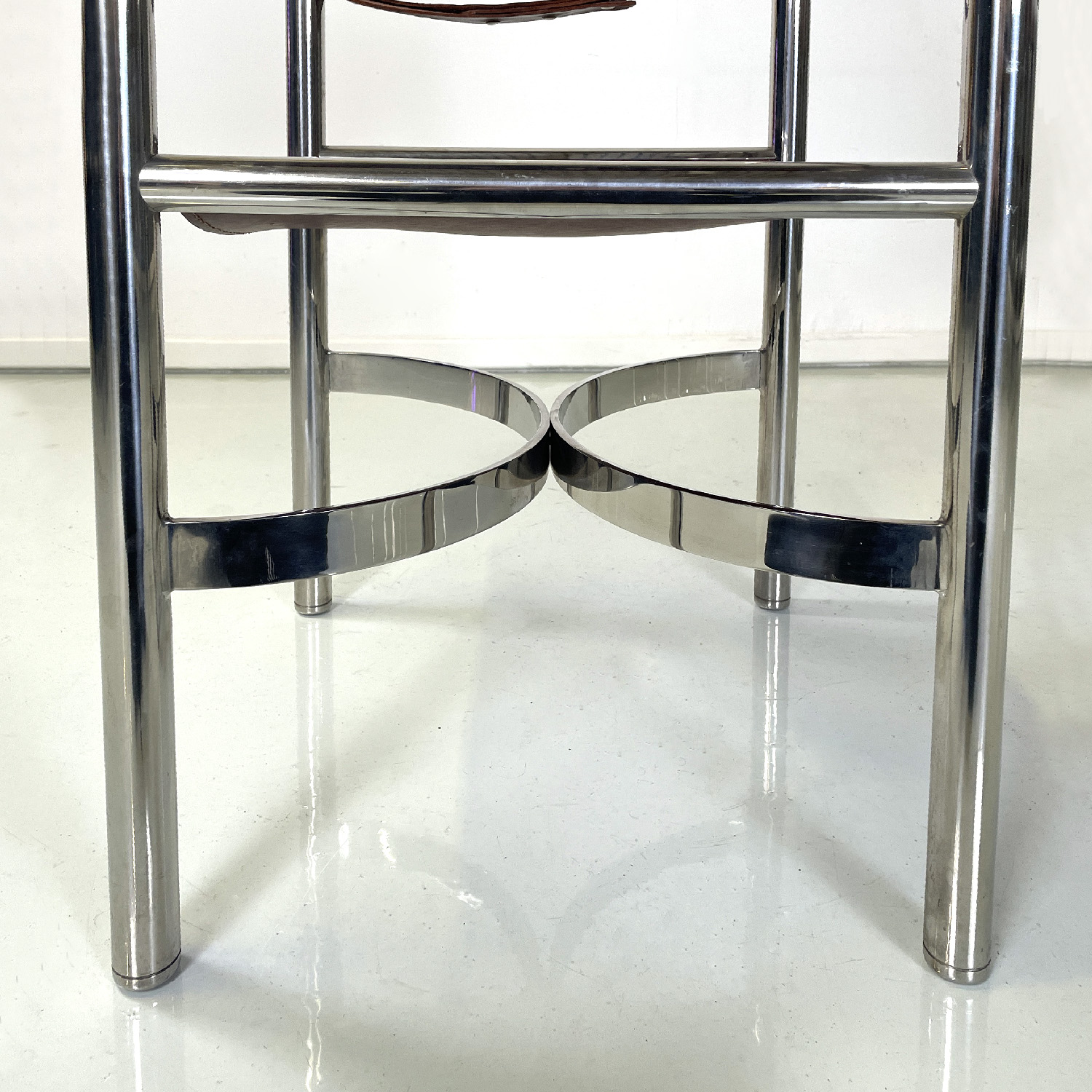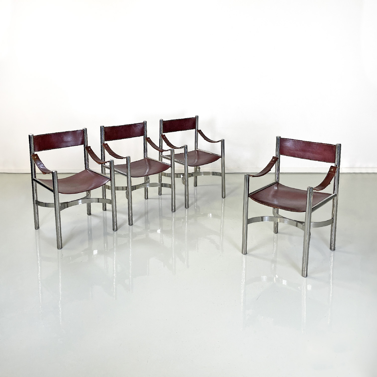 Set of four chairs with rectangular base. The seat and back are in brown leather with white stitching the armrests are made of a band of the same brown leather and with the same stitching. The structure is in tubular chromed steel the four legs are joined by two metal semicircles with a rectangular section.