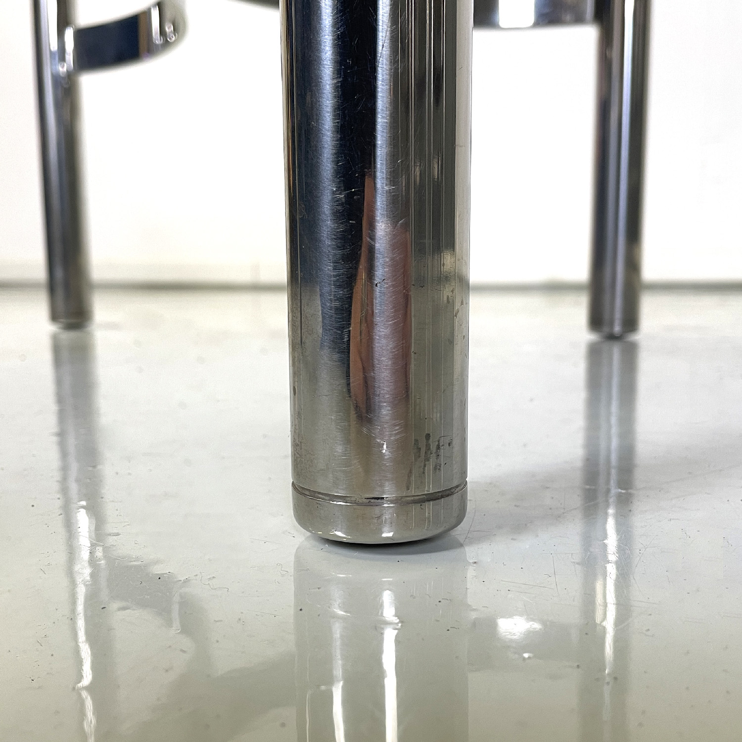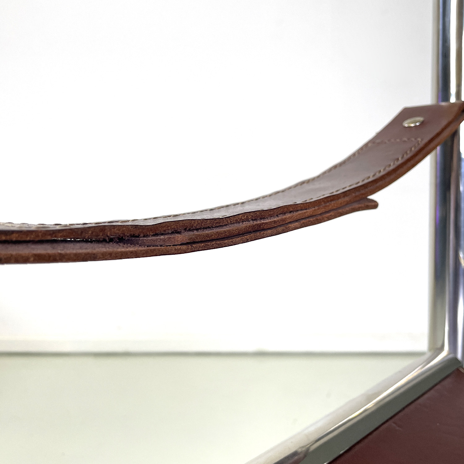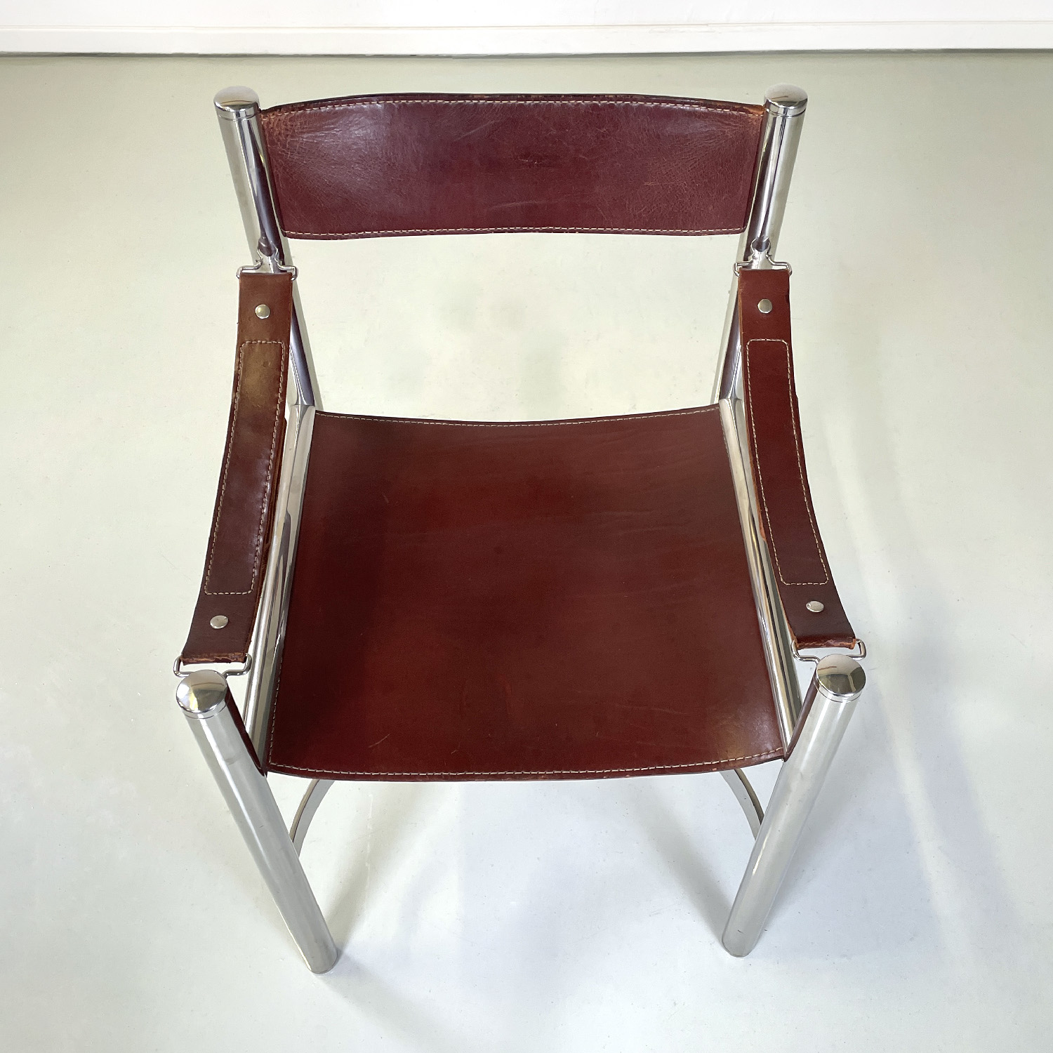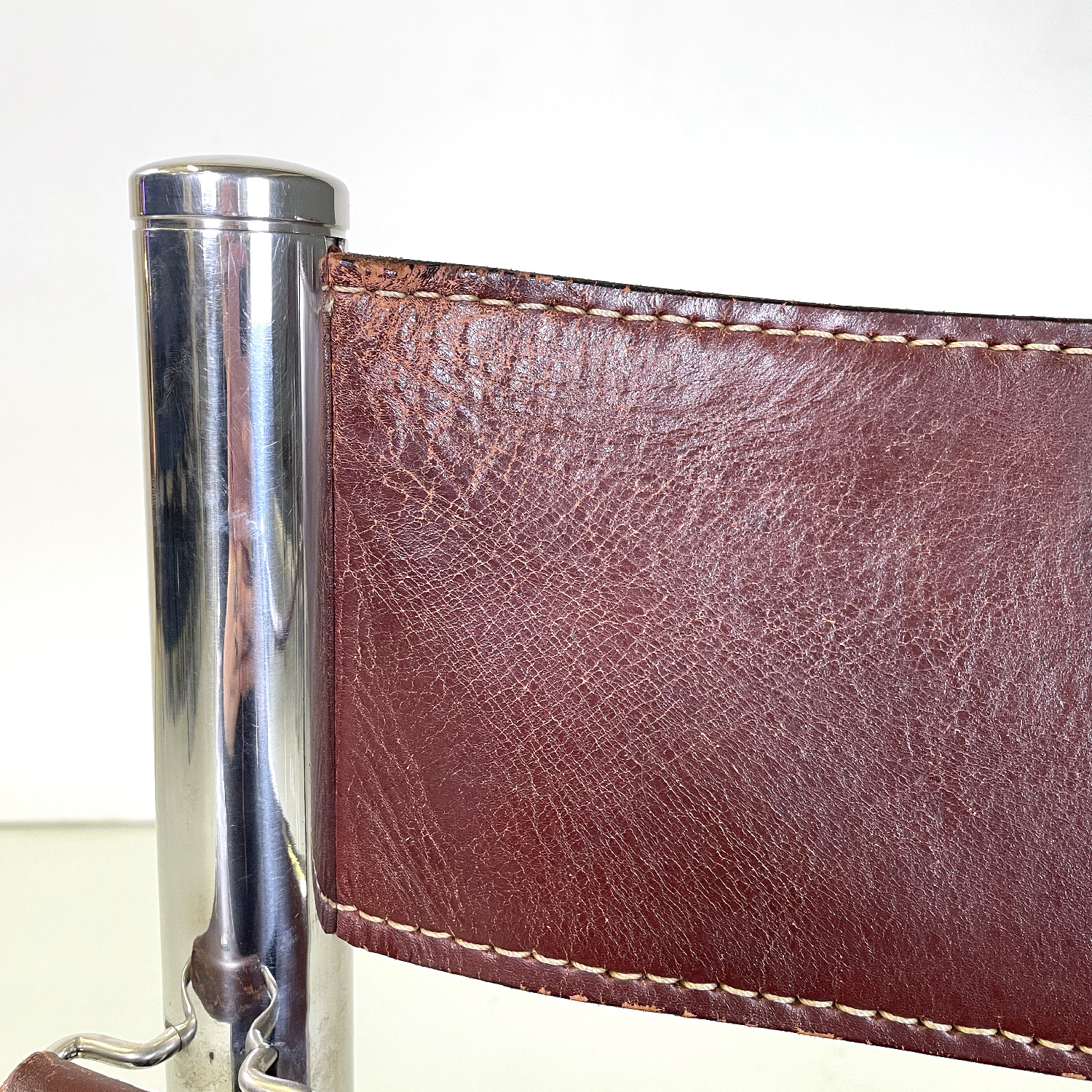 Set of four chairs with rectangular base. The seat and back are in brown leather with white stitching the armrests are made of a band of the same brown leather and with the same stitching. The structure is in tubular chromed steel the four legs are joined by two metal semicircles with a rectangular section.