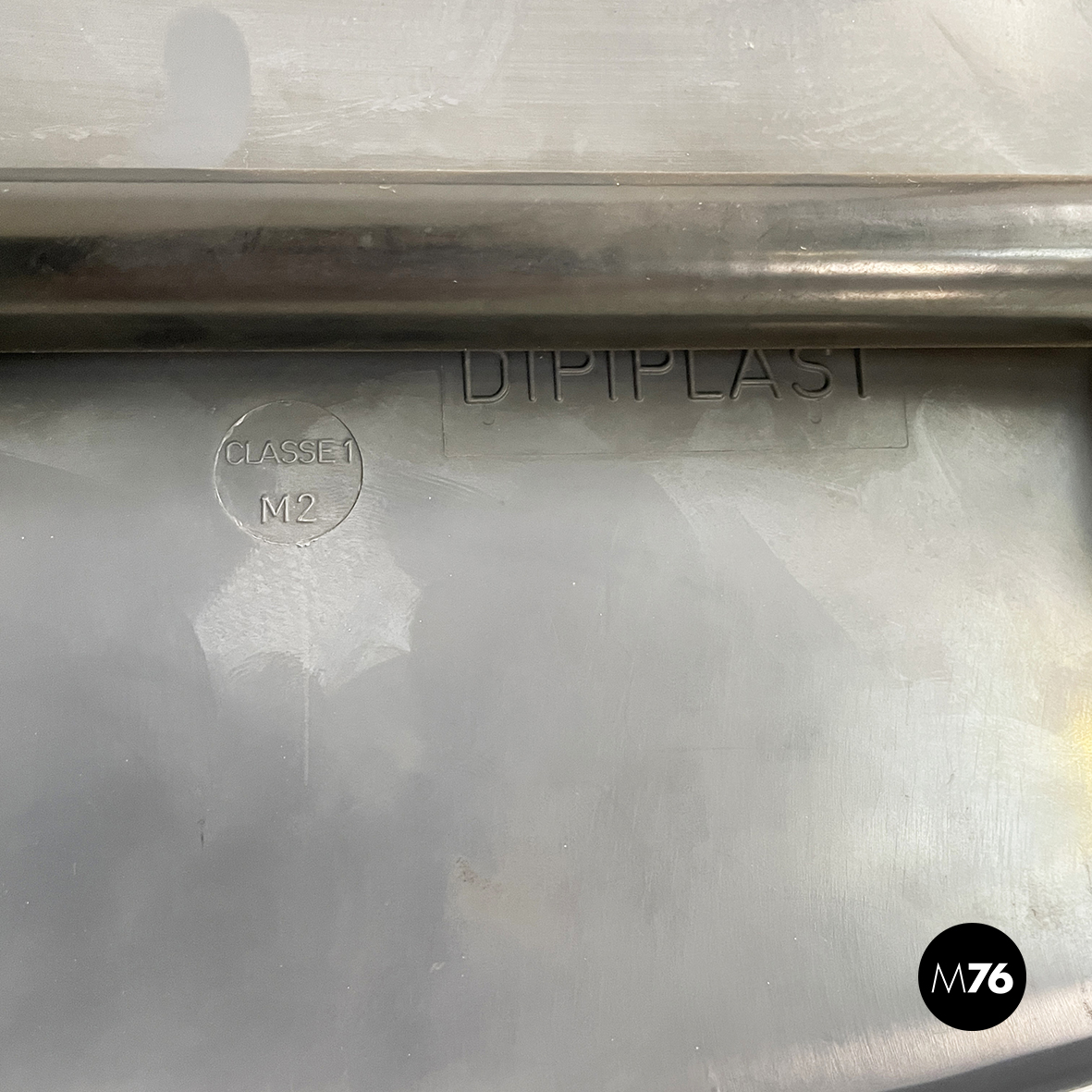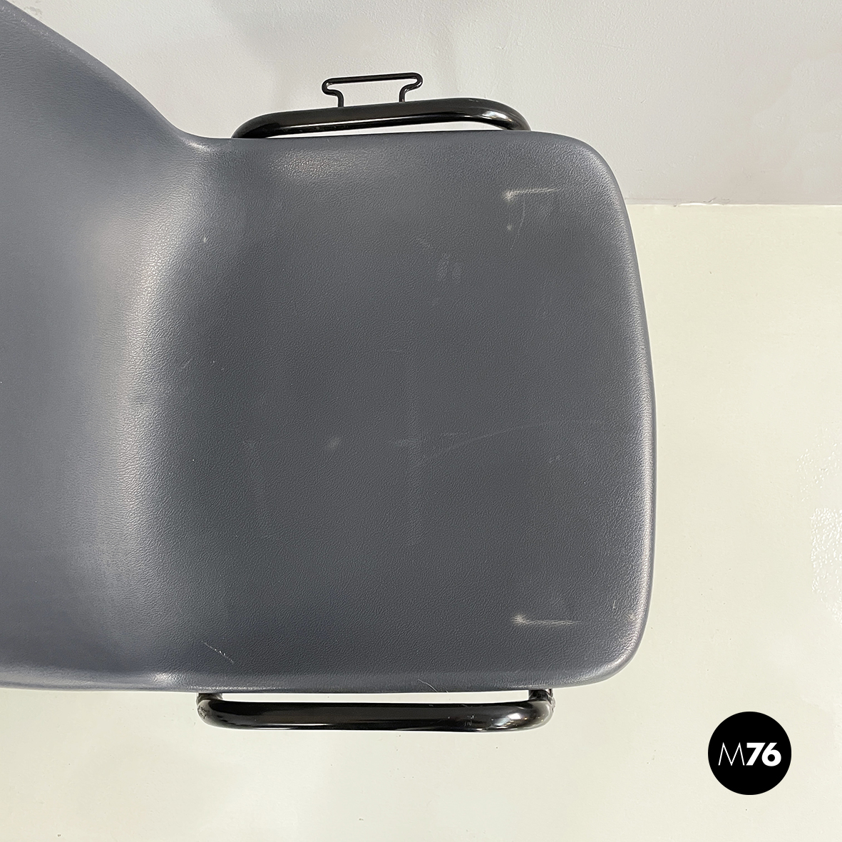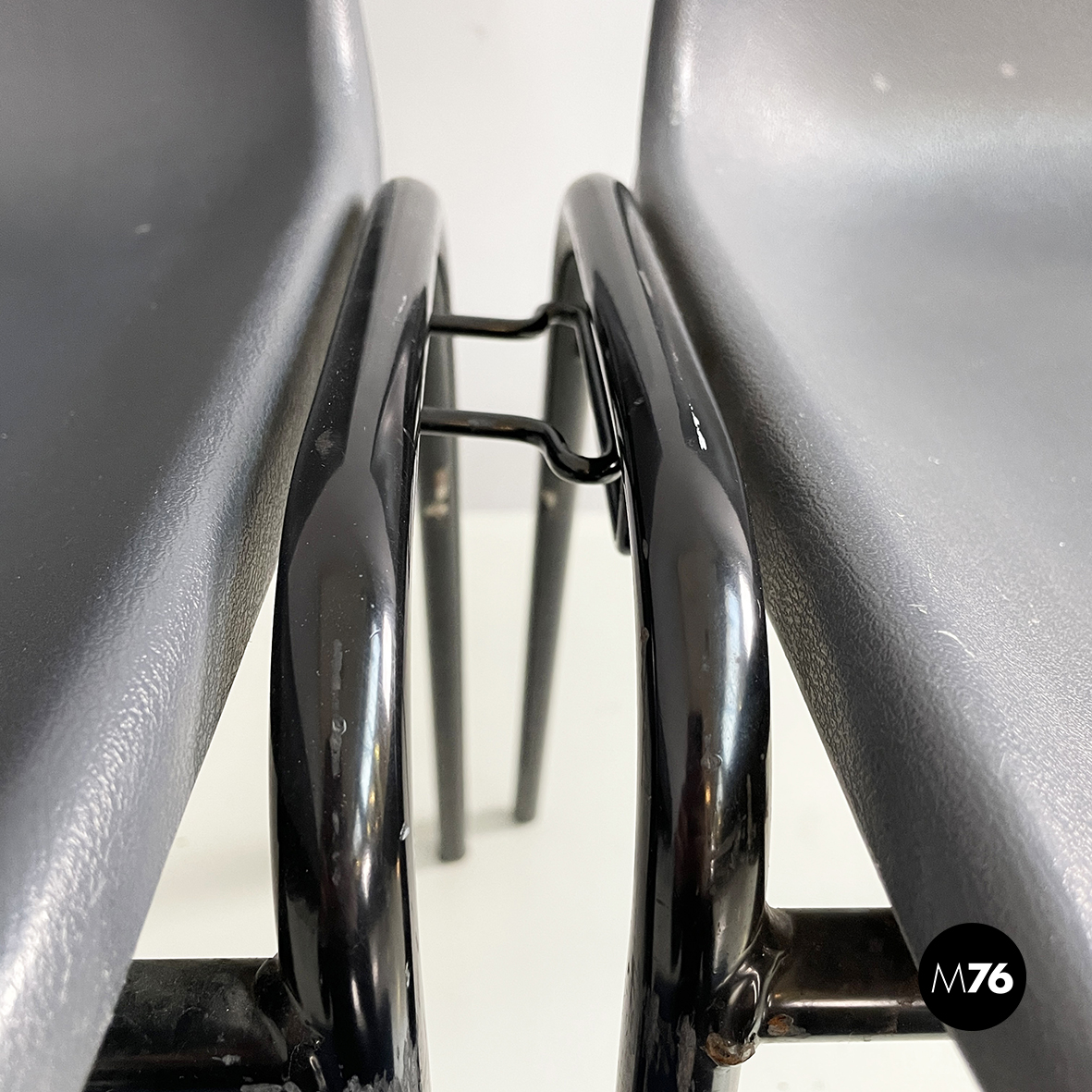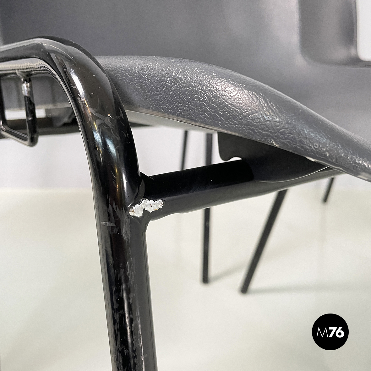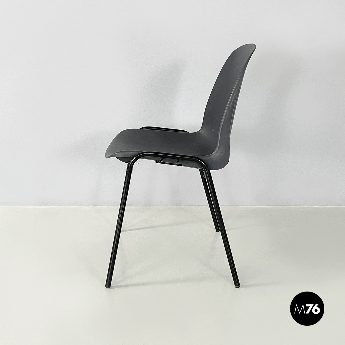 Set di dodici sedie con monoscocca curvata in plastica grigia. Le zampe sono in tondino di metallo verniciato nero. Sui due lati sono presenti delle parti in tondino di metallo verniciato nero che permettono alle sedie di essere posizionate una a fianco all’altra. Impilabili.